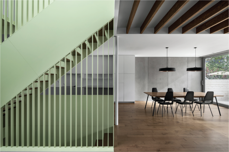 A wonderful balance is created here between the elements’ sobriety and their sophistication. The open plan organization promotes orientation in space. Its subdivision creates a path rhythmically punctuated by wooden arches. Noble materials structure the volumes with refinement.