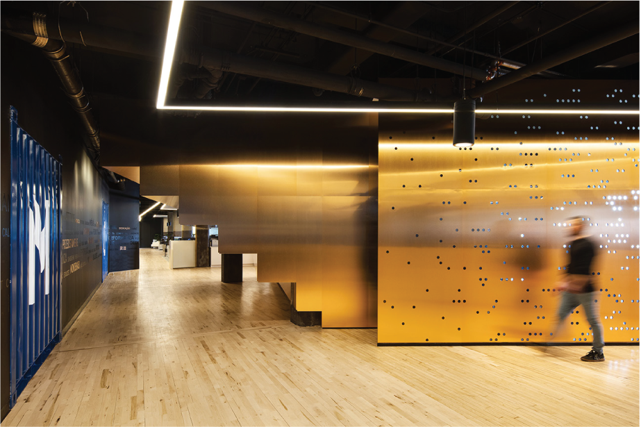 Practical and playful, the layout is inspired by the world of video games that the company makes. Like a village, the space is organized along alleys and small squares. The various volumes put forward materials that serve as landmarks and delimit the functions.
