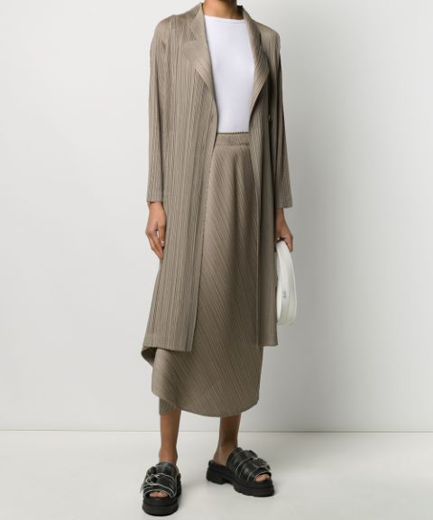 Single button pleated light coat and Pleated wrap style skirt from Pleats Please By Issey Miyake – Available on www.farfetch.com