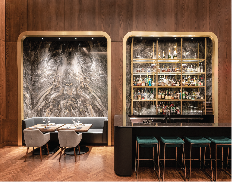 To create a contrast to the kitchen’s dark coating and showcase the plates through the reflection of light, the kitchen countertops are covered in slabs of pure white Sapien Stone Uni Ice with a glossy finish. All in all, it is a concert of majestic materials granting the restaurant its magnificence and singularity.