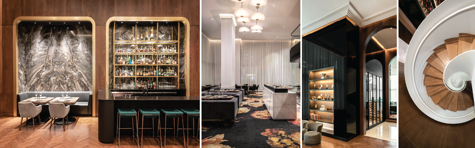 Next is the antechamber, serving as a transition point between the bistro and the dining room, housing a cellar spread over two floors and a circular staircase granting ac- cess to the mezzanine.