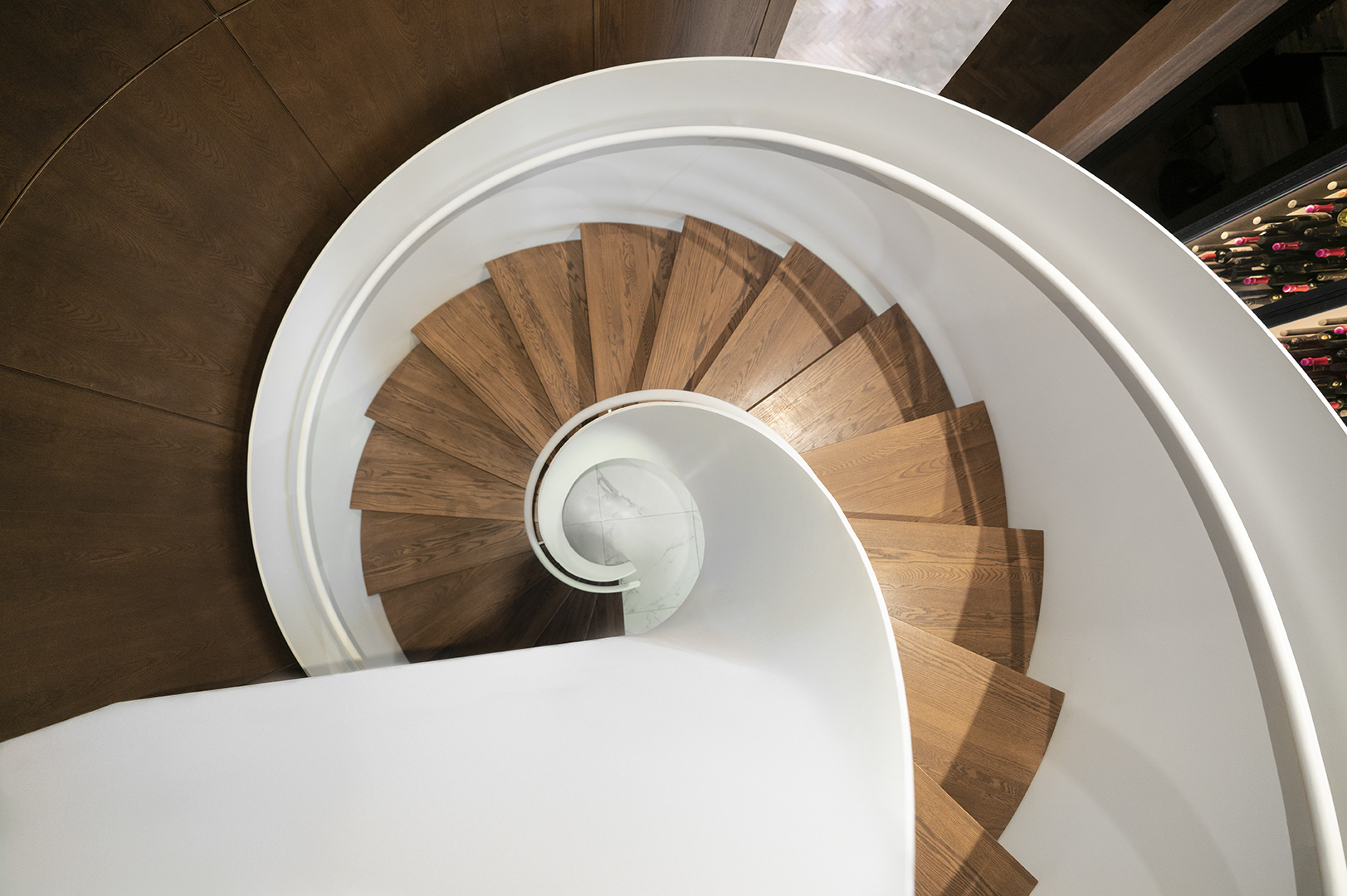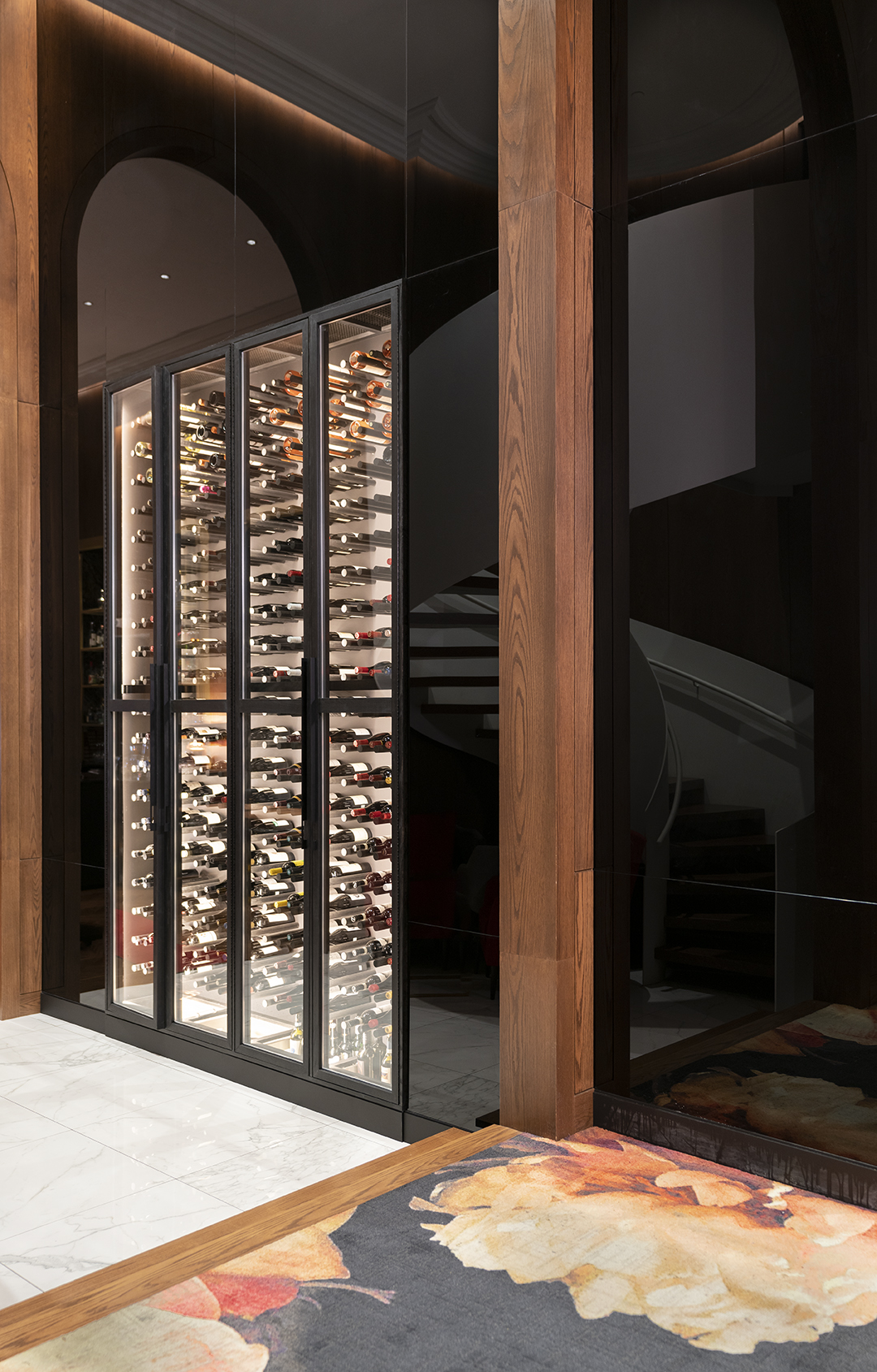 The 12-foot-high wall of Orobico Grigio marble is a book matched installation. With its unique veins, its rich colours and singular forms, it is fascinating.