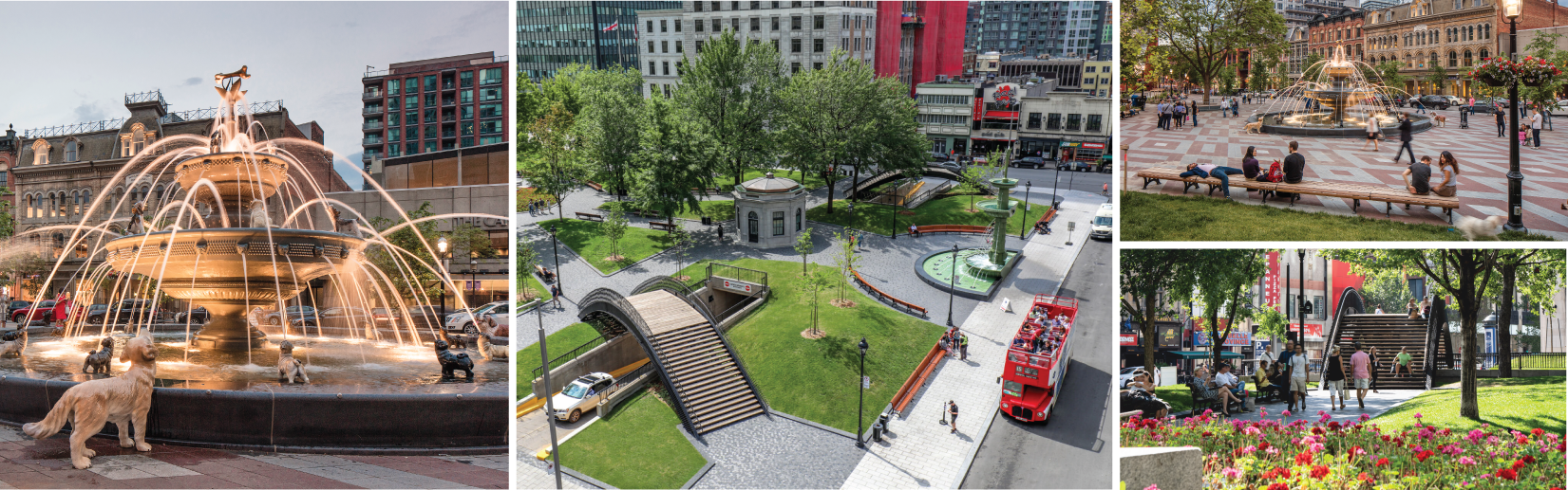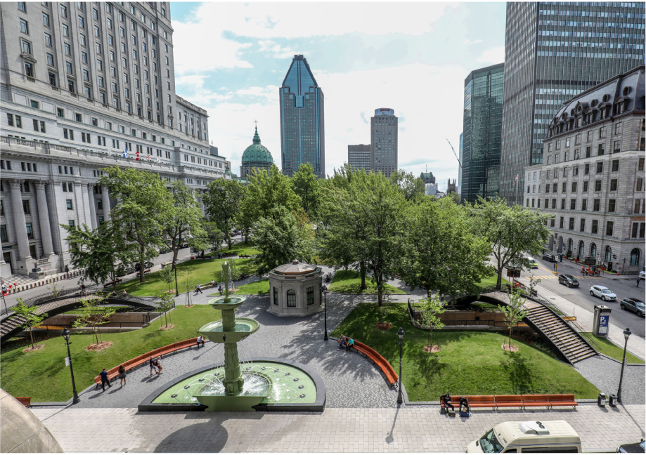 The square has returned to its original cruciform layout while achieving greater proximity to Sainte-Catherine St., whose passersby are lured to the wonderful green space.