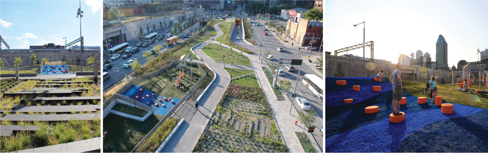 Add to that the hipness and attractiveness of the project, the masterful combination of azur grass carpeting and orange play modules, as well as the park’s innovative approach to art integration and find yourself before a fun-filled playground with a cause: the positive environmental impact it holds for Montreal.