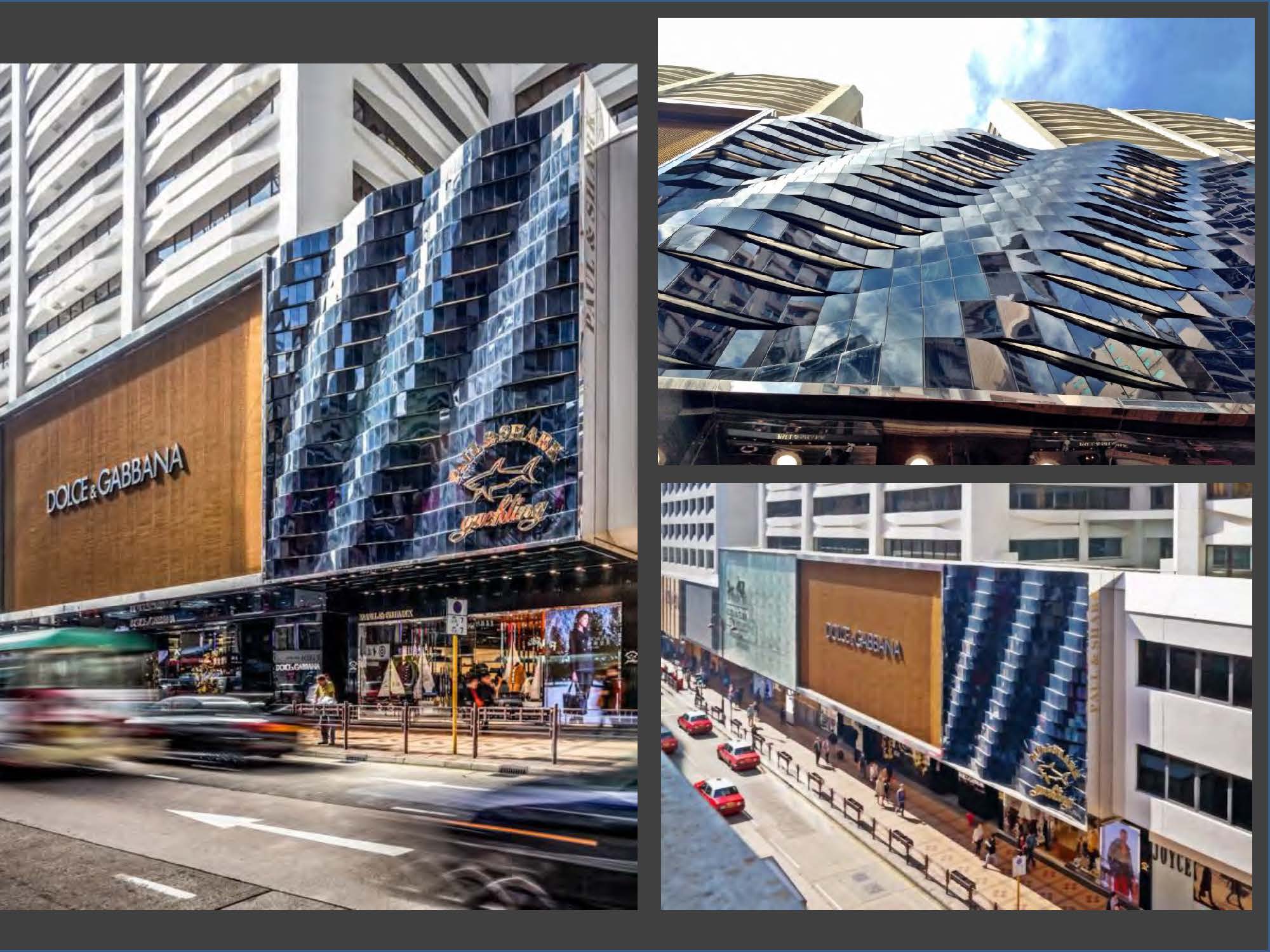 Canton Road is one of Asia’s biggest luxury brand streets, the facade is inspired by the waters surrounding the port city of Hong Kong and travel, transcending the Paul & Shark branding. Like waves, the metal facades undulate and create a unique game of fragmented reflection.