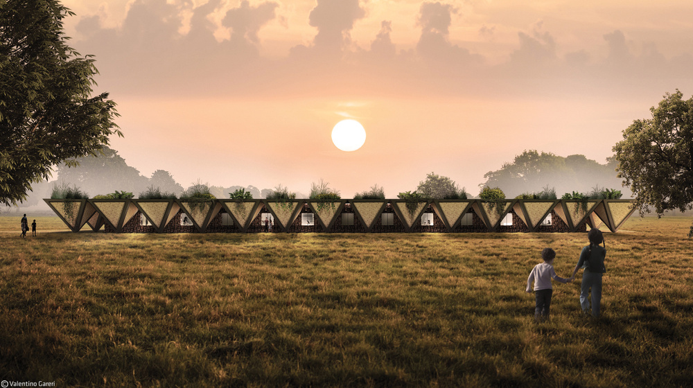 Each modular element contains a planter-box where vegetation can grow and spread out on top of the roof providing a sustainable sunshade and reducing the building’s heat. Photovoltaic and solar panels can be added atop each triangular module. These modular roofs also serve to collect rain water. Under each planter-box there is a cubic-metre-size water tank space to accommodate traditional local tanks.