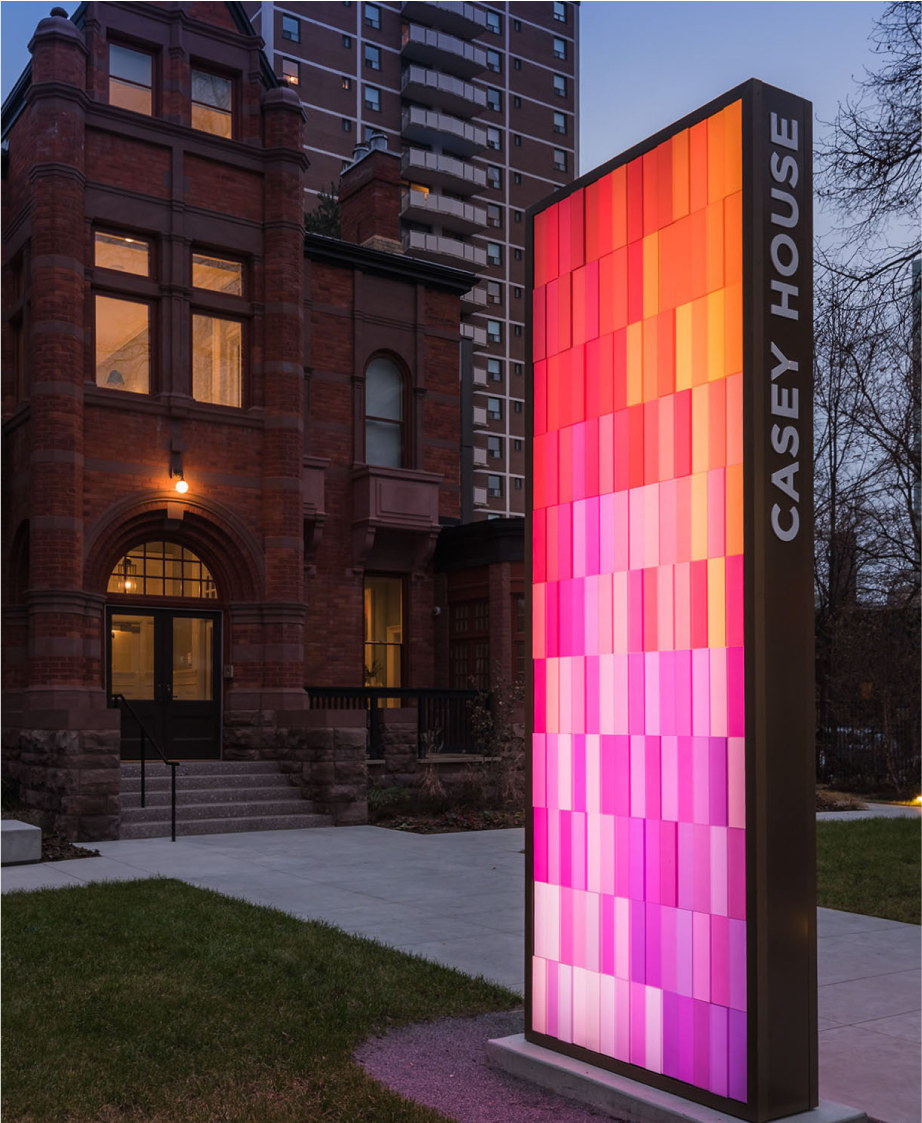 Crédit photo : Gerald Querubin. Casey House is a HIV-hospice. The exceptional passionate care that nurses provide to HIV Aids patients is outstanding. Instead of having an institutional looking pylon to identify the place, I developed a concept that is based on the passion and warmth of the caregivers. A pylon completely made out of a grid of oblongs in red hues is expressing exactly that.