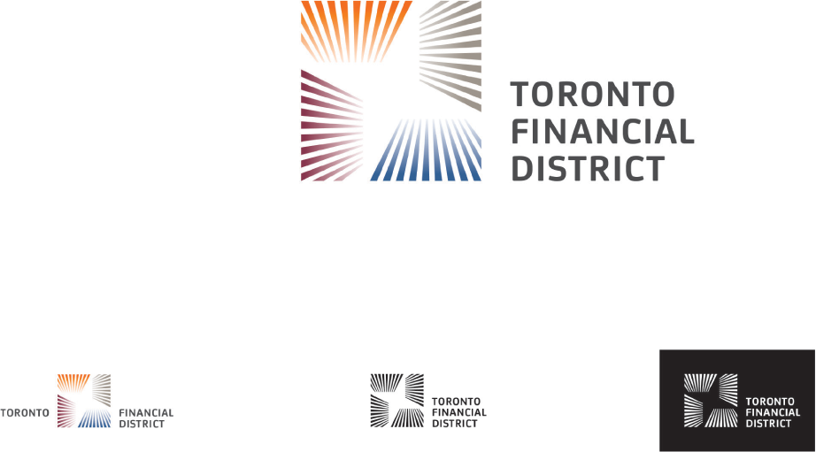 This brand represents the Financial District BIA in Downtown Toronto. The heart of the district is at the crossing of Bay and King St. Looking up at that crossing you see 4 banking towers. The logo represents this notion of 4 towers reaching into the sky. However, you not only see the lines of the towers but also the negative space of a star in-between. The colours signal that this is no longer an old boys club, but a very diverse group of professionals.