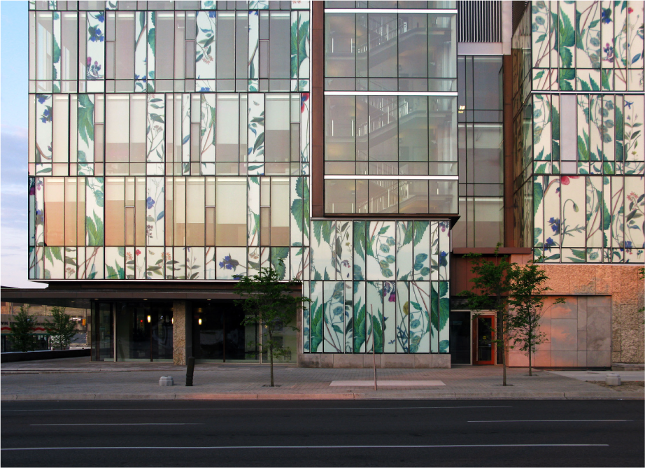 The University of Waterloo School of Pharmacy in Kitchener, Ont. is focused on medicine based on natural/flower ingredients. This idea of the school is visualized right on the curtain wall all around the building. By sourcing medicinal flowers and arranging them as film prints baked into two glass layers, the façade becomes expressionistic and interesting.