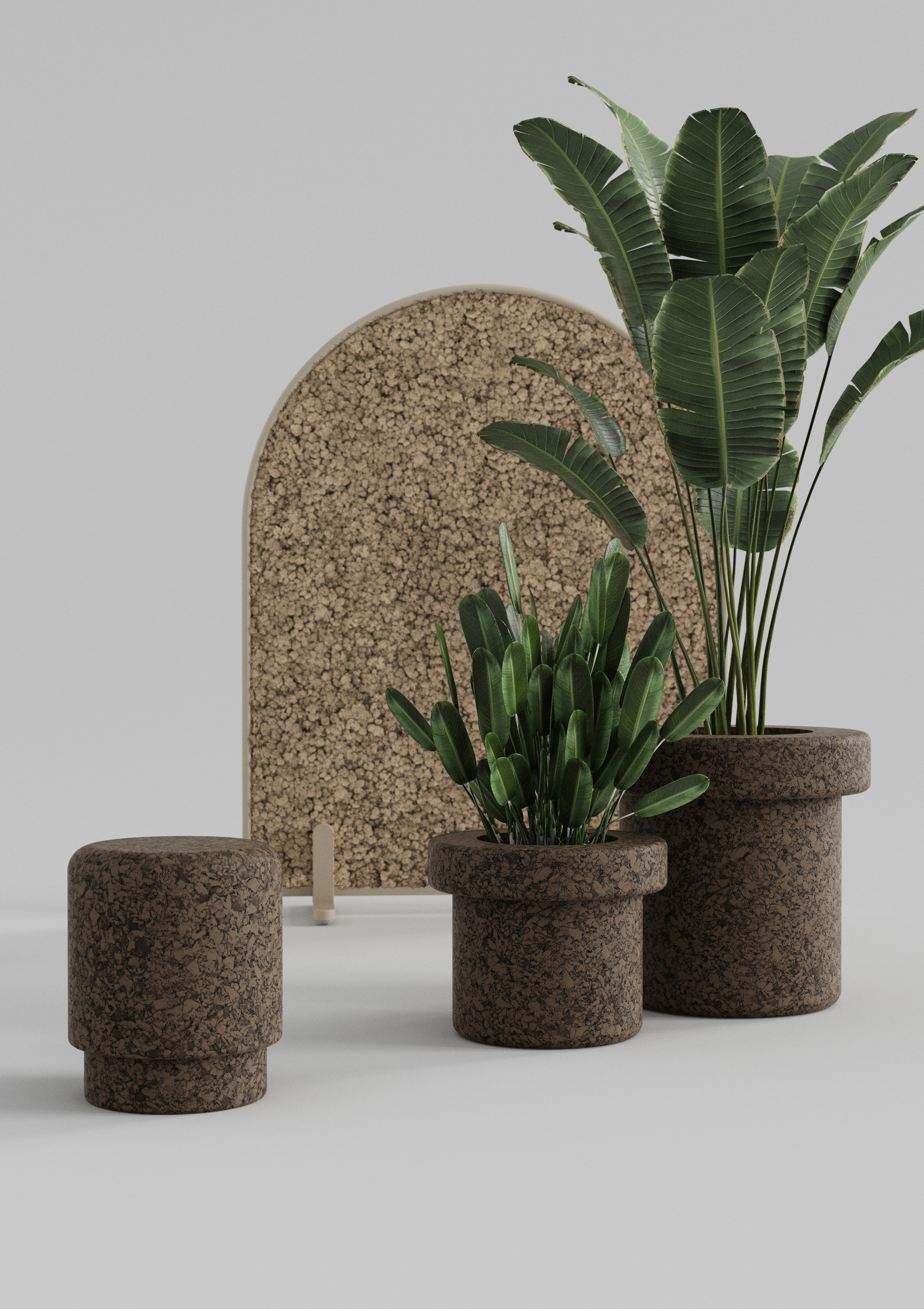 MARIO Pouf & Planters in expanded cork and MODULOR Divider designed for GREENMOOD