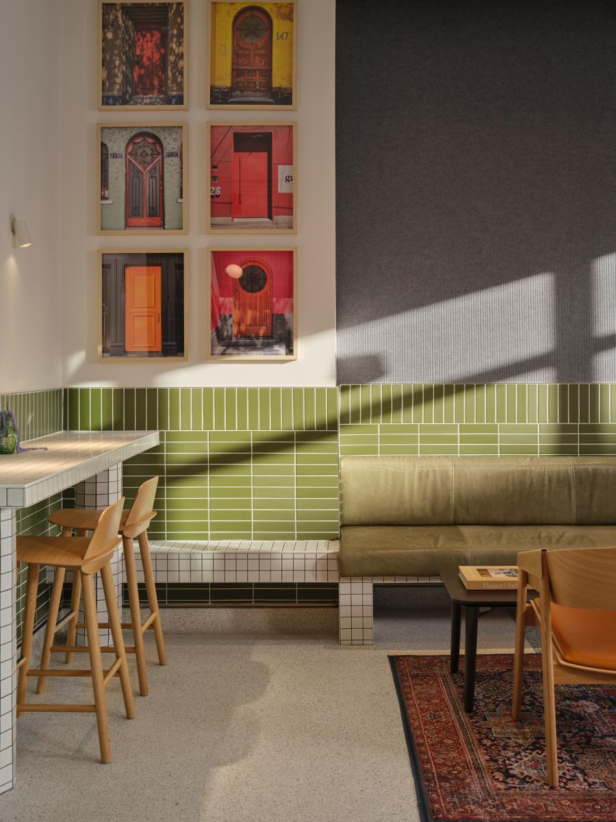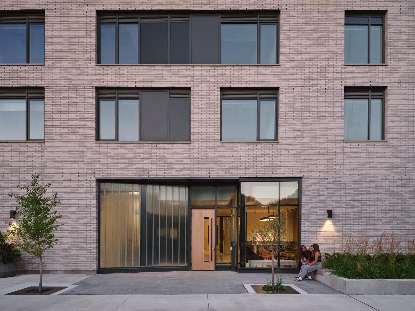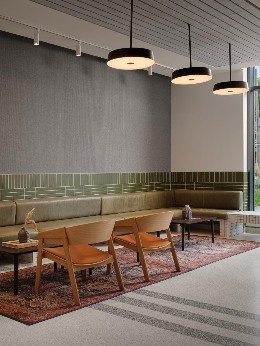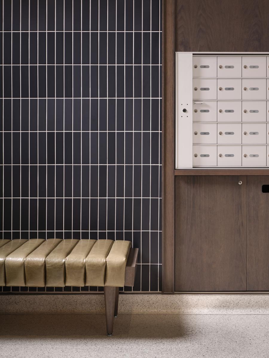 Sitting at the heart of Toronto’s Leslieville community, the six-storey building takes its design cues, inside and out, from the surrounding fabric and industrial history. Clad in different shades of brick to mesh with the immediate context while communicating a subtle playfulness, the massing respects the four-storey datum on Queen Street East, stepping back at the fifth and sixth storeys to minimize impact and create visual coherence. The interiors scheme, including the lobby, corridors, amenity spaces, and units, was inspired by the area’s manufacturing legacy, emphasizing details, colour, and craftsmanship. For example, our lobby design features custom terrazzo with distinctive metal accents and inlays as well as eclectic tile layouts consisting of different patterns and colours that honour the vibrancy of the neighbourhood. The mailboxes are enclosed in a finely detailed smoked oak cabinet that sits next to a custom leather bench.