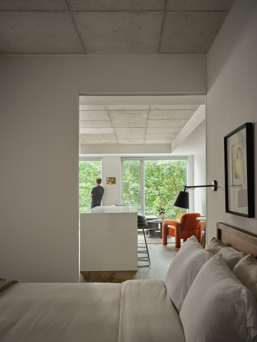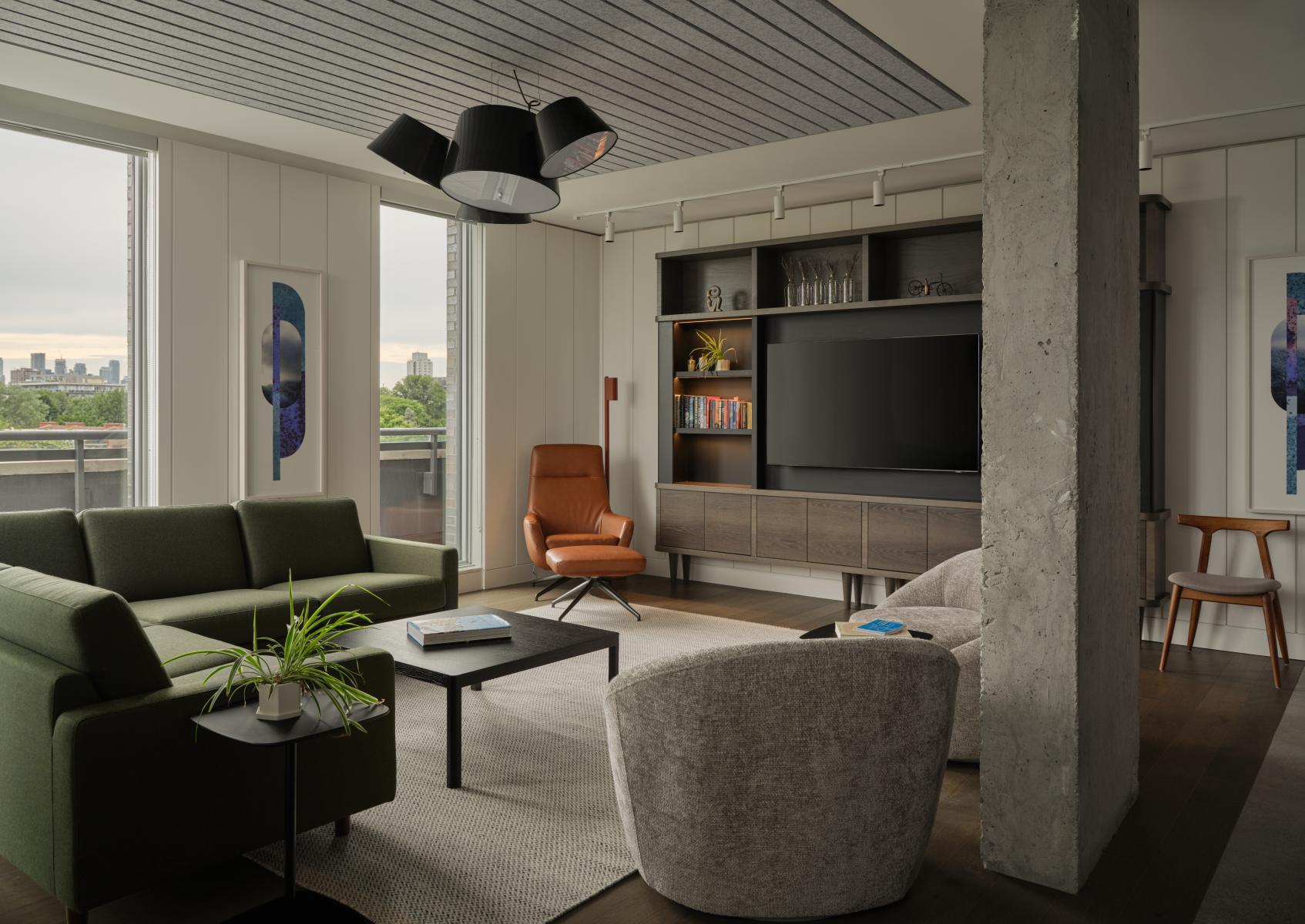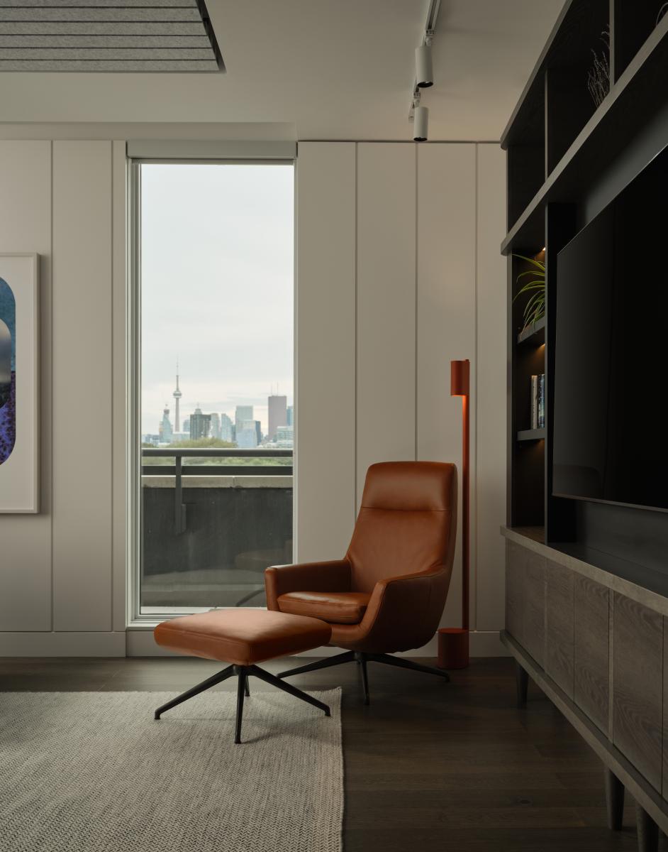 Opening out directly to the rooftop terrace with expansive views of Lake Ontario and the city’s skyline, the tenant lounge at 115 Larchmount was conceived as an intimate and uplifting gathering space. With a cozy area for socializing, reading, or watching a movie, the lounge features bespoke touches, including a tailor-made media unit and custom wall paneling, as well as a kitchen and dining room that accommodate larger get-togethers. Every intervention across the communal components of the building was deeply considered in an effort to bring tenants both ease and comfort and to enliven their encounters with their everyday surroundings.