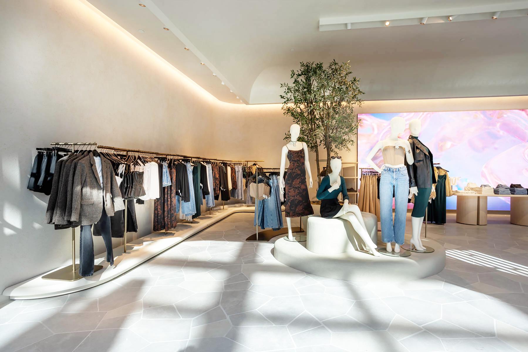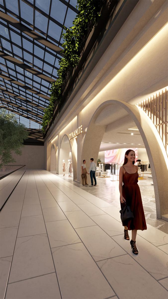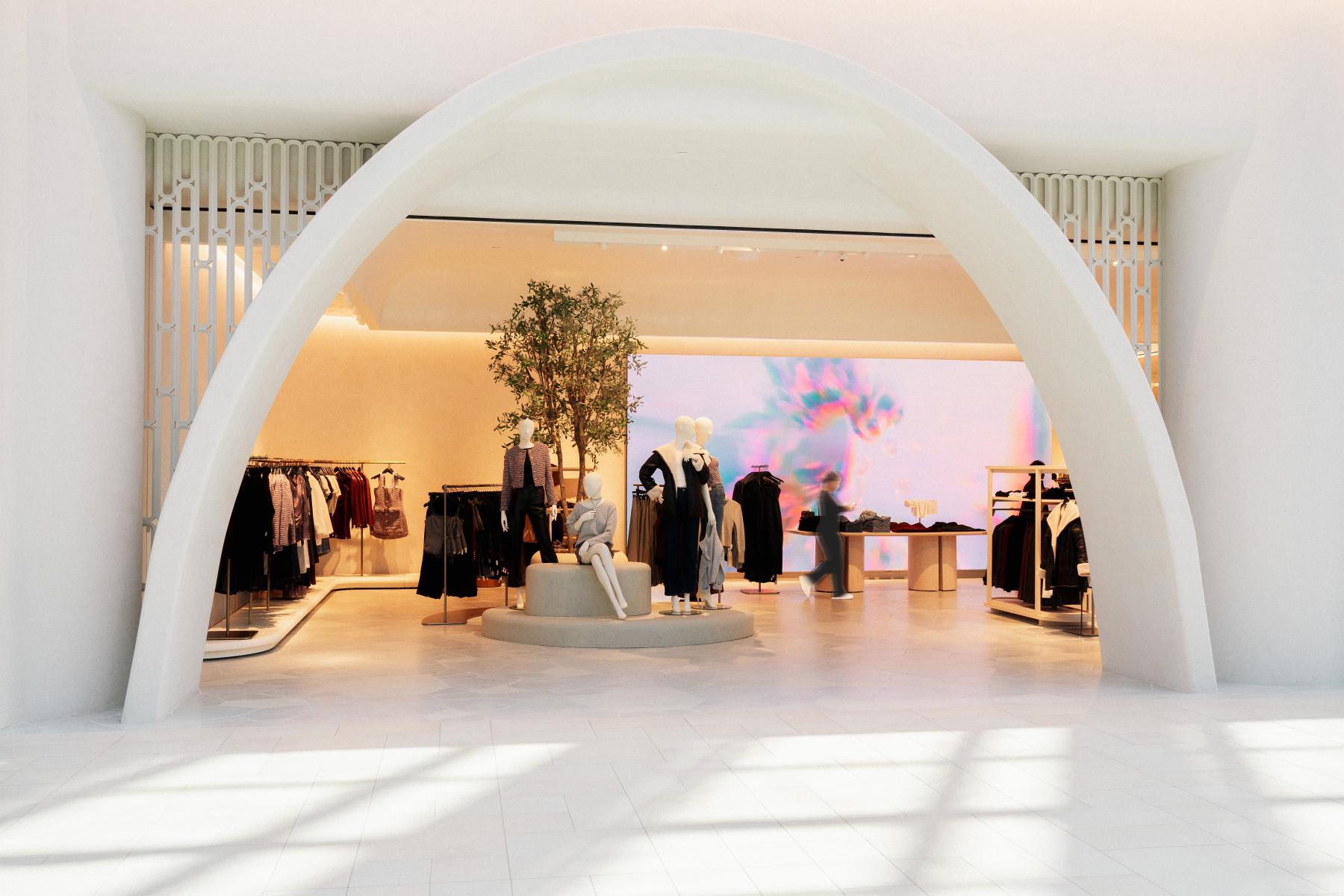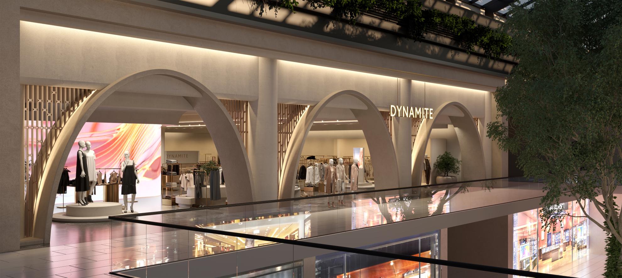 Pushed by creativity and innovation, the Dynamite brand has just opened an 8,000 square foot flagship store in the Royalmount District, one of Canada's first 100% carbon-neutral mixed-use developments. The flagship store offers a unique experience. The new concept is built around strong guidelines and a monumental facade. The concept reveals a spectacular entrance, intimate sub-spaces allowing for the organization of collections, and zenith lighting that enhances the store's distinctive experience. The three arches on the facade smoothly guide users as they enter the store. A destination that makes our customers want to escape and where time seems suspended.