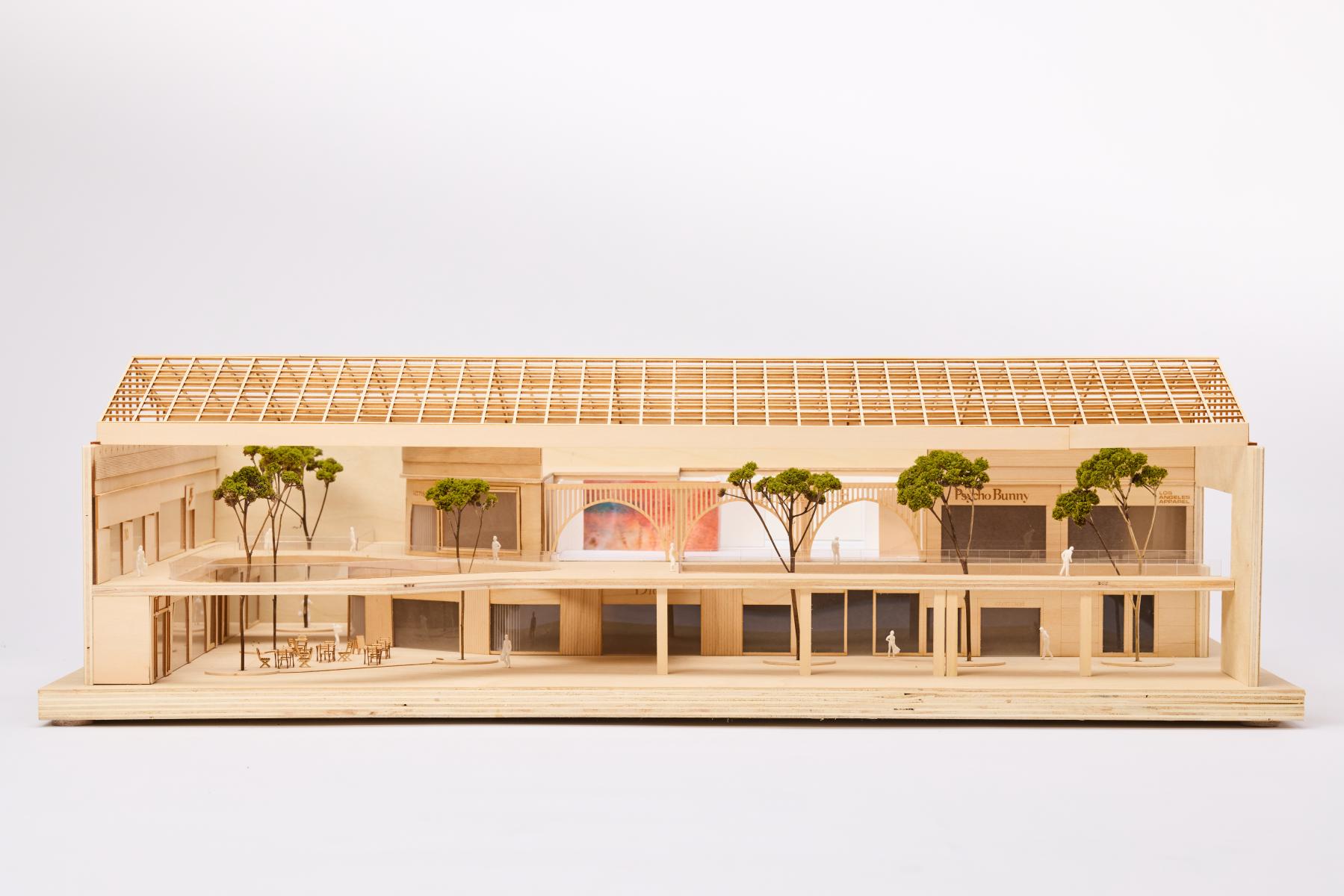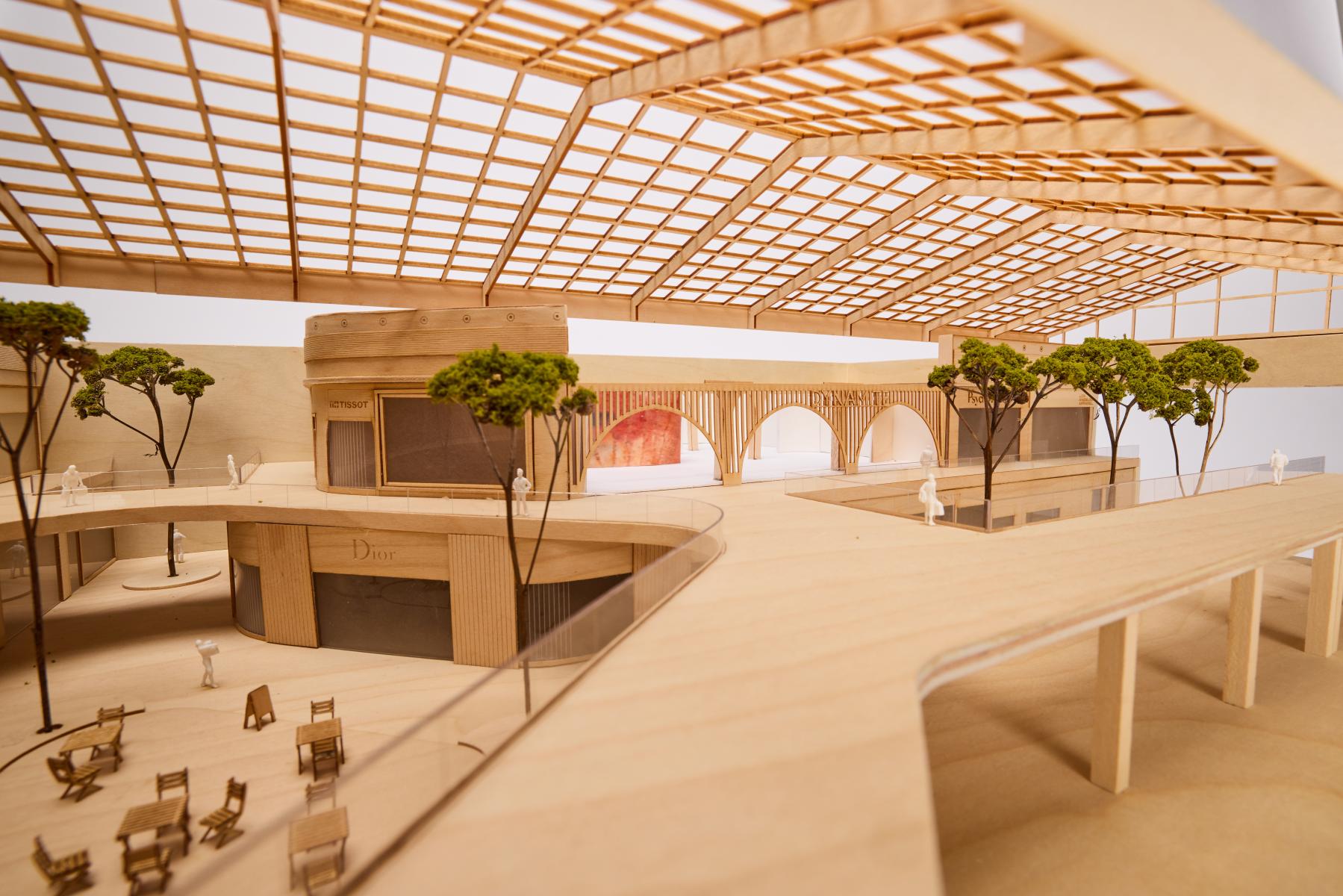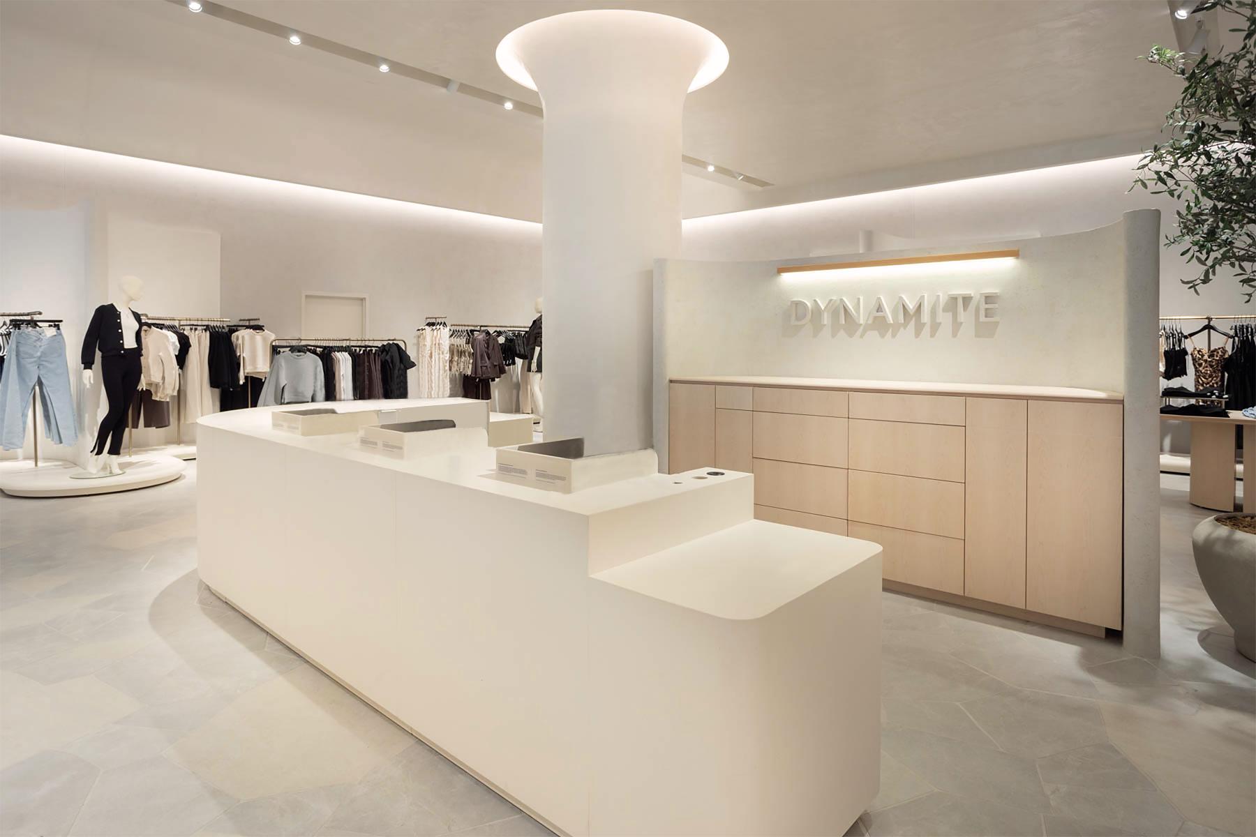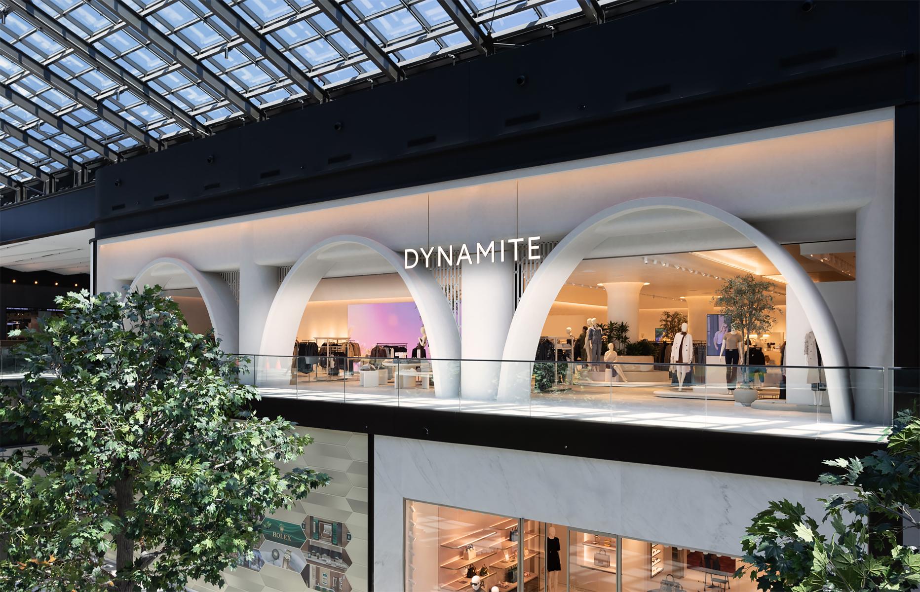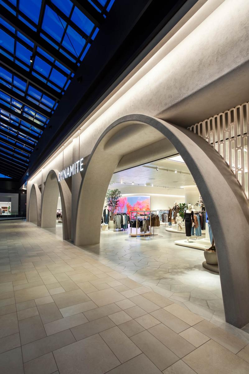 Pushed by creativity and innovation, the Dynamite brand has just opened an 8,000 square foot flagship store in the Royalmount District, one of Canada's first 100% carbon-neutral mixed-use developments. The flagship store offers a unique experience. The new concept is built around strong guidelines and a monumental facade. The concept reveals a spectacular entrance, intimate sub-spaces allowing for the organization of collections, and zenith lighting that enhances the store's distinctive experience. The three arches on the facade smoothly guide users as they enter the store. A destination that makes our customers want to escape and where time seems suspended.