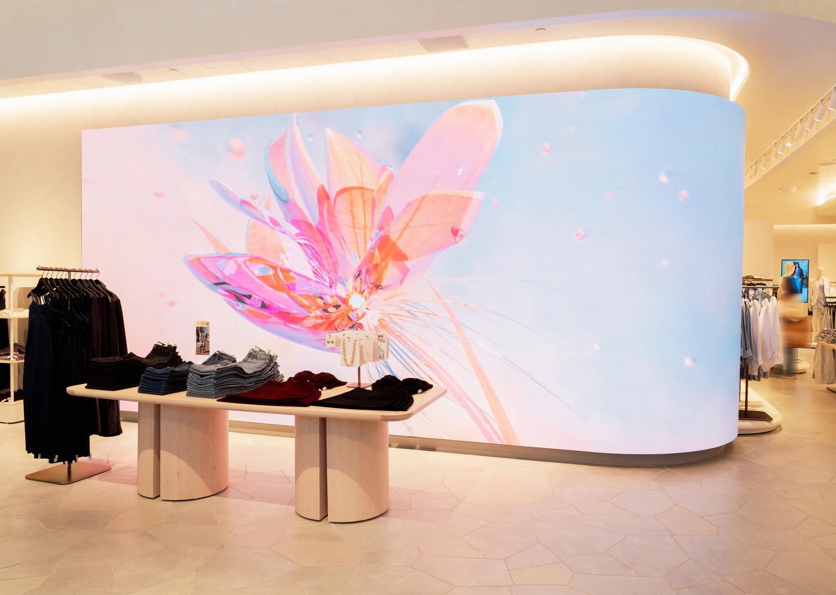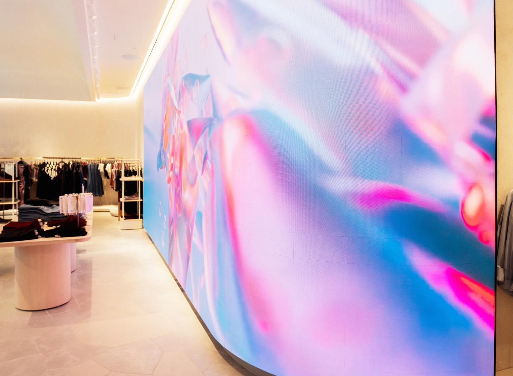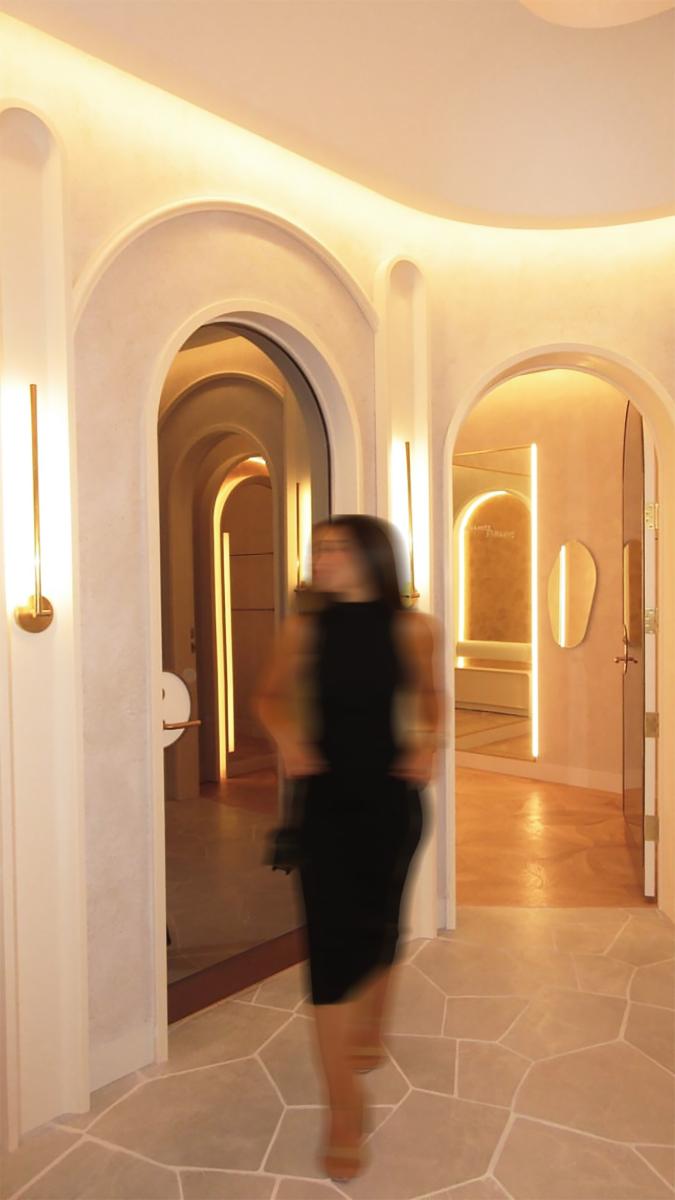 At the heart of the store's design is Future/Nature by Golmann, an abstract and fluid digital work that immerses visitors in the changing beauty of nature. Water, light, cells, and matter blend into a surreal narrative that arouses curiosity and wonder. Displayed on a curved LED screen measuring 28.3 feet by 11 feet, this artwork complements the store's architecture, guiding visitors through an experience where art and fashion converge, leaving a lasting impression. The store's architectural details, combined with the art of Bérénice Golmann, turn the space into a dreamlike destination where time seems suspended and every element inspires. From the large arches at the entrance to the use of timeless materials such as brass and stone, the store invites exploration and discovery. Intimate fitting rooms and carefully arranged presentations create an atmosphere that is both luxurious and personal. It goes beyond the simple shopping experience – it is about creating an emotional connection with the brand. The ROYALMOUNT flagship store illustrates how the integration of art, design, and technology can create an engaging commercial environment that stands out.