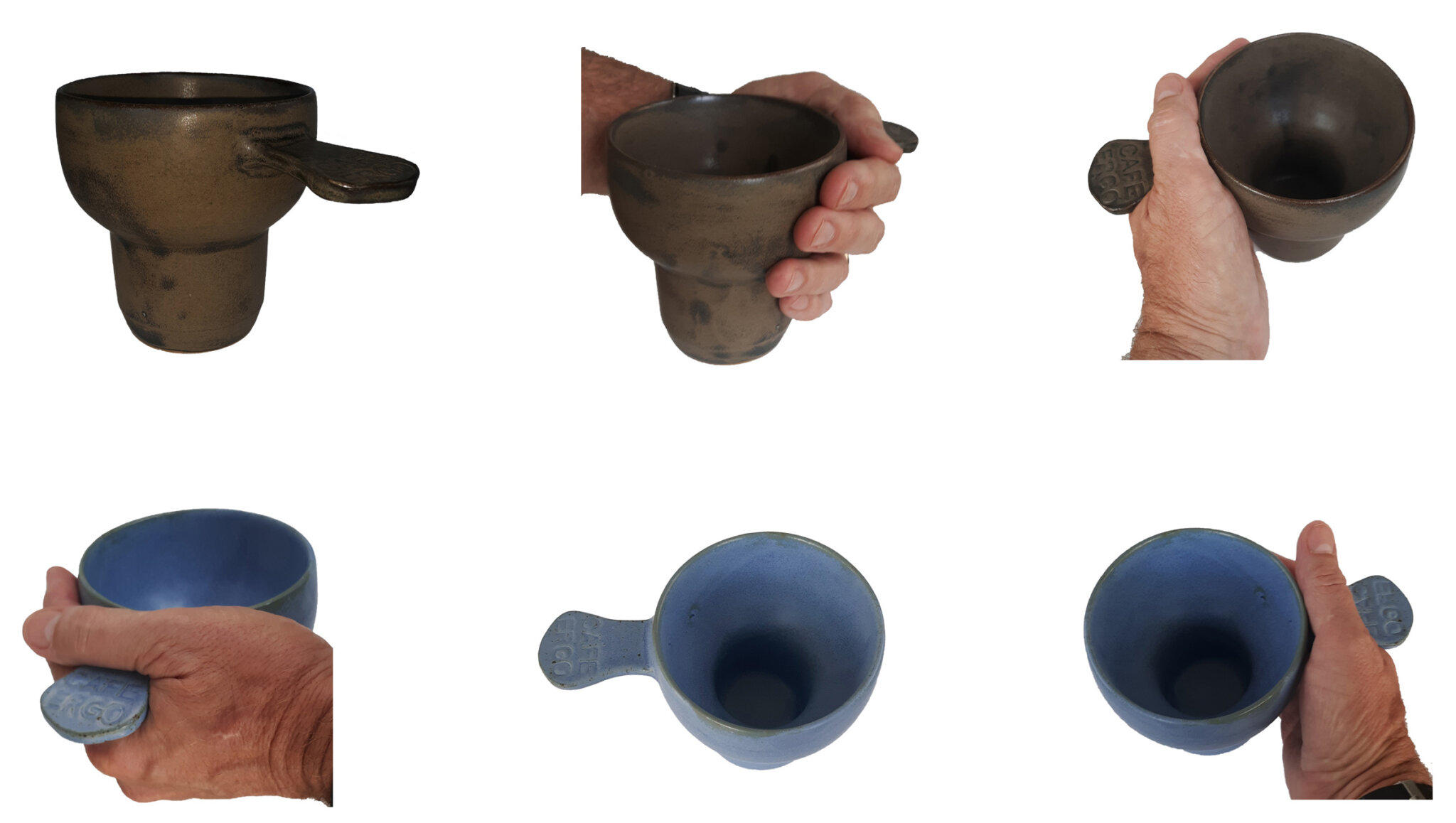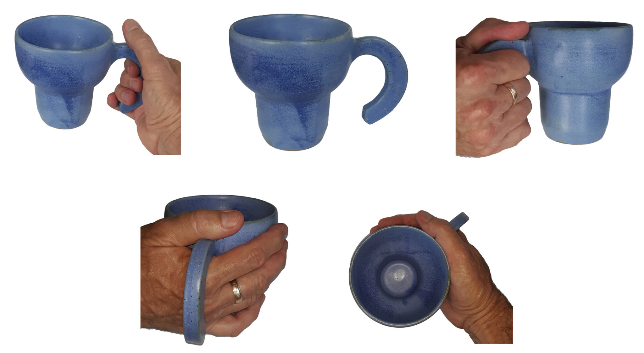 Designed as a hand-use specific cup. Utilizes UX design principles to reduce pressure and stress on the hand , wrist and fingers. The cup is either right handed or left handed.