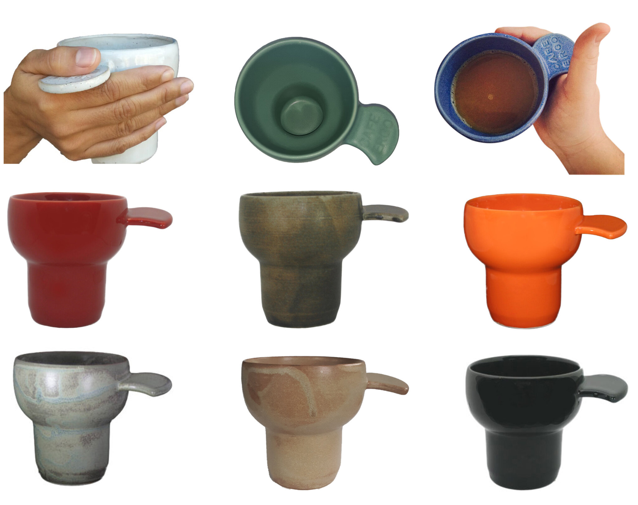 Cafe-ergo / ergo-ware is a line of ergonomic coffee cups designed to fit the palm of the hand, reduce pressure and stress on the hand and fingers, are double-walled, self-insulated, and keep the wrist in a neutral position. This contemporary design delivers a customer experience like no other. The 4 designs give the user a choice that best fits their needs, especially those individuals with adaptive, health-related issues. The sleek, non-traditional design allows those individuals to drink and use the product without feeling like they are using medical drinkware.