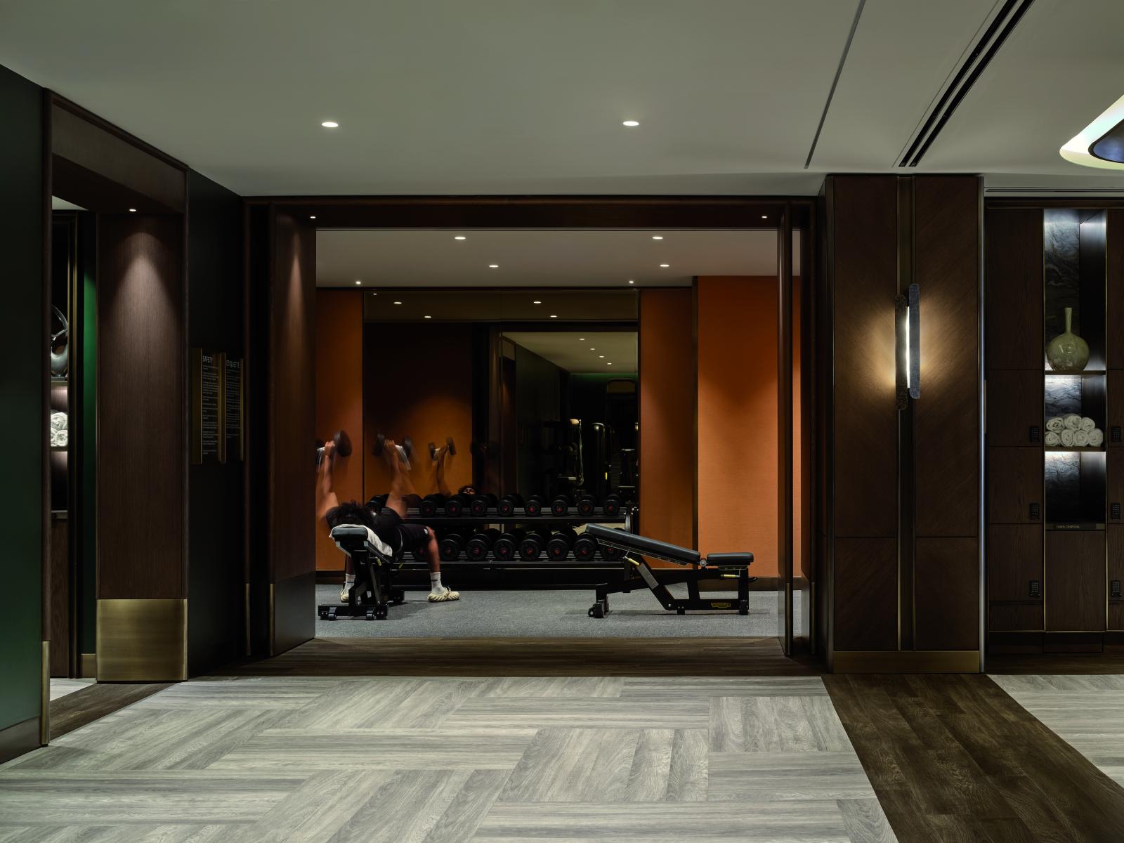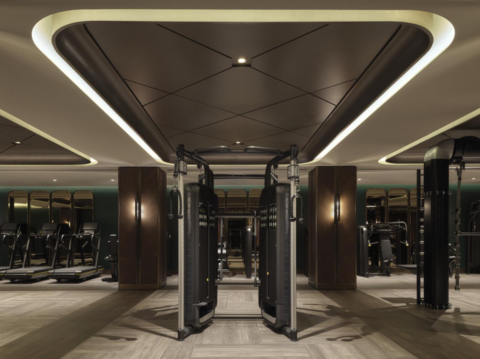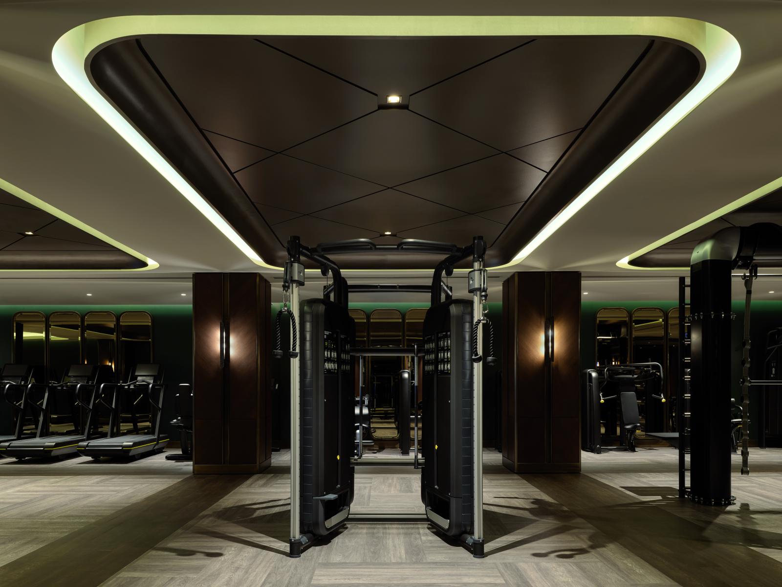 Functionality meets luxury throughout the space, with soundproofed flooring to mitigate noise from the ballroom below. The gym is divided into distinct areas for cardio, strength training, functional exercises, and free weights, offering diverse workout options.