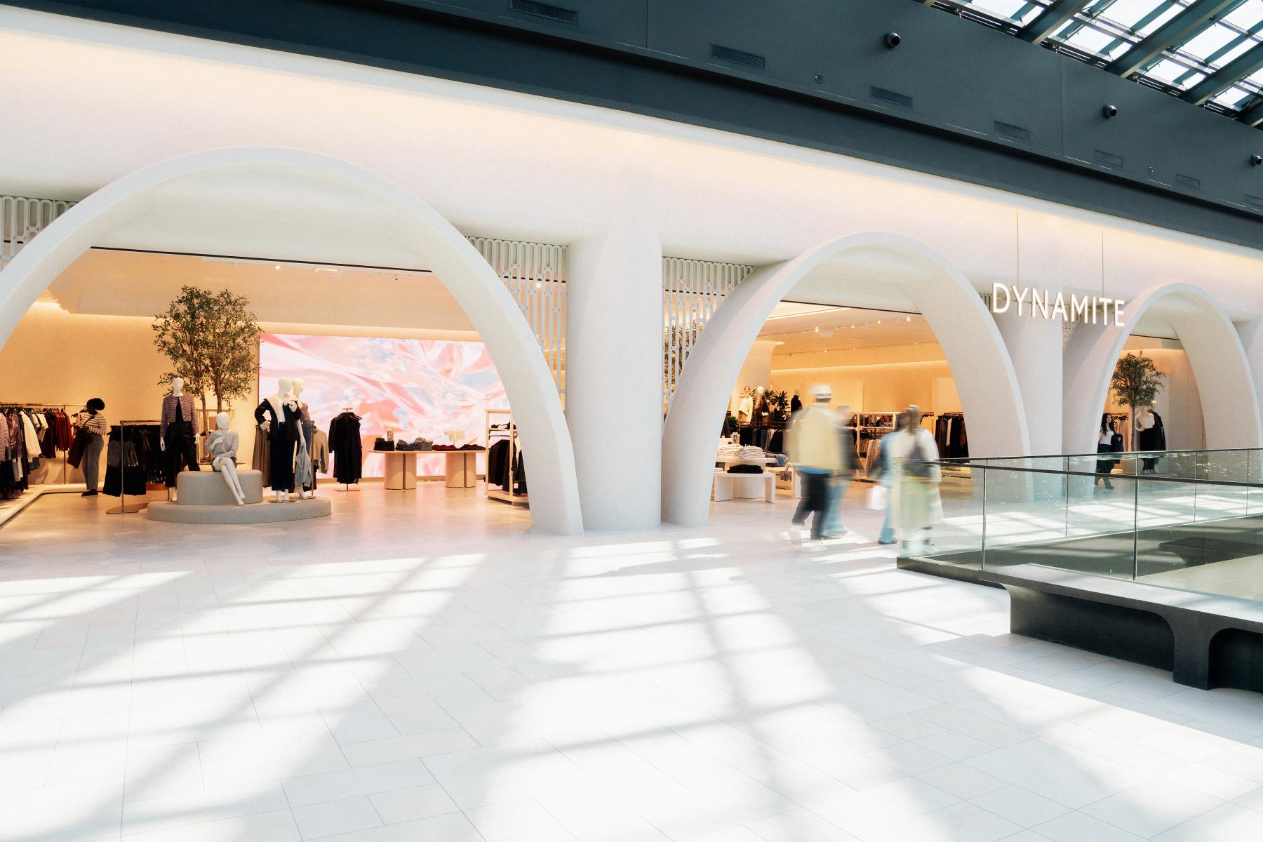 Pushed by creativity and innovation, the Dynamite brand has just opened an 8,000 square foot flagship store in the Royalmount District, one of Canada's first 100% carbon-neutral mixed-use developments. The flagship store offers a unique experience. The new concept is built around strong guidelines and a monumental facade. The concept reveals a spectacular entrance, intimate sub-spaces allowing for the organization of collections, and zenith lighting that enhances the store's distinctive experience. The three arches on the facade smoothly guide users as they enter the store. A destination that makes our customers want to escape and where time seems suspended.