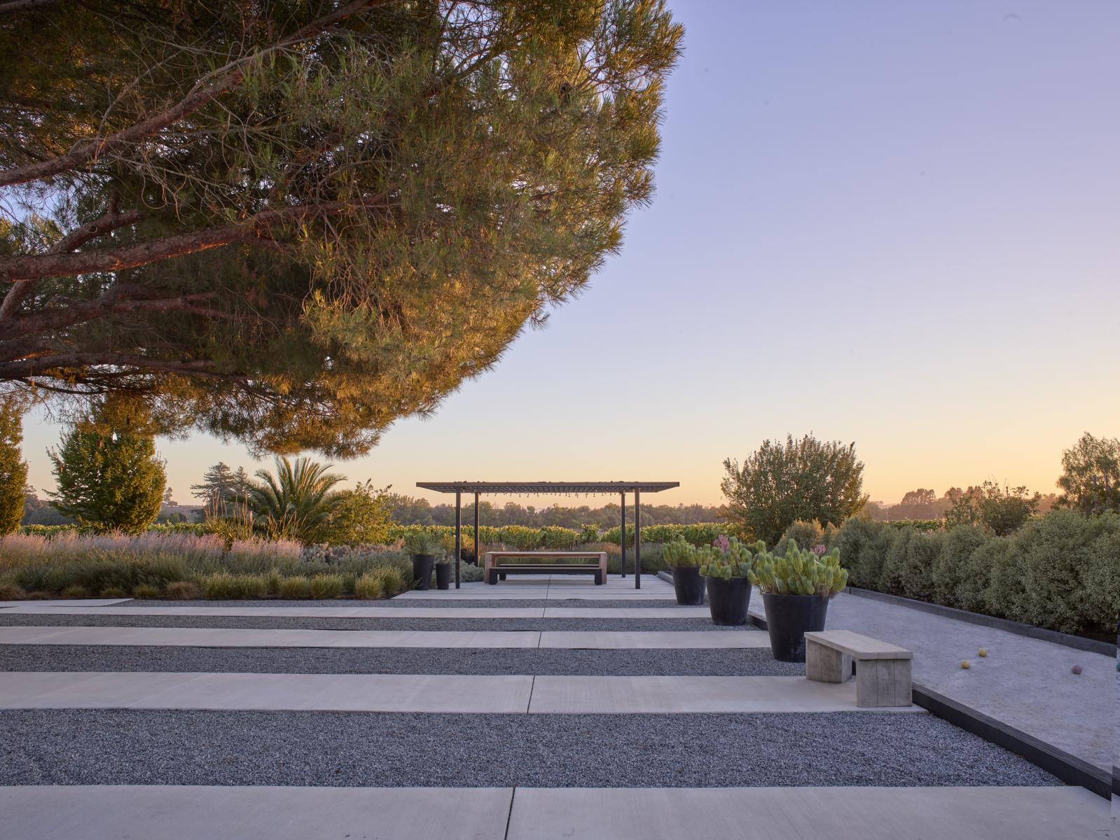 Surrounded by vineyards, this property in Napa County was revitalized with a renovated farmhouse and a thoughtfully designed landscape to reflect the new use of the site as a wine country family getaway. The landscape was designed to be modern, with a nod to its agricultural roots, emphasizing environmental sensitivity through permeable surfaces and low water use plants. The materials chosen are simple and timeless.