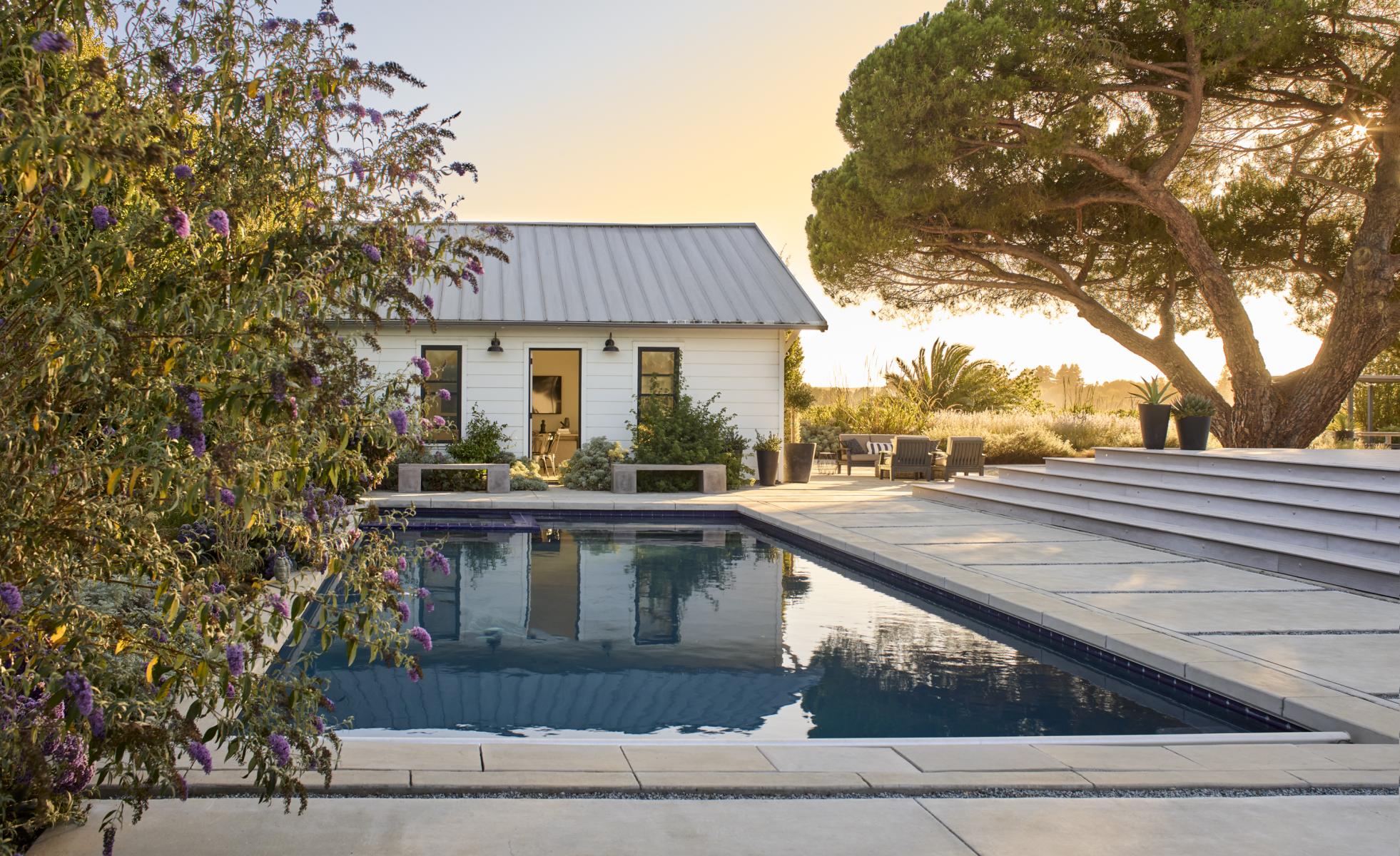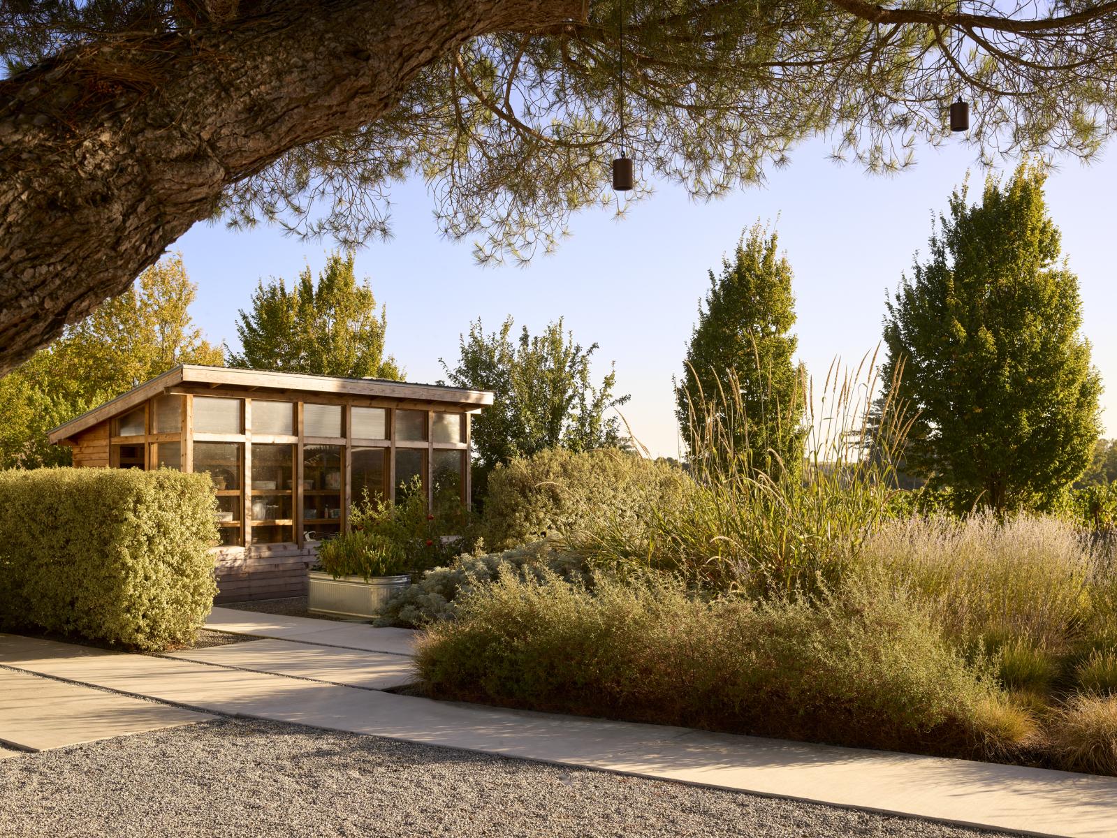 The pool area is located along the side of the house with the old garage-turned-pool-house. An informal planted screen lines the pool. Behind the pool house on the south end of the lot sits the she-shed, custom-built for fabric dyeing. Made of wood and glass, the shed is filled with light, and the wood will gracefully weather to a grey color over time. Nearby are galvanized farm troughs for vegetables and flowers. The north side is marked by meandering concrete bands through plantings and small seating nooks.