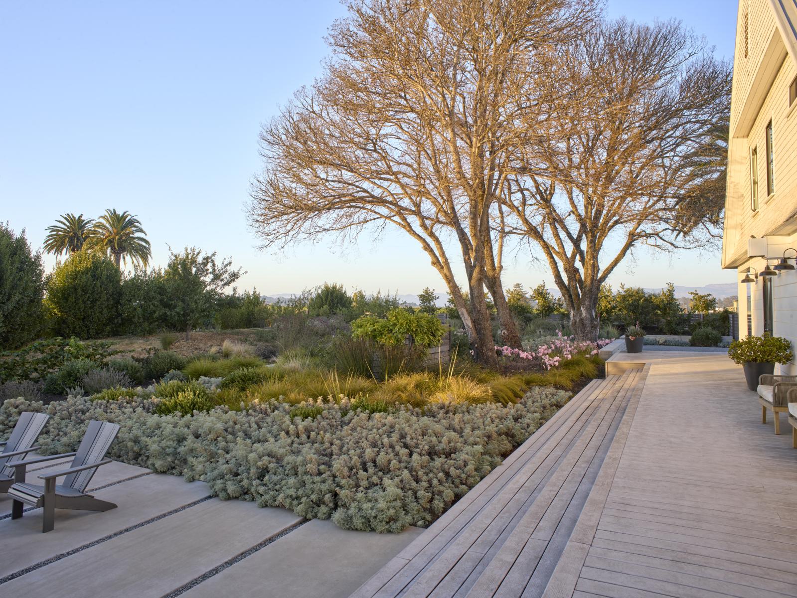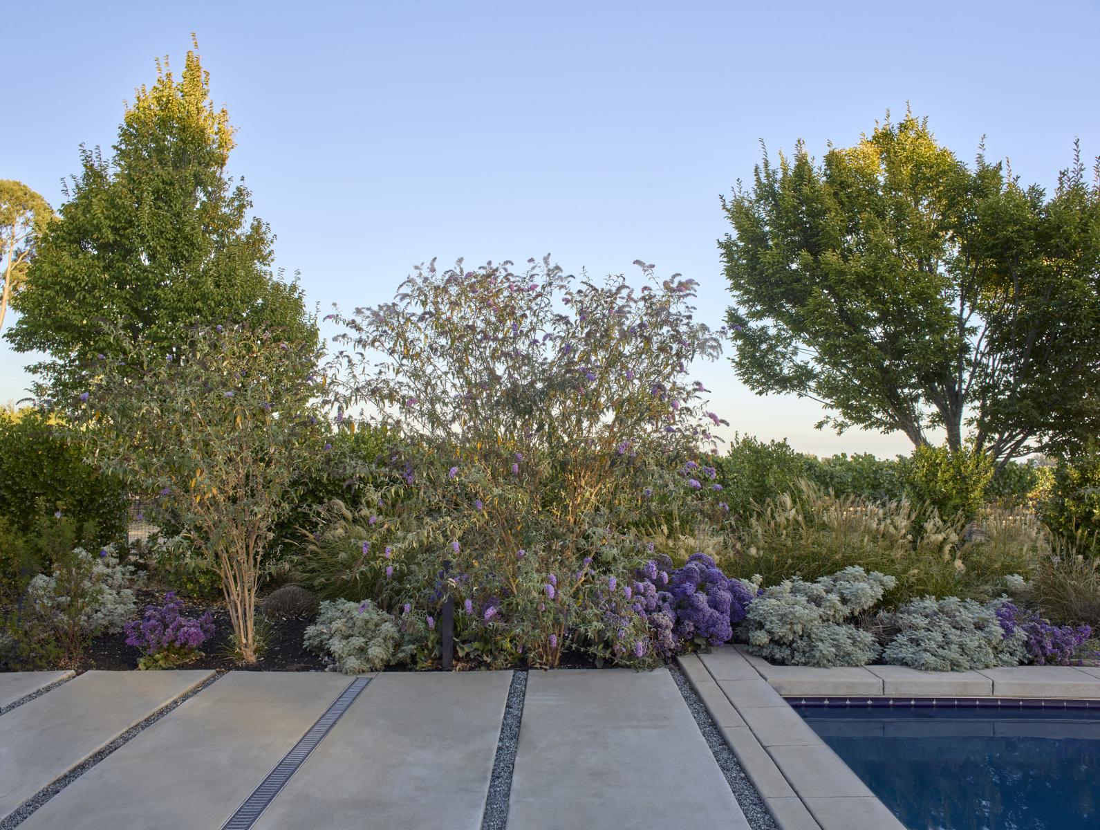 The chosen planting palette is primarily green and blue, with splashes of purple and yellow that complement the expansive sunset views on the property. Grasses and drought-tolerant plants replace traditional lawns with a water-wise design that shimmers in the sun’s golden hour.