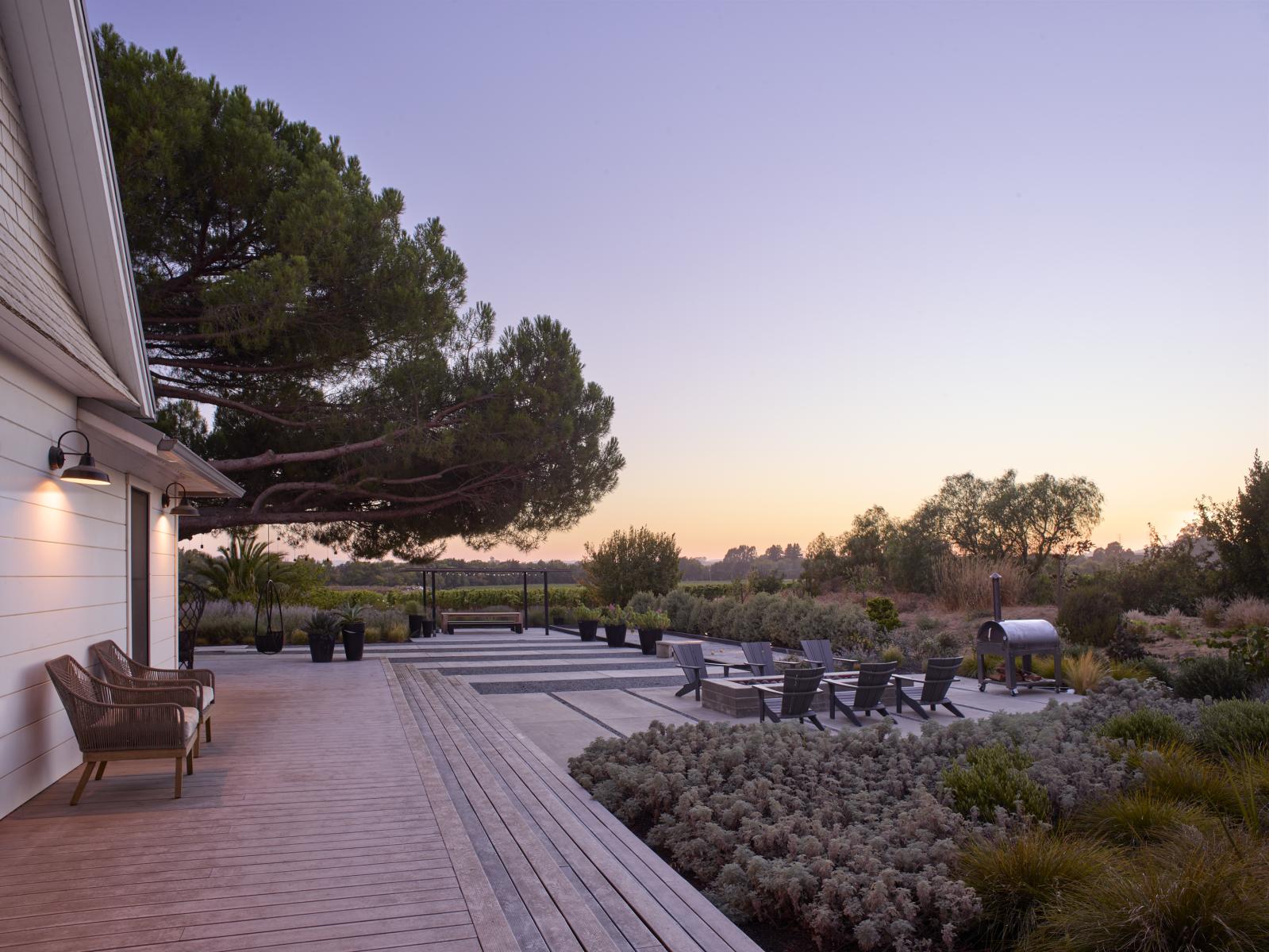 To the west, a sleek trellis provides a shaded spot for a dining table to enjoy meals by the vineyards. It has a slim steel frame so as not to detract from the surrounding views. A bocce court and firepit are nearby for entertainment. The rectangular concrete firepit creates a designated gathering point with a cozy enclosure of grasses and perennials. Furniture, pots and accent pieces are primarily black, contrasting with the white house and tying into the dark trim. The surrounding deck was part of the architecture and is constructed from wood to echo the farmhouse aesthetic. Natural concrete bands harmonize with the white exterior and light wood.
