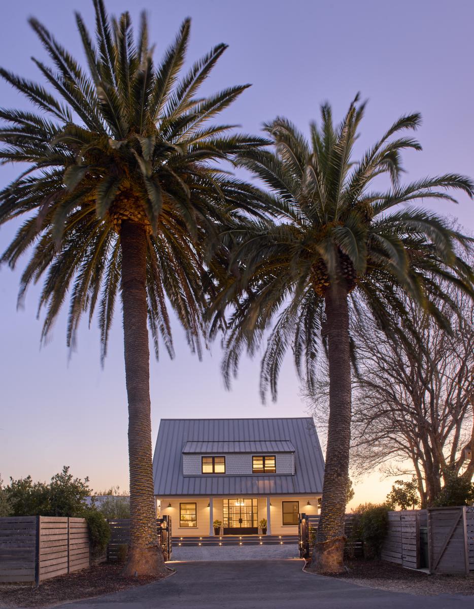 As you approach the residence, two existing palms create a grand, welcoming entrance. The new cedar fence with galvanized posts is understated with materials that fit into a rural setting. The entry gate opens to a gravel courtyard edged with low concrete walls and informal plantings.