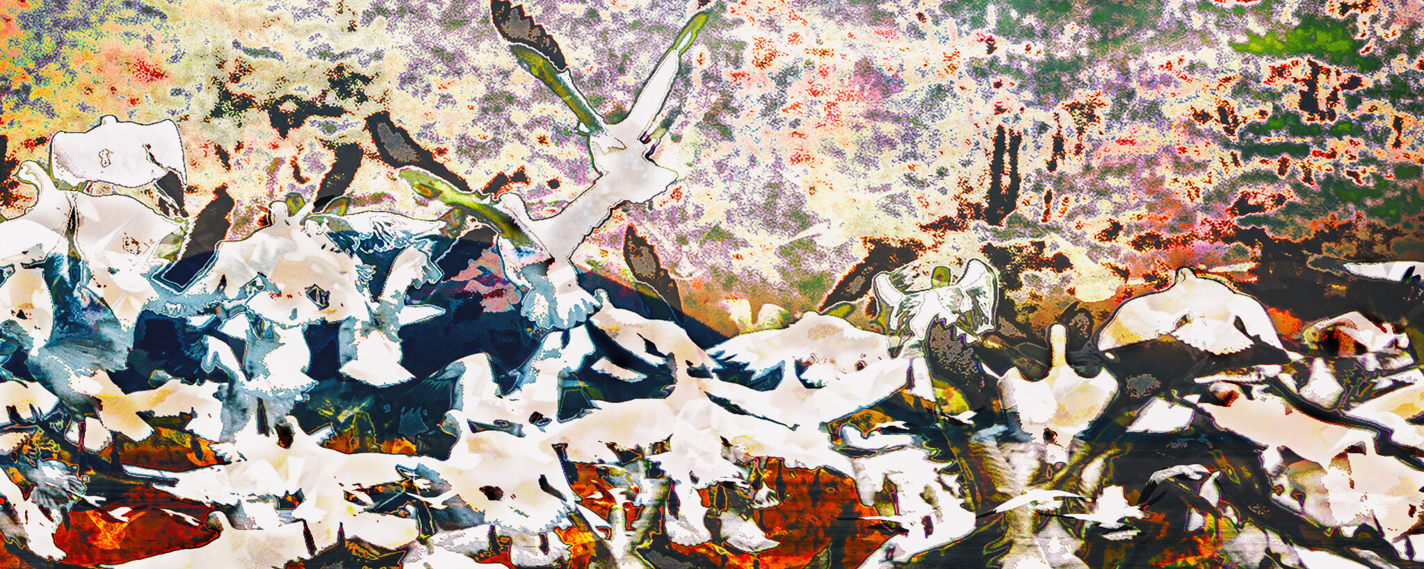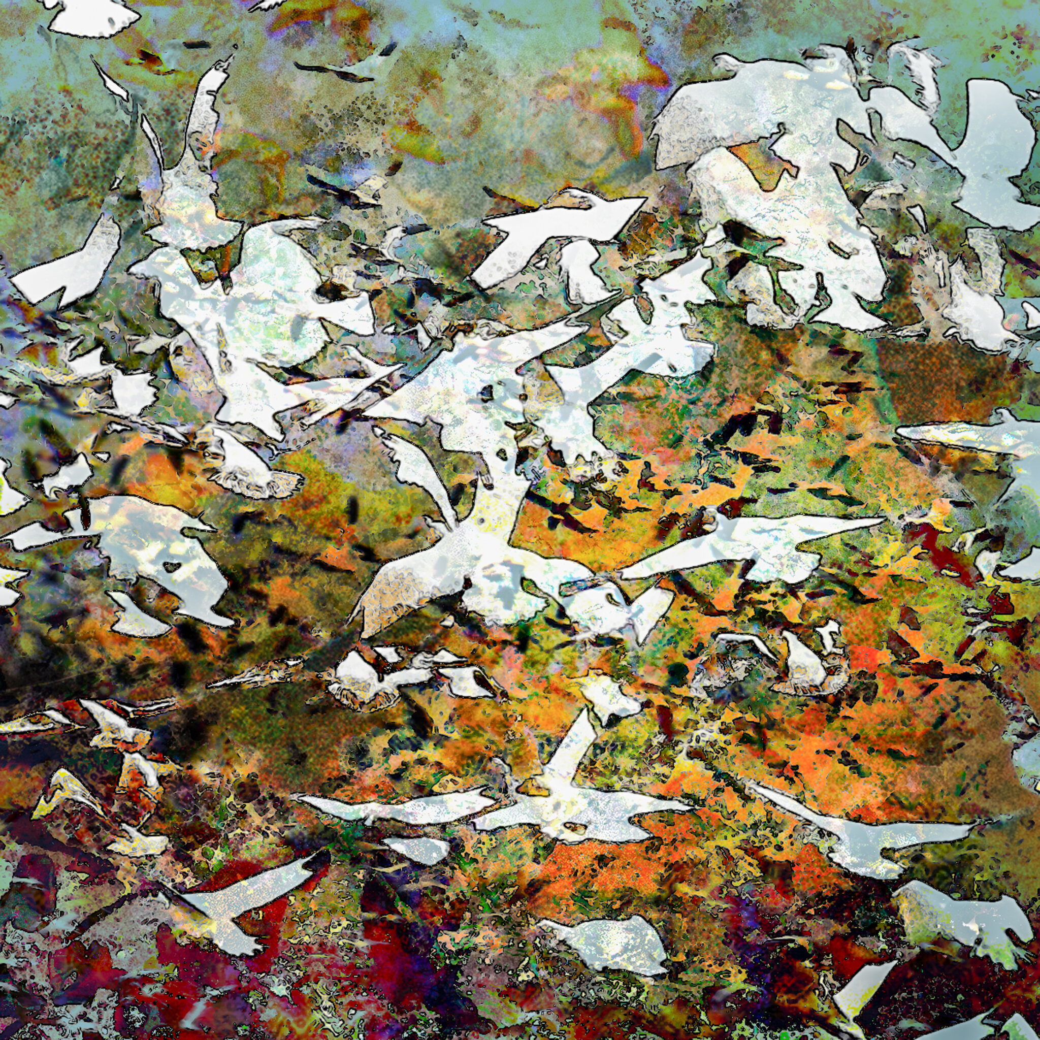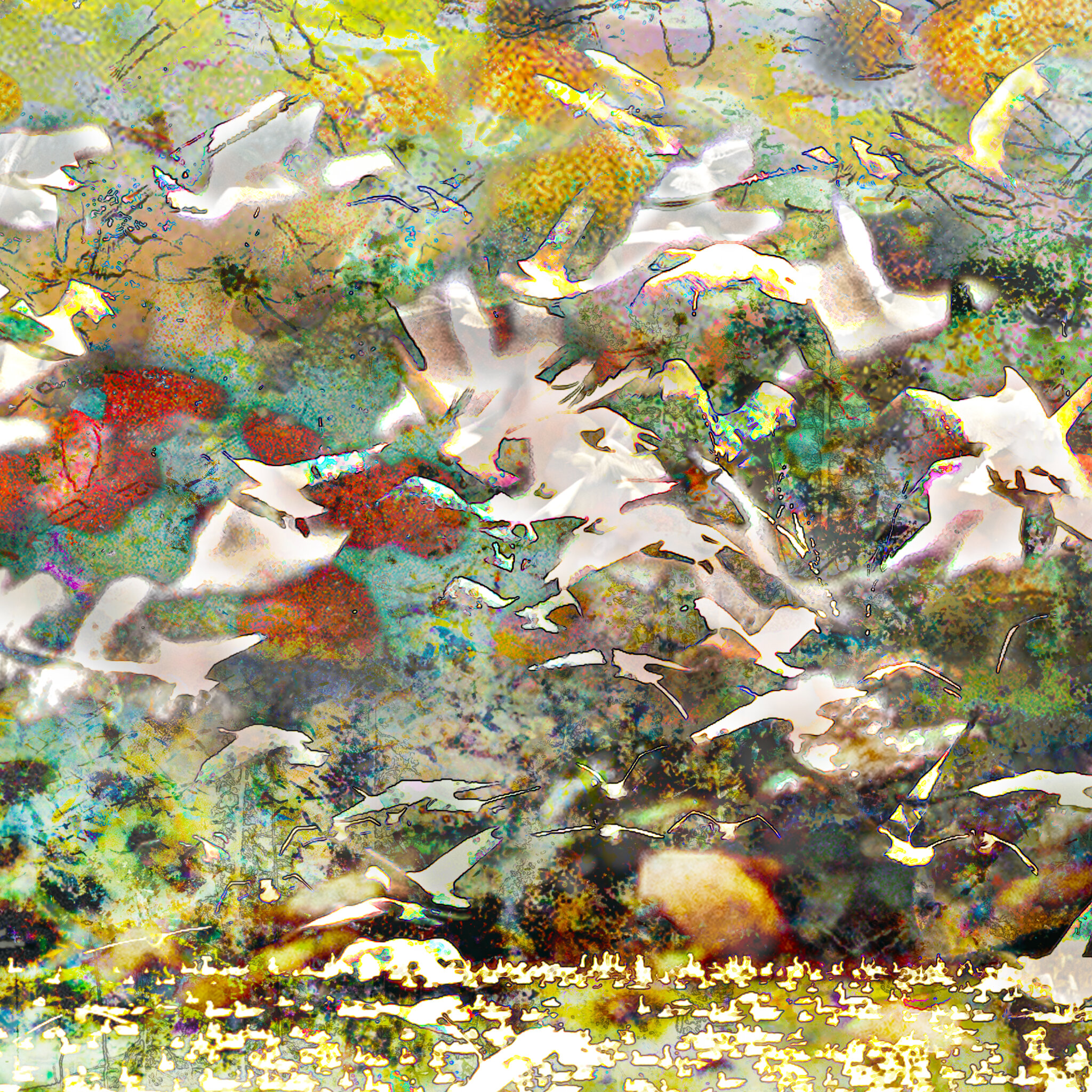 Imagined in synergy with the hanging space (the footbridge) and the flight of white geese. Marjorie presents us with the geese as a central element. Free and living in a colony, these birds must follow a flight structure and work as a team in order to achieve their goals. Their roots are anchored in her and come back to tint our fields, river as well as our St. Lawrence.