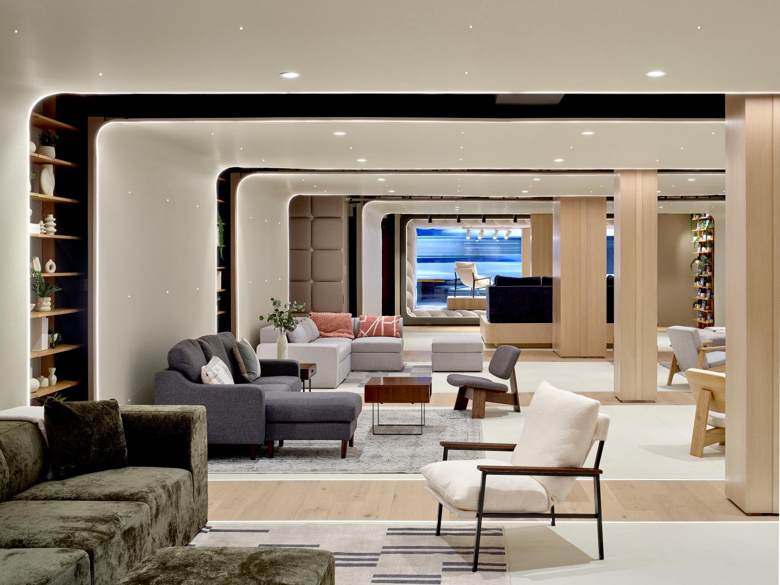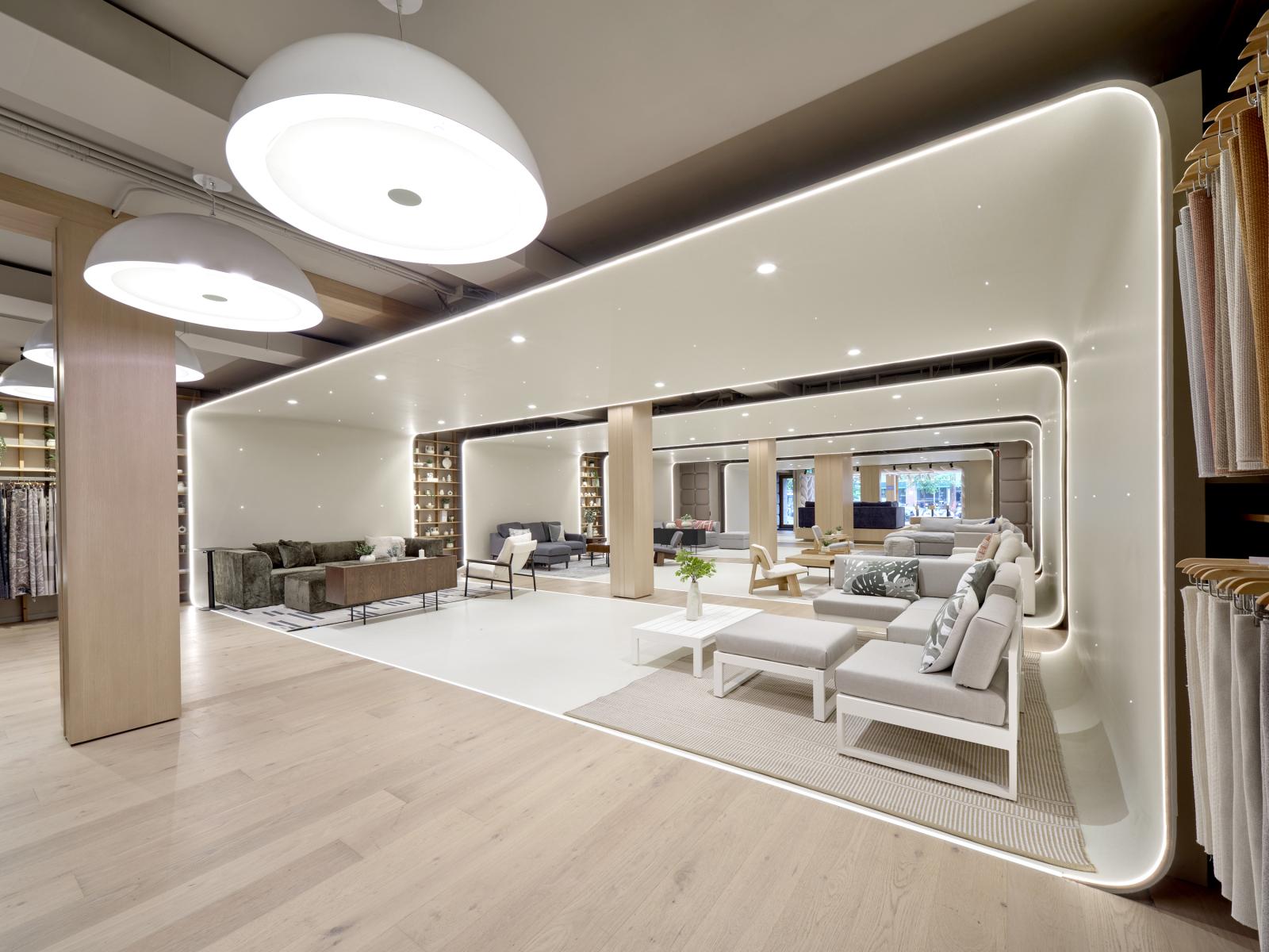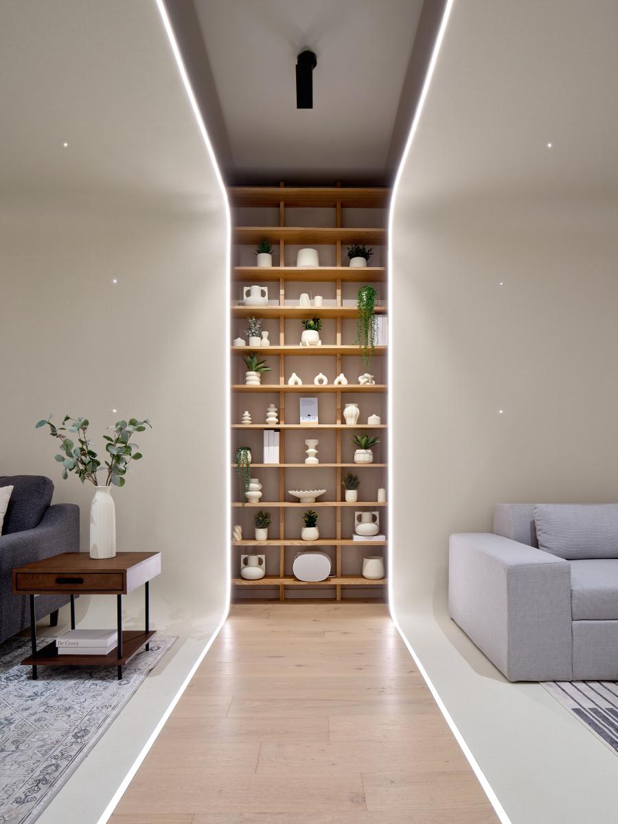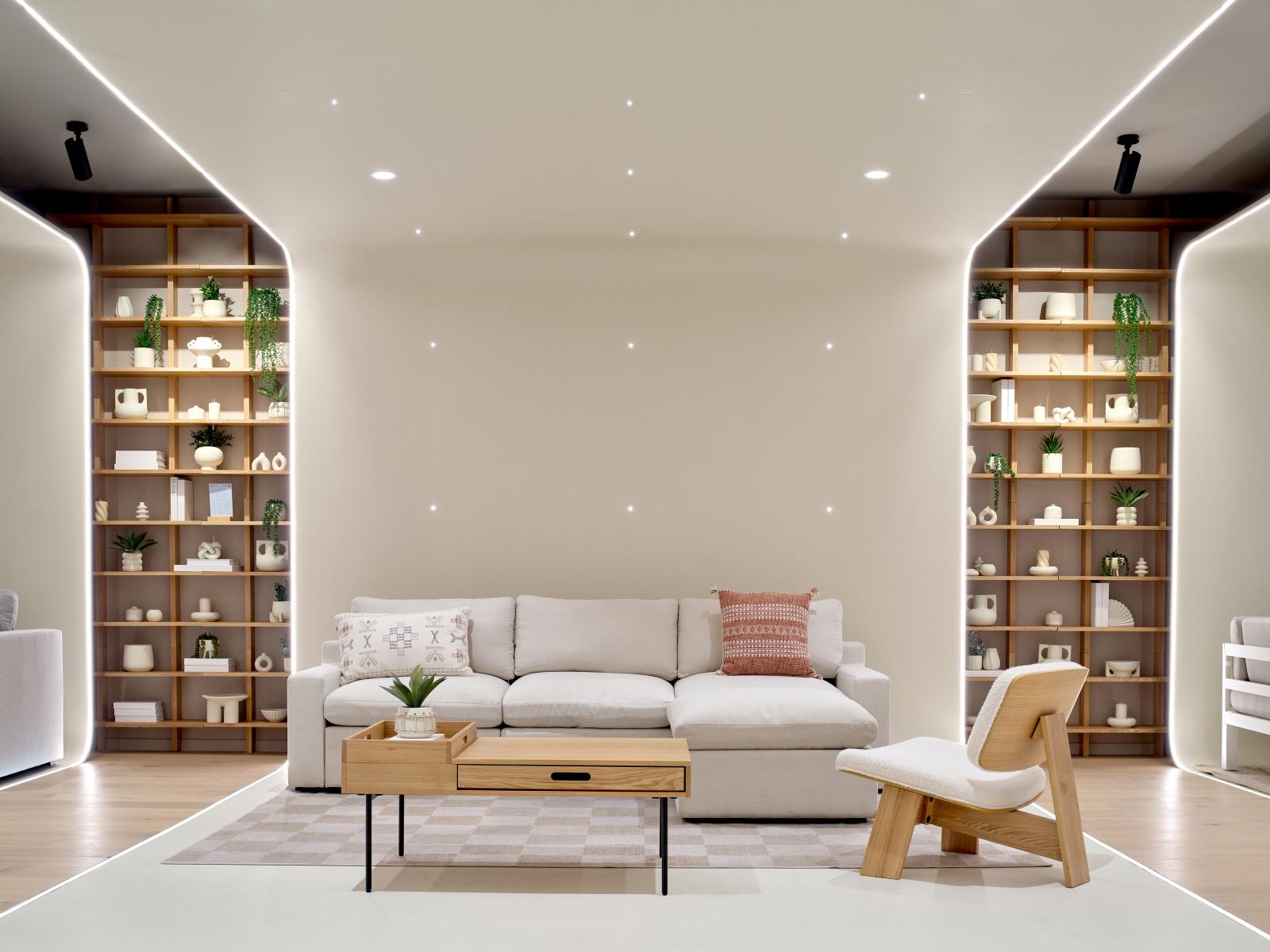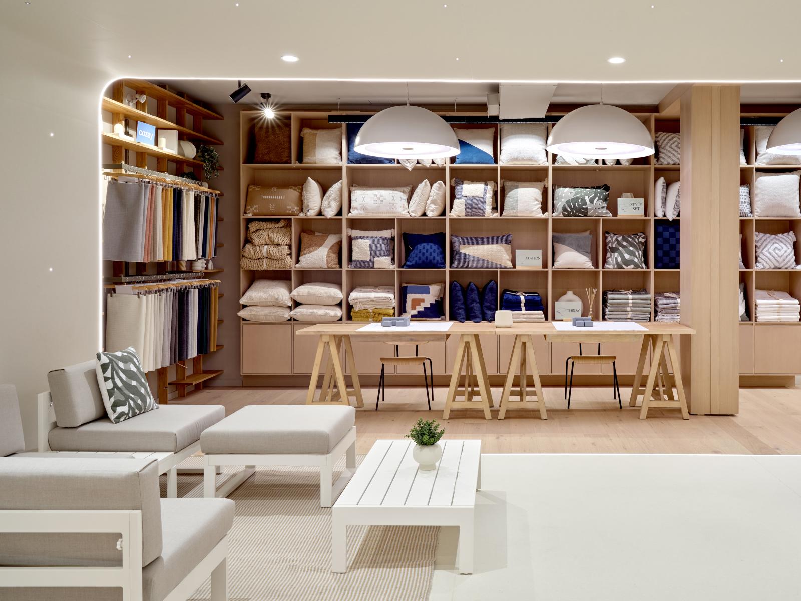 As for the layout, the design approach is both UX and product focused, initiating the customer journey streetside with a stunning window showcase, evoking oversized fabric, to draw patrons inside. The elongated retail space then cleverly moves clients towards the design centre at the back, funneling them through successive “rings” inspired by a photographer’s studio cyclorama. Beyond enhancing the featured products, the curved and edge-light vinyl backdrops seamlessly run from floor to ceiling, creating an immersive shape that subliminally evokes generic house room proportions. In between rings, the designers hacked Cozey’s own shelving units to create a unifying backdrop featuring monochromatic domestic props.