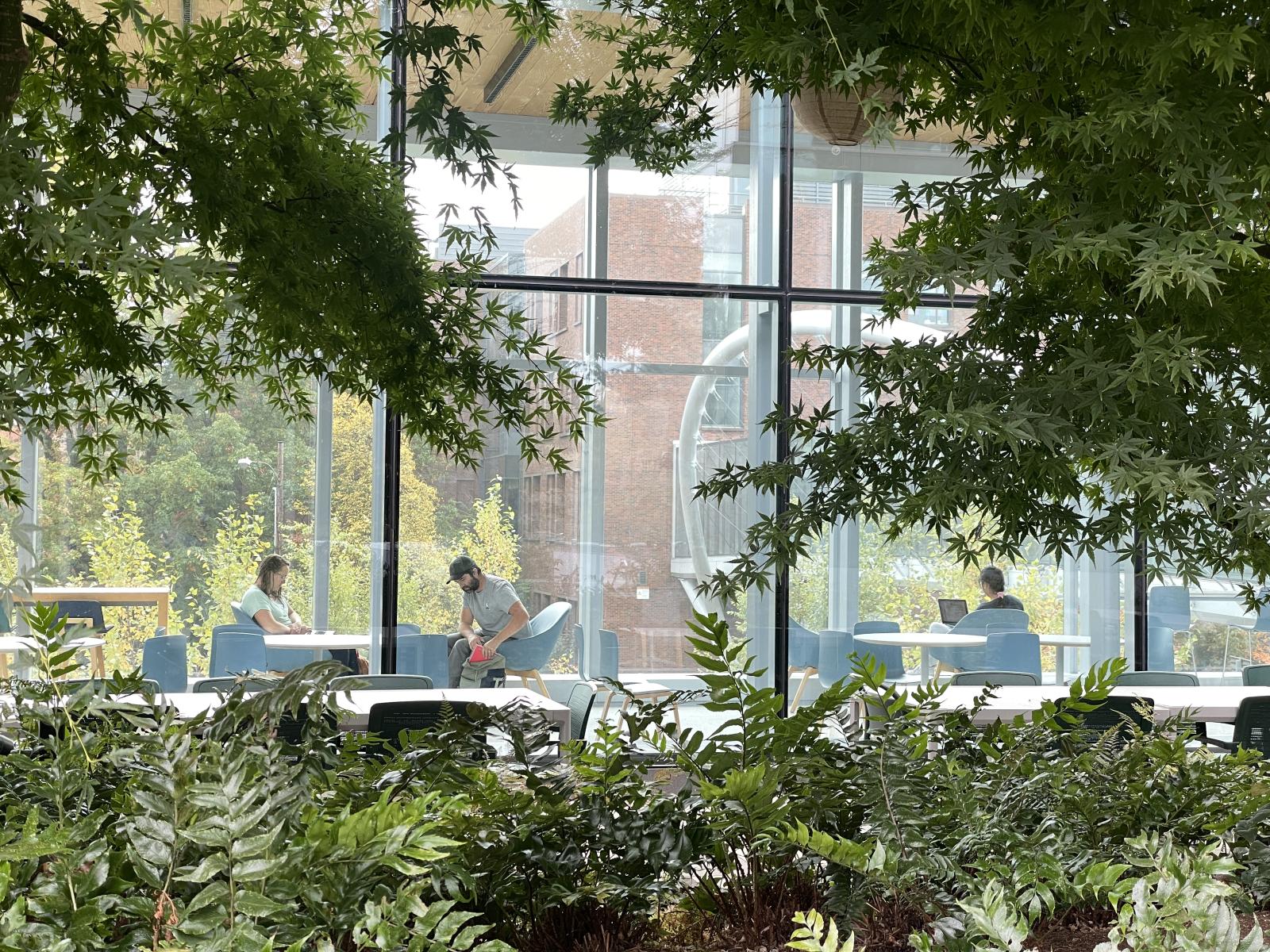 Planting wraps KCASI in greenery. Vegetation reaches Franklin’s edge, letting the sidewalk dip into the site. Pedestrians are shielded from traffic and linked to campus. Groves of River Birch and Serviceberry filter the frontage. A fern-clad stormwater basin is planted with rush and sedge, filtering rainwater into the Millrace.