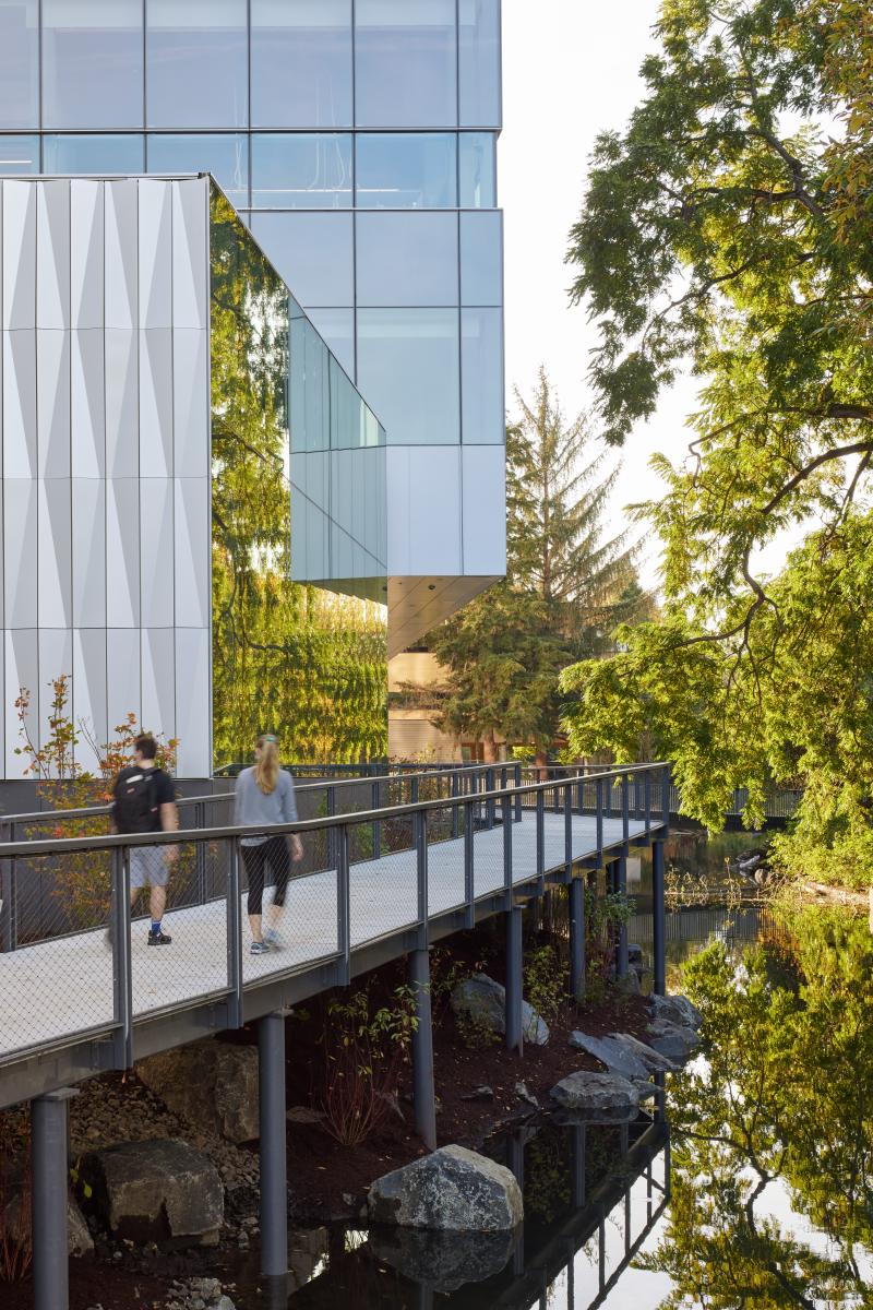 Through its location and architecture, KCASI is a key addition to the north campus and a link to the Willamette River. It serves as a circulation feature and gateway for those crossing Franklin Boulevard. The north campus has entry points like bridges and tunnels. Entries focus circulation through the KCASI site, creating wayfinding and a welcoming experience.