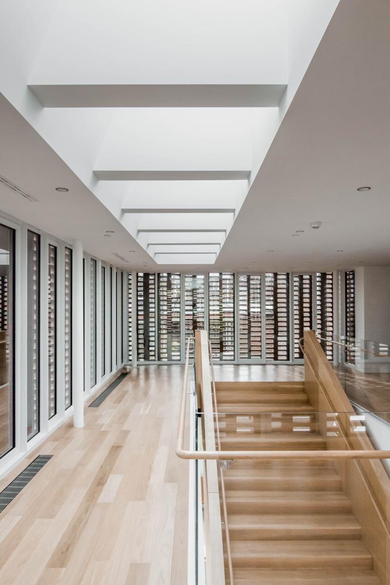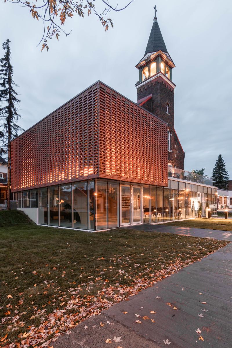 The Agora of the Arts enhances the significance of a notable piece of Quebec heritage by repurposing it for contemporary use, thereby preserving its status as a cultural nucleus in the Abitibi-Témiscamingue region and honouring its historical and symbolic importance. This initiative was conceived as an exercise in rehabilitating memory and heritage, encompassing the diverse social, cultural, and landscape values associated with the complex, composed of the Notre-Dame-de-Protection church and its presbytery. Furthermore, the project introduces a new structure—a suspended volume that contributes to the modern character of the infrastructure. Featuring traditional red brick masonry arranged in a lattice pattern against a glass wall, the new building radiates an aura of sophisticated modernity. This additional volume functions as a nexus for the performing arts, integrating the memory of the existing structure and connecting with the urban context of the region.