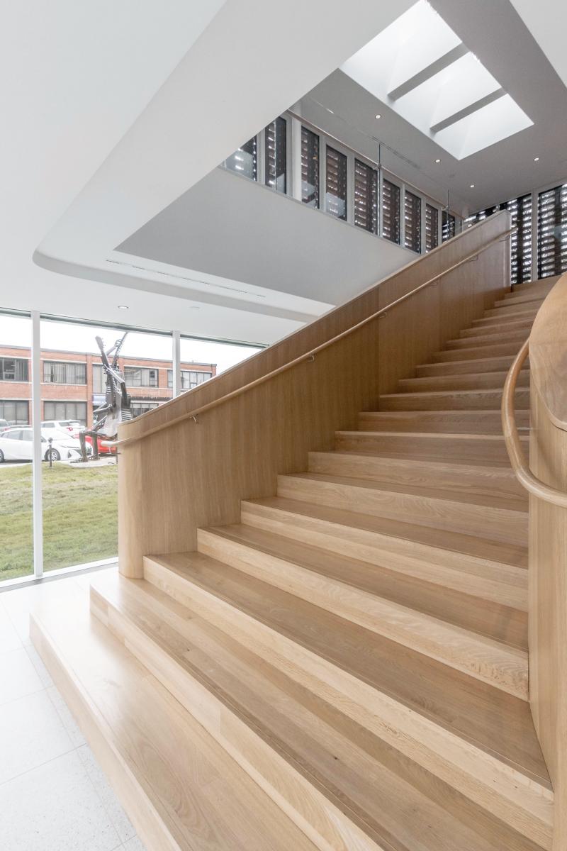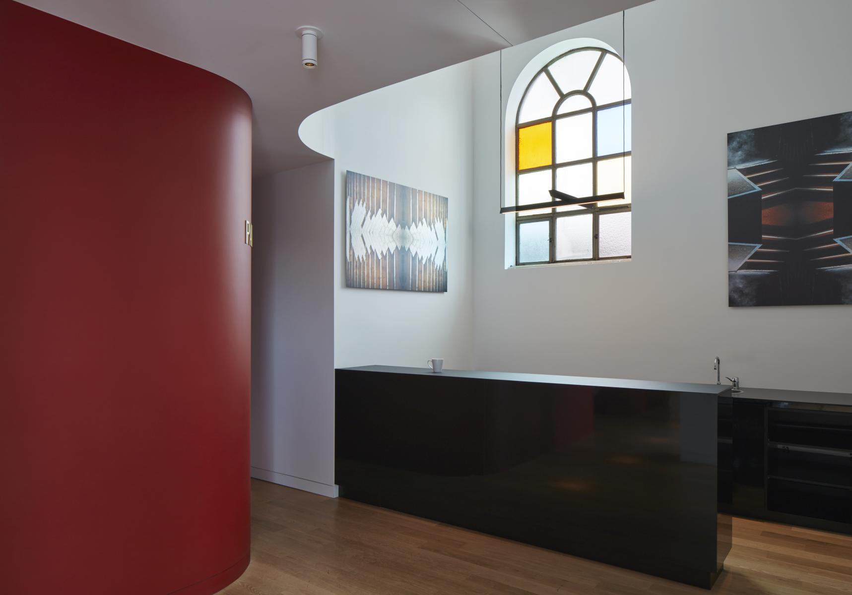 Winner of an architectural competition, the project involved the complete renovation of the church, including its 200-seat performance hall, various roofing elements, structural framework, and part of its envelope. Additionally, the iconic staircase of the church has been relocated laterally within the structure, thereby connecting the foyer's two levels. The structure asserts its presence through the glass walls on the first floor, while its substantial wooden façade imbues the Agora with a notable grandeur. The staircase reflects the polished finishes characteristic of traditional church pews, pulpits, and confessionals, serving as a distinguished access route to the creative realm of the stage and leading to the performance hall. The preservation of this significant feature from the original building roots the project with the historical resonance of Christmas masses, baptisms, weddings, concerts, and theatrical performances that have traversed its steps over the past century.