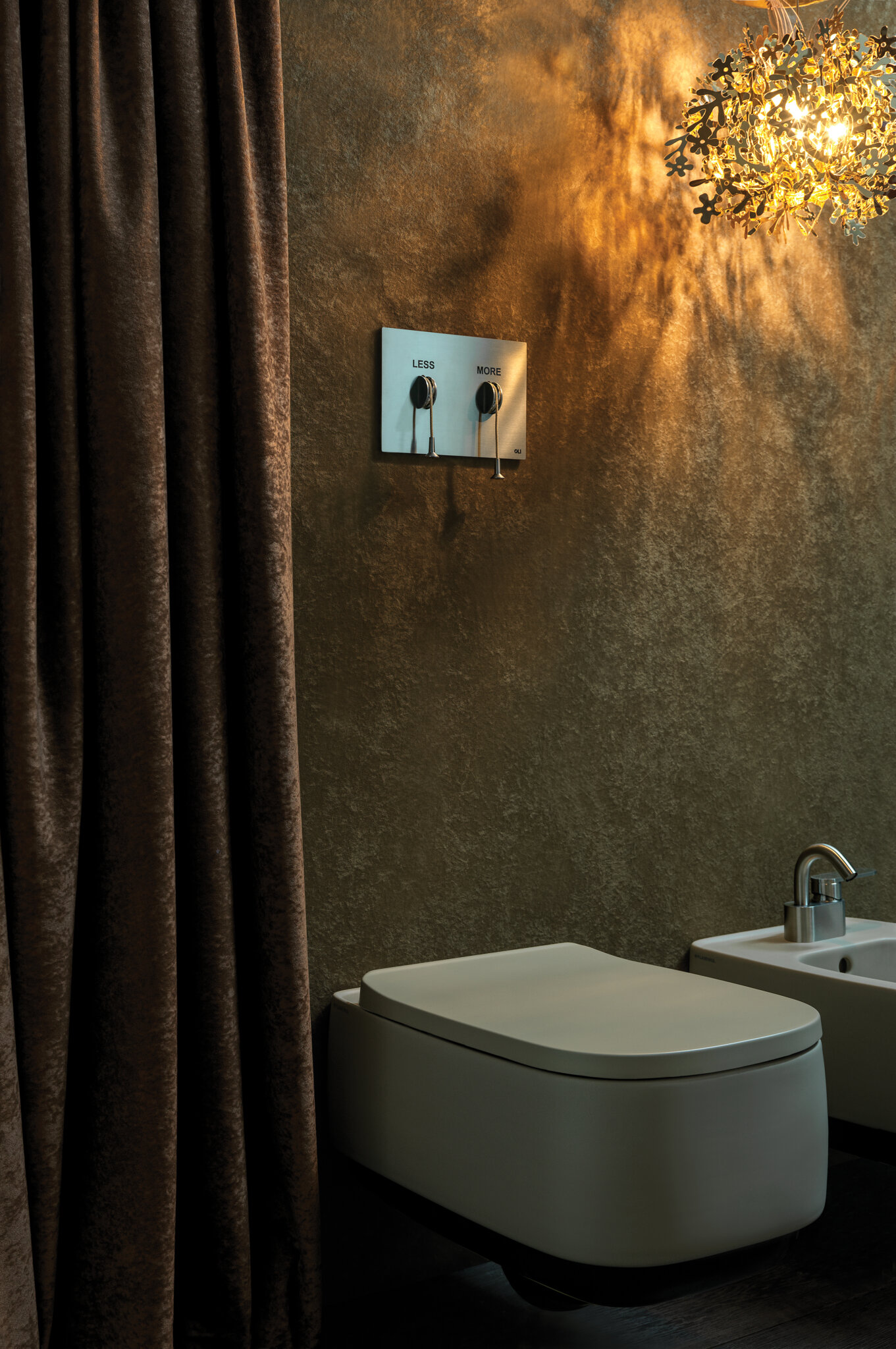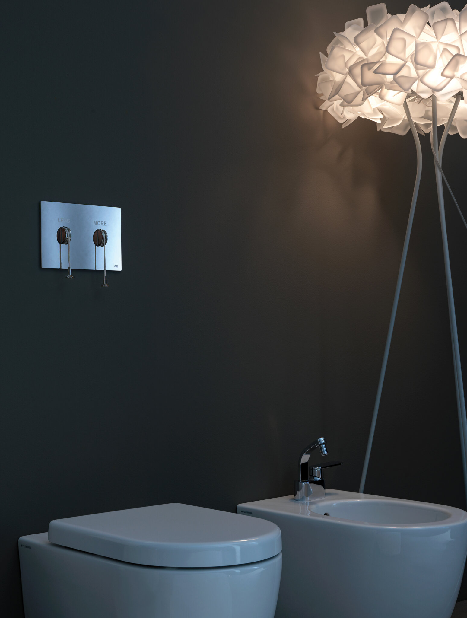 The OLI LESS IS MORE is a flush plate made of stainless steel and nylon cables that end with traditional flush activation buttons. The design embodies the two elements that are reminiscent of the first sanitary mechanisms in history.