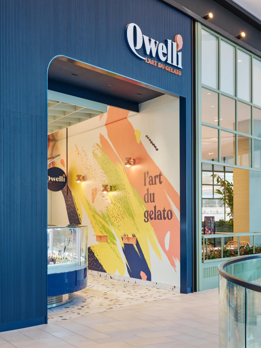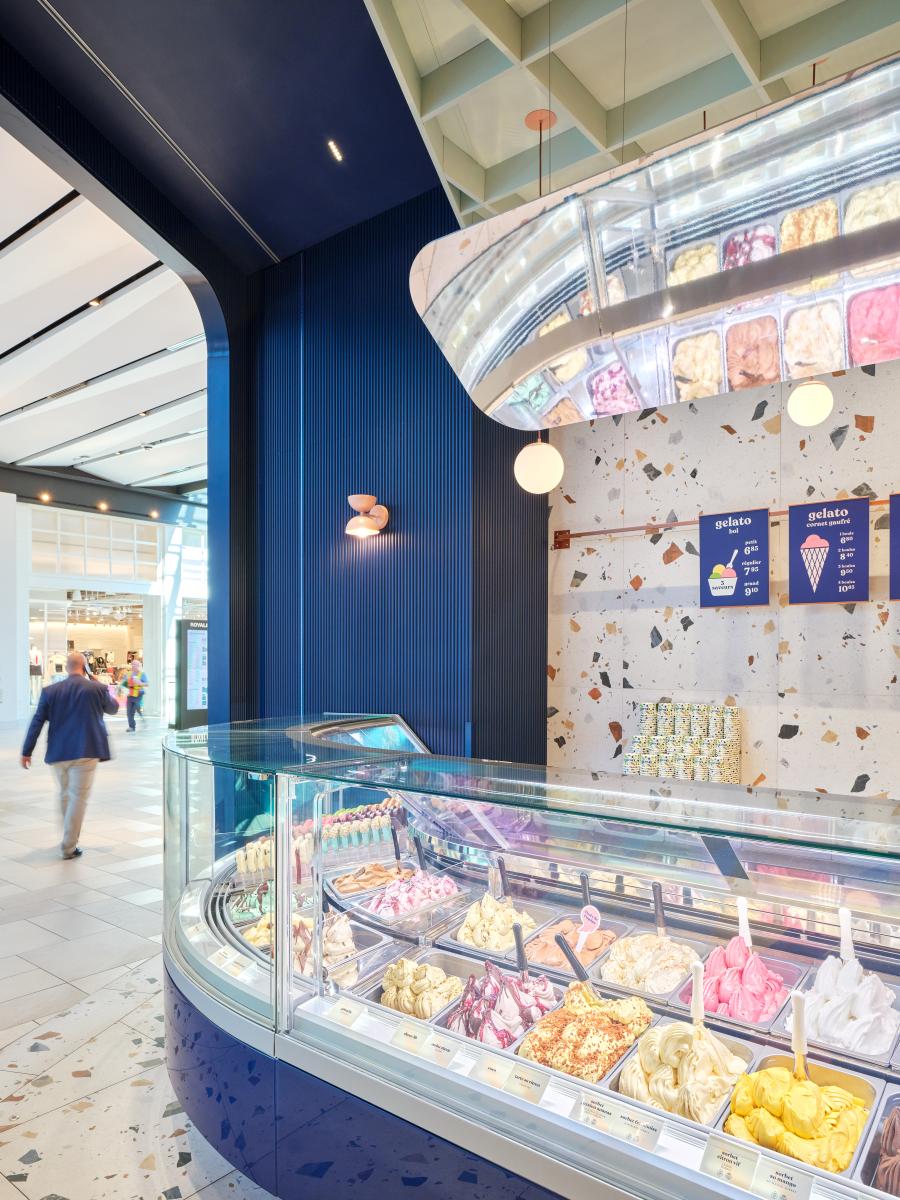 The latest deployment of Qwelli's new aesthetic vision, initiated a few years ago with the award-winning Eaton Center project, the Royalmount shopping center concession is intended as both a playful and gourmet counter, complementing the adjacent food court.