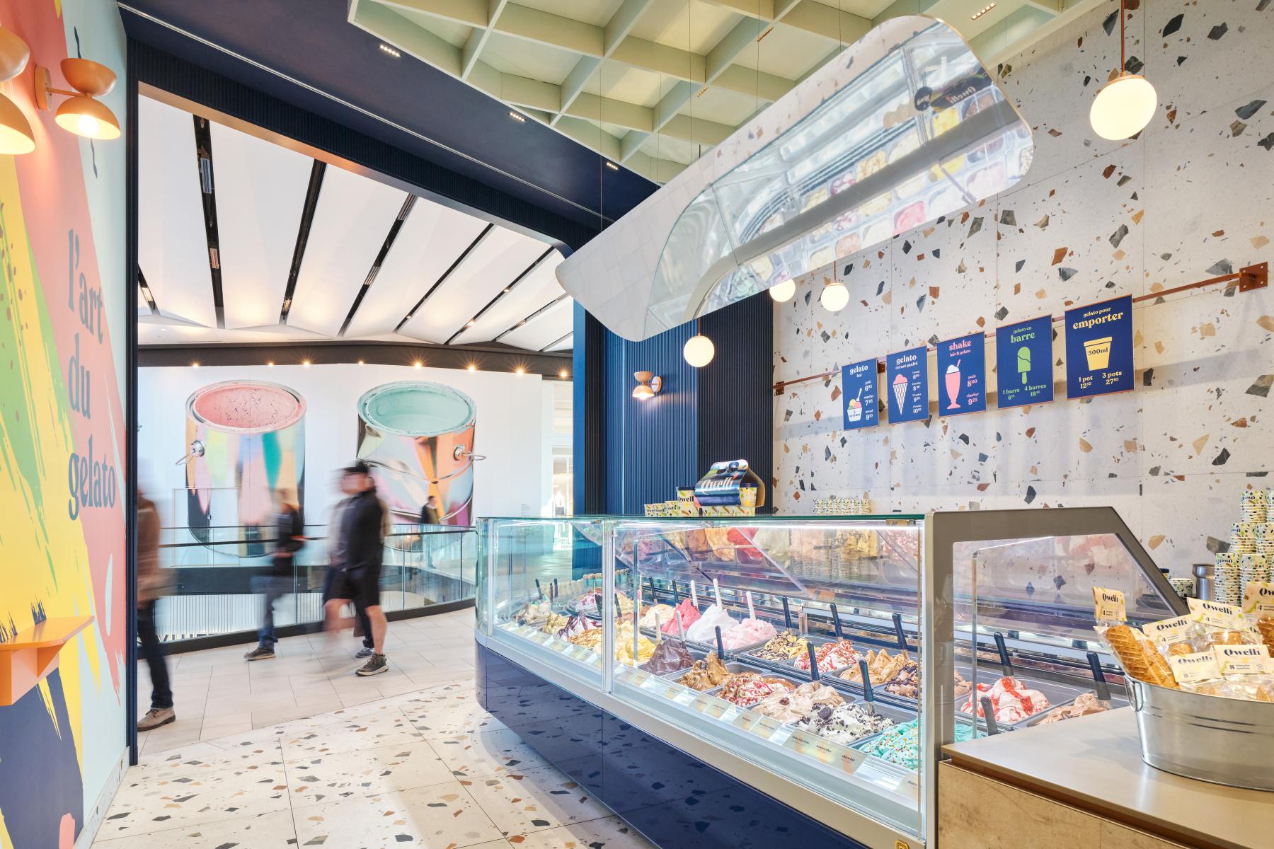 The counter highlights gelato products and their variations, with visibility enhanced by a giant suspended mirror, slightly tilted towards the visitor, allowing the vibrant colors to resonate throughout the space.