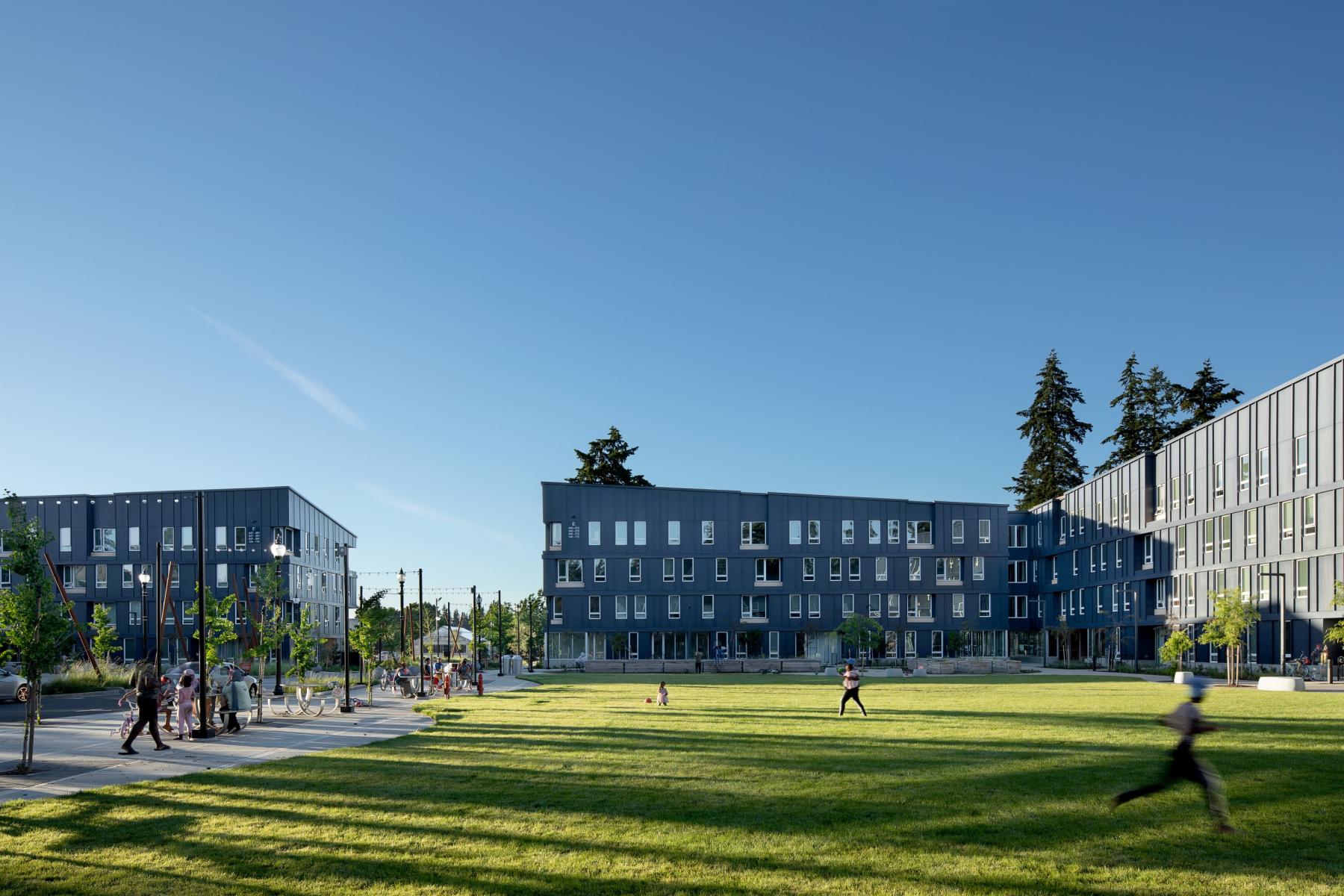 Rockwood Village is a promise fulfilled—a community nexus where every individual is seen, valued, and empowered. Developed with Community Development Partners (CDP) and Hacienda CDC, this neighborhood redefines belonging. Inspired by historic town squares, it cultivates access to nature, discovery, and daily rituals. Communal spaces—grand and intimate—unfold beneath towering evergreens for morning walks, afternoon play, and evening celebrations under the stars.