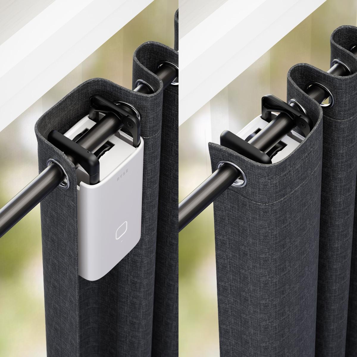 Inspired by other RYSE products, SmartCurtain features a clean, monolithic design with soft curves, a matte finish, and a tactile button that enhances its minimal aesthetic. Integrated carabiner hooks offer ease of use, and it can be discreetly installed behind the curtain—making it a seamless part of any modern home.