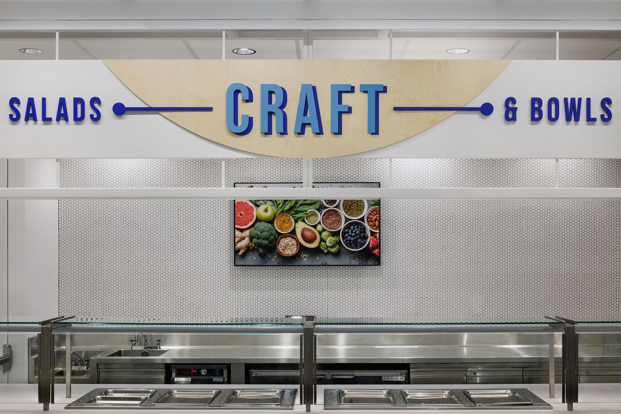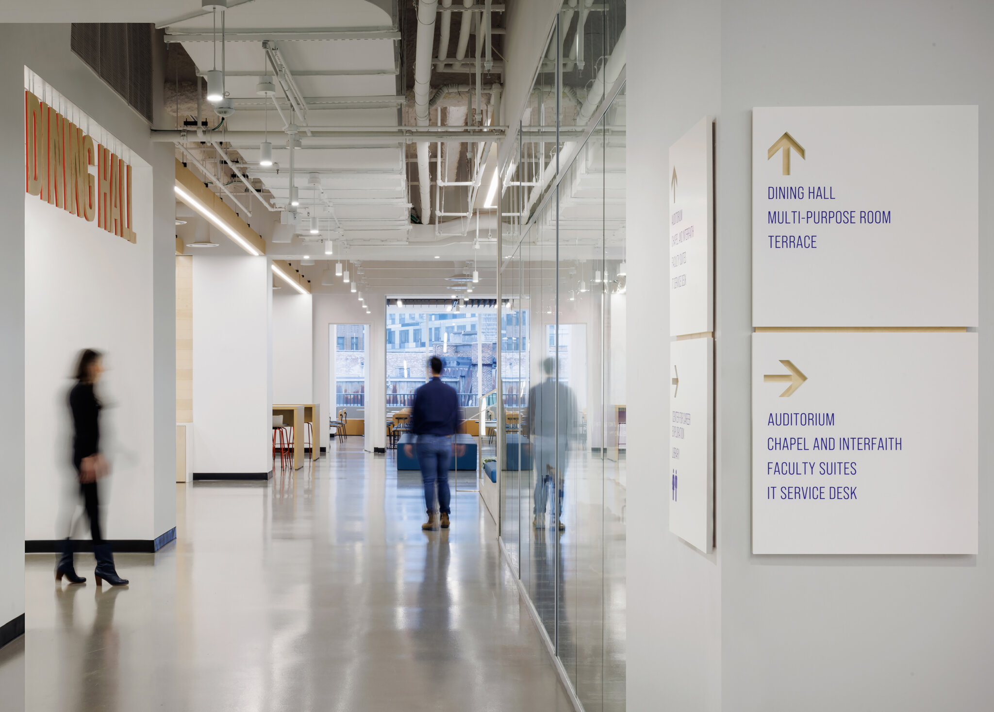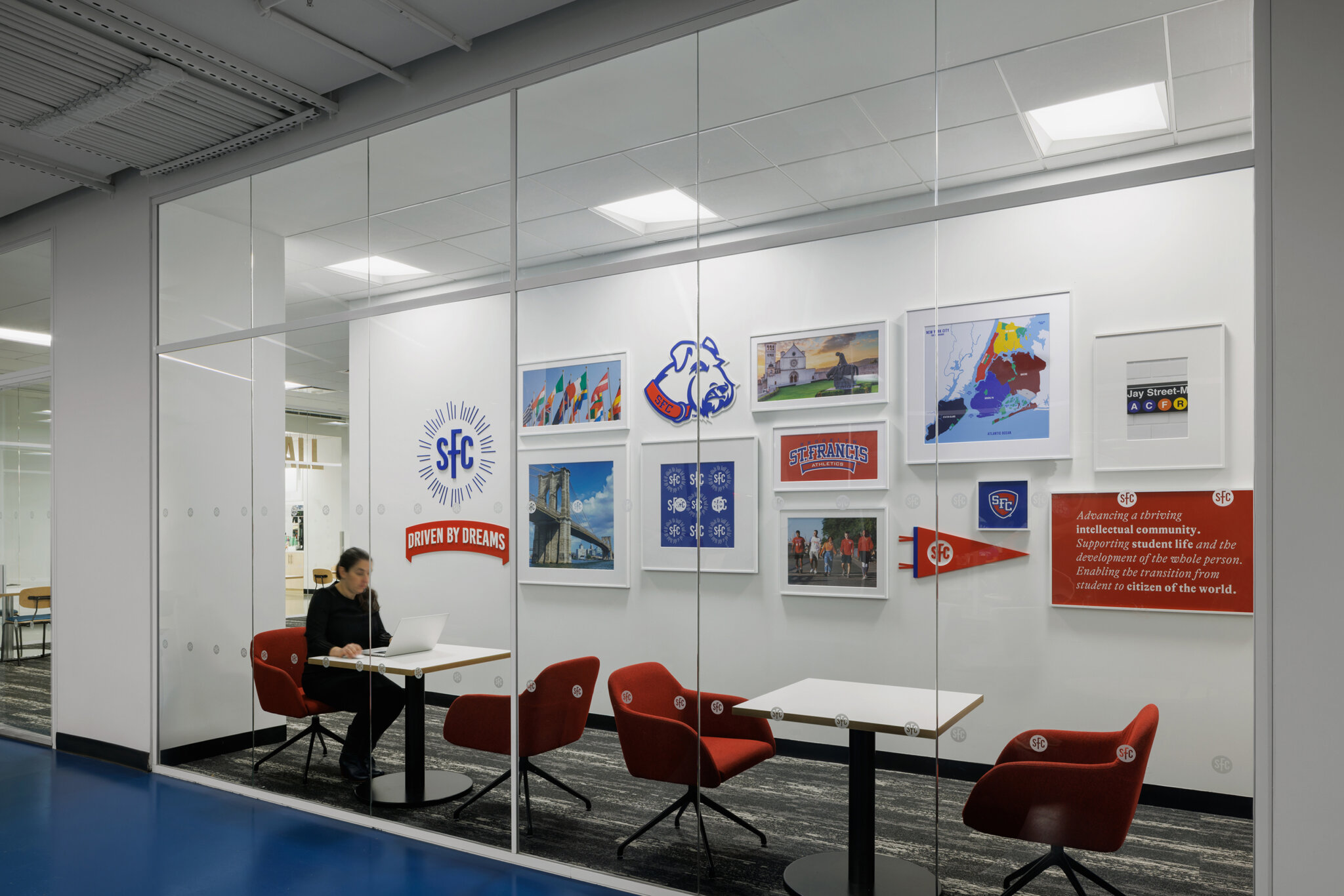 Clean blocks of color continue throughout the space, in the form of school banners that greet visitors in the entryway, a gallery wall of St Francis College memorabilia in white frames, and laser- cut wayfinding signs with pops of St. Francis College blue.