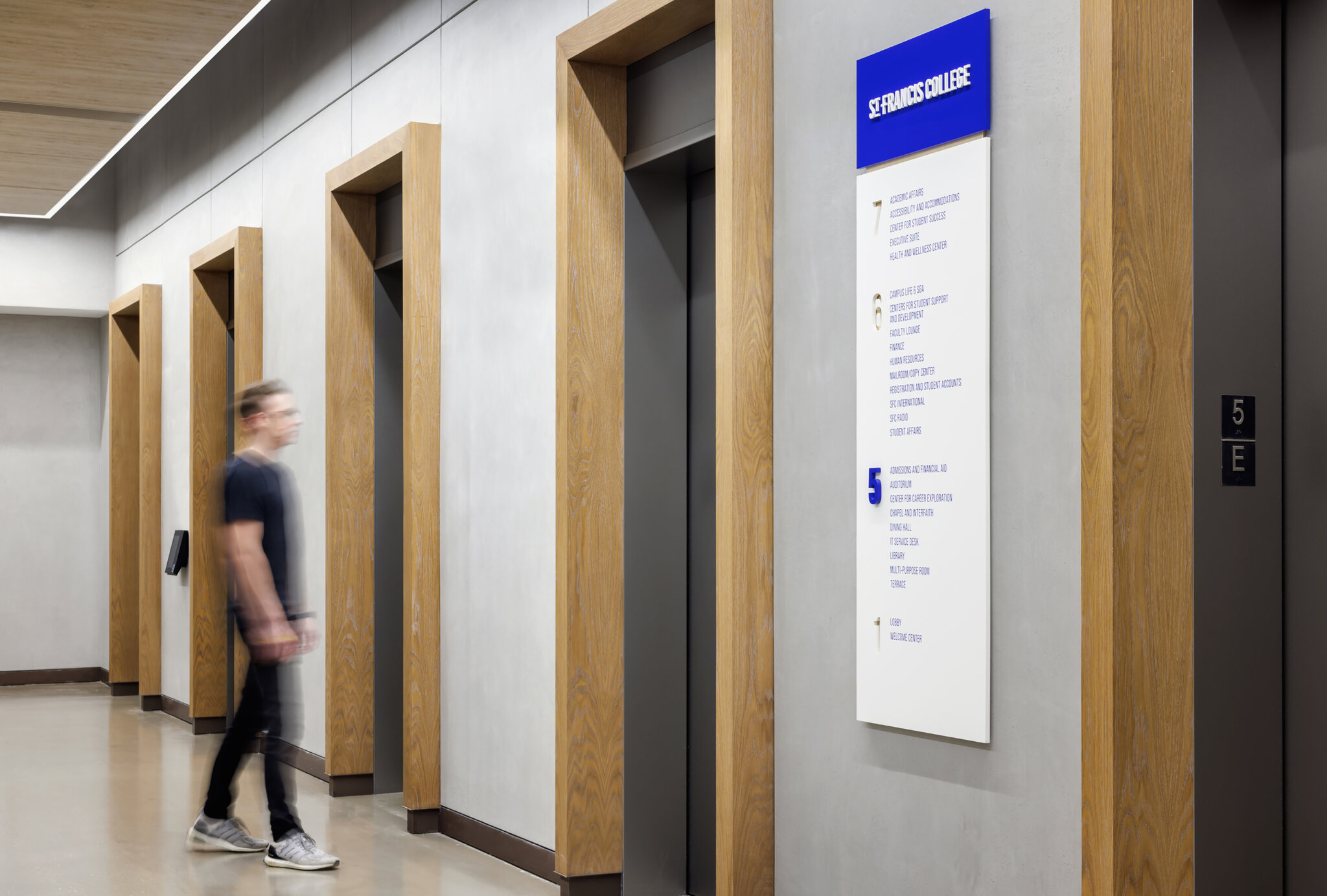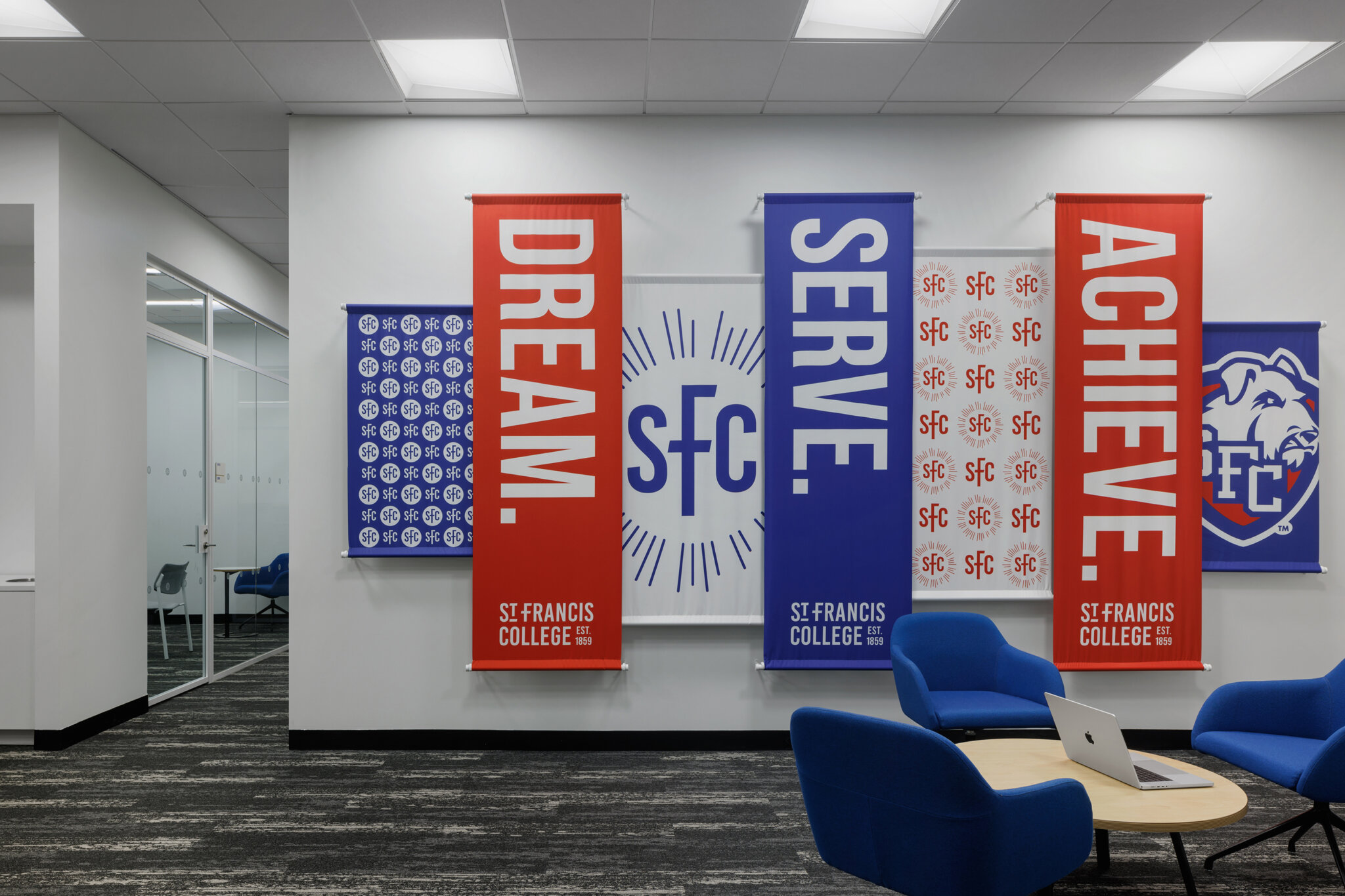 St. Francis College commissioned the design team to create environmental graphics, signage, and wayfinding for their new campus in downtown Brooklyn. Successful experiential design would pay homage to the college’s origins, ease the students, faculty and employees into their new home away from home, and incorporate a momentous rebranding strategy.