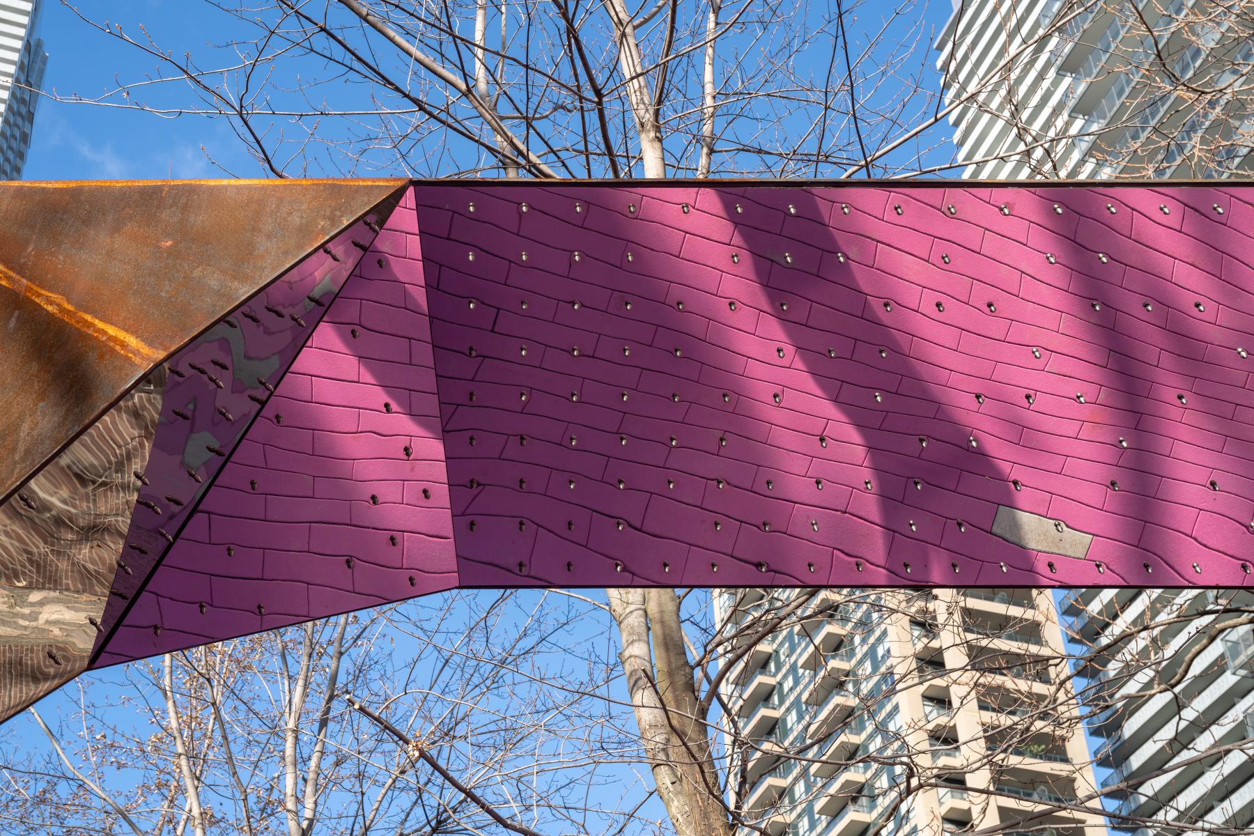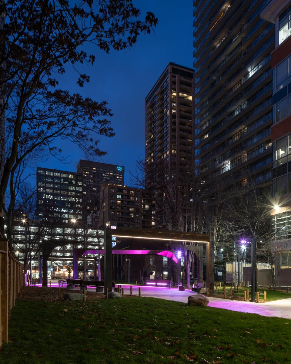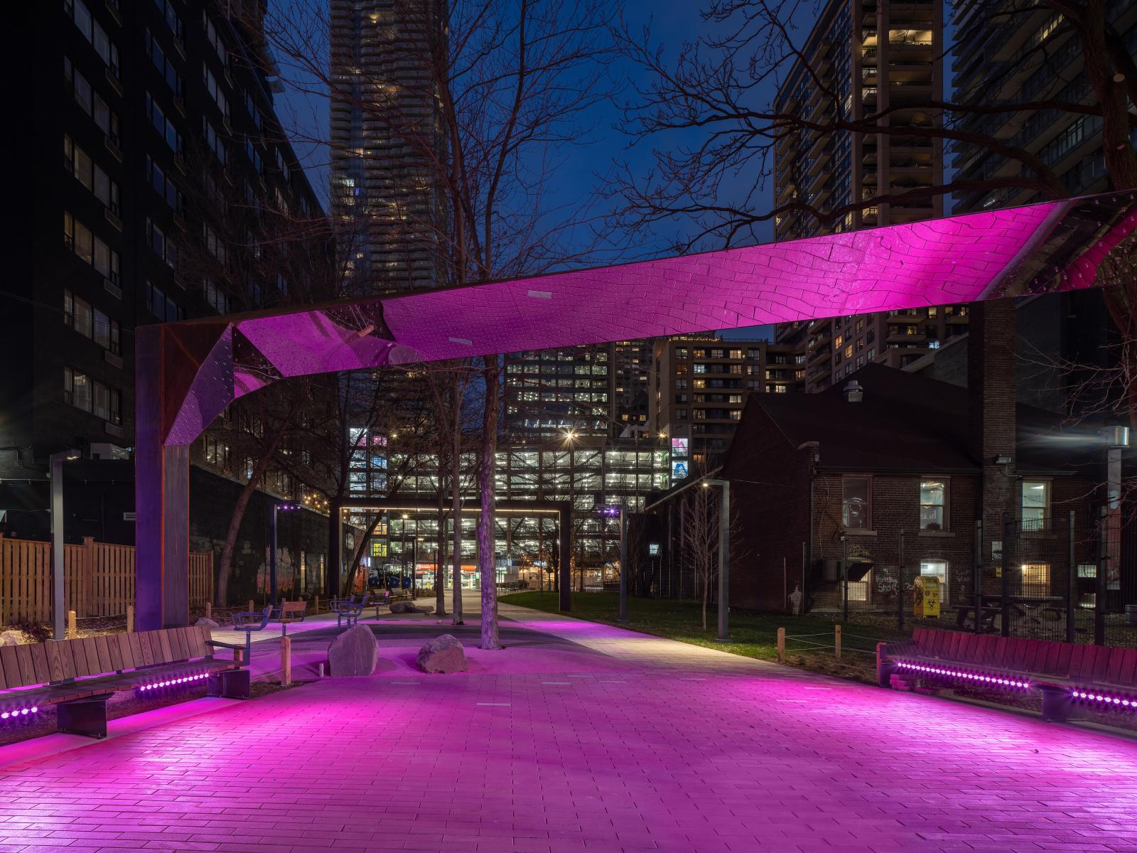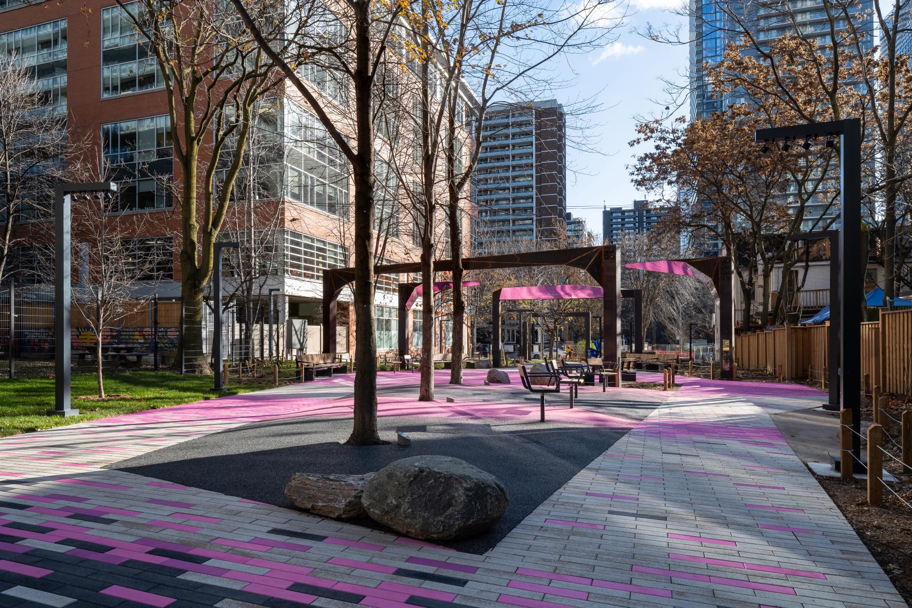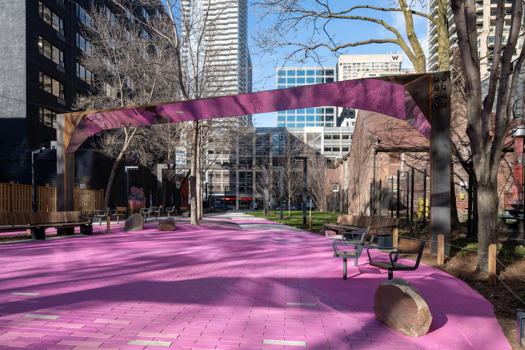 The project originated with a call from the City of Toronto to include a self-identifying 2SLGBTQ+ artist/designer to be included on the Consultant team for the redevelopment of a series of linear parks that run above the subway line adjacent to Yonge Street. The project location was identified to be within George Hislop Park with the intention to commemorate and celebrate the City’s 2SLGBTQ+ history, leadership, excellence and resiliency. The park is located within the city’s largest 2SLGBTQ+ neighbourhood, Church-Wellesley Village and named after the influential gay rights activist and one of the first openly gay candidates for Toronto City Council and the Ontario Provincial Legislature. The project took great effort to broaden references to address the various perspectives, histories, and positions contained with the 2SLGBTQ+ collective identities.