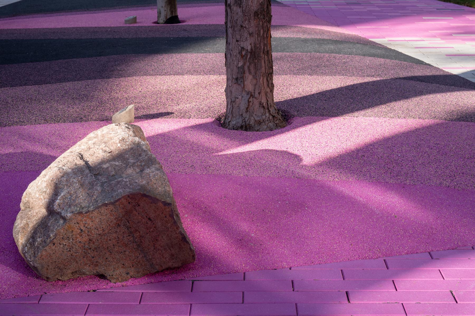 Intentionally avoiding a token sculptural element added into the park, that could as easily be removed, the Dance exists of the material fabric of the park itself. It is the park, but distinct; simultaneously holding the same and separate ground. Individual materials present differently creating new relationships suggesting an ephemeral counter space within the landscape. Colour distinct pavers and aggregate ground cover, cut and polished granite boulders, steel arches that flare open with exposed reflective bodies, and shifting coloured lighting are the manipulated materials that behave independently and communally to evoke a three-dimensional environment of the Dance.