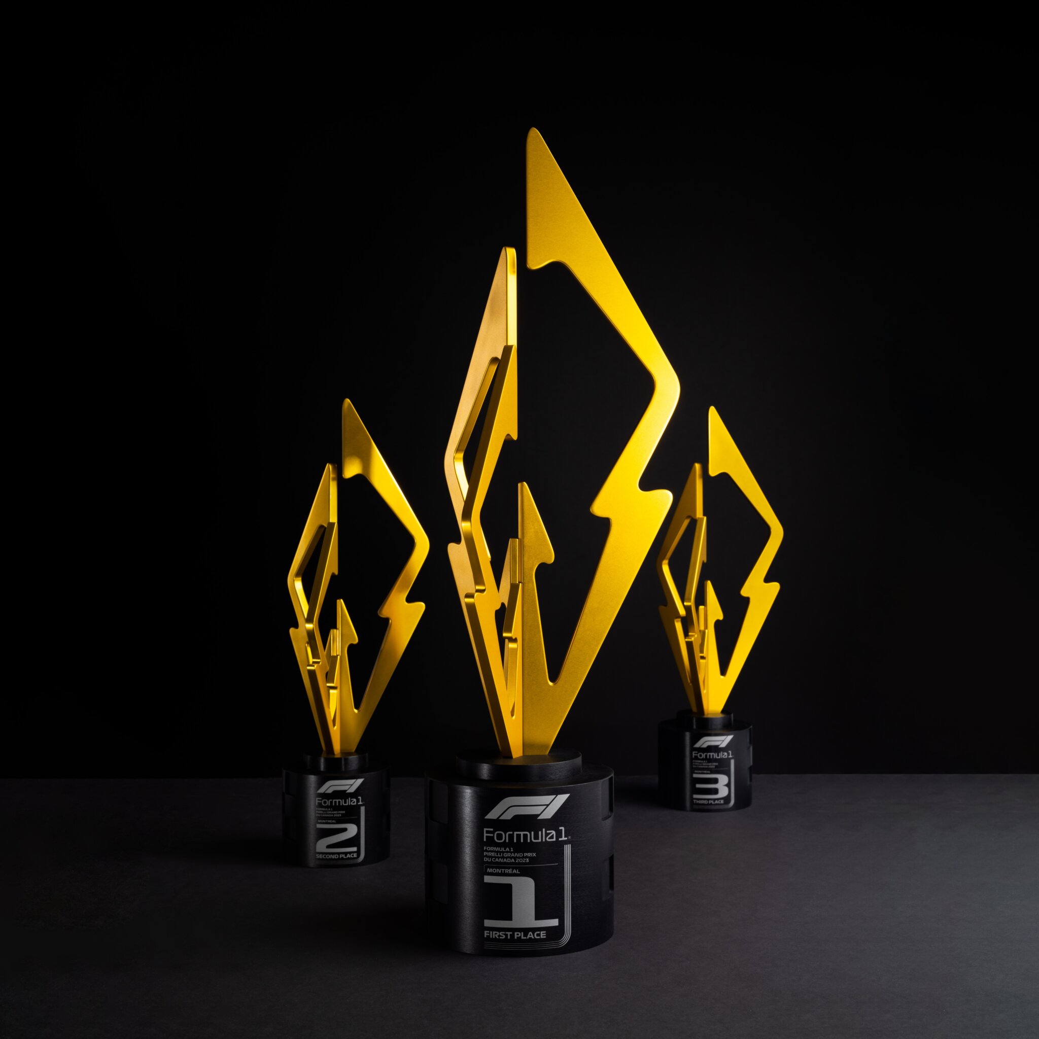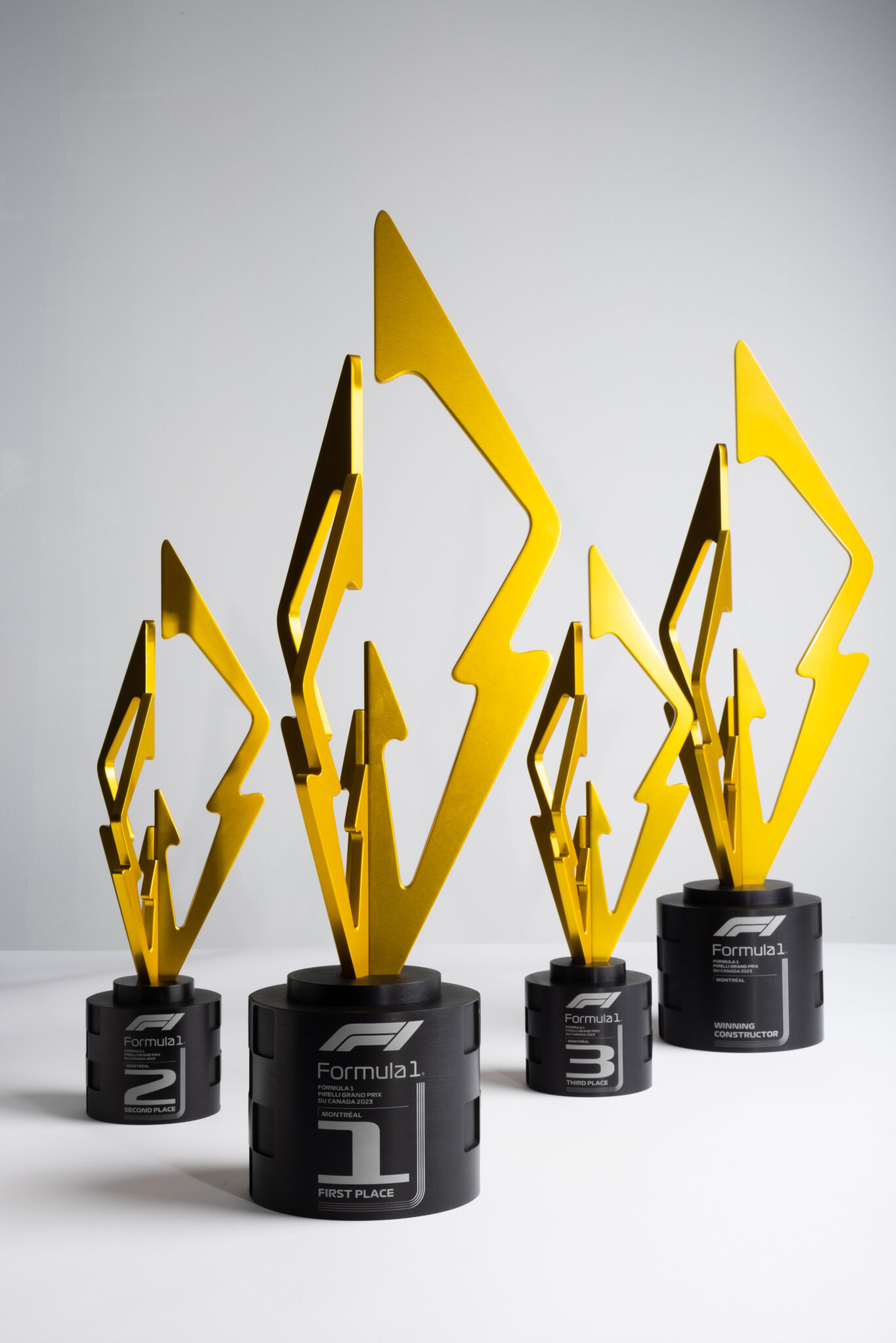 Made from solid Quebec aluminum, machined then anodized in black, the base of the trophy features the official F1 identification and discreetly presents the shape of the chequered flag. Still in aluminum, the trophy is anodized in a reflective gold color, whose smooth, shiny, luminous surfaces reflect passion. Like a flame that rises and points to the sky, this trophy celebrates the determination of whoever takes the top step of the podium.