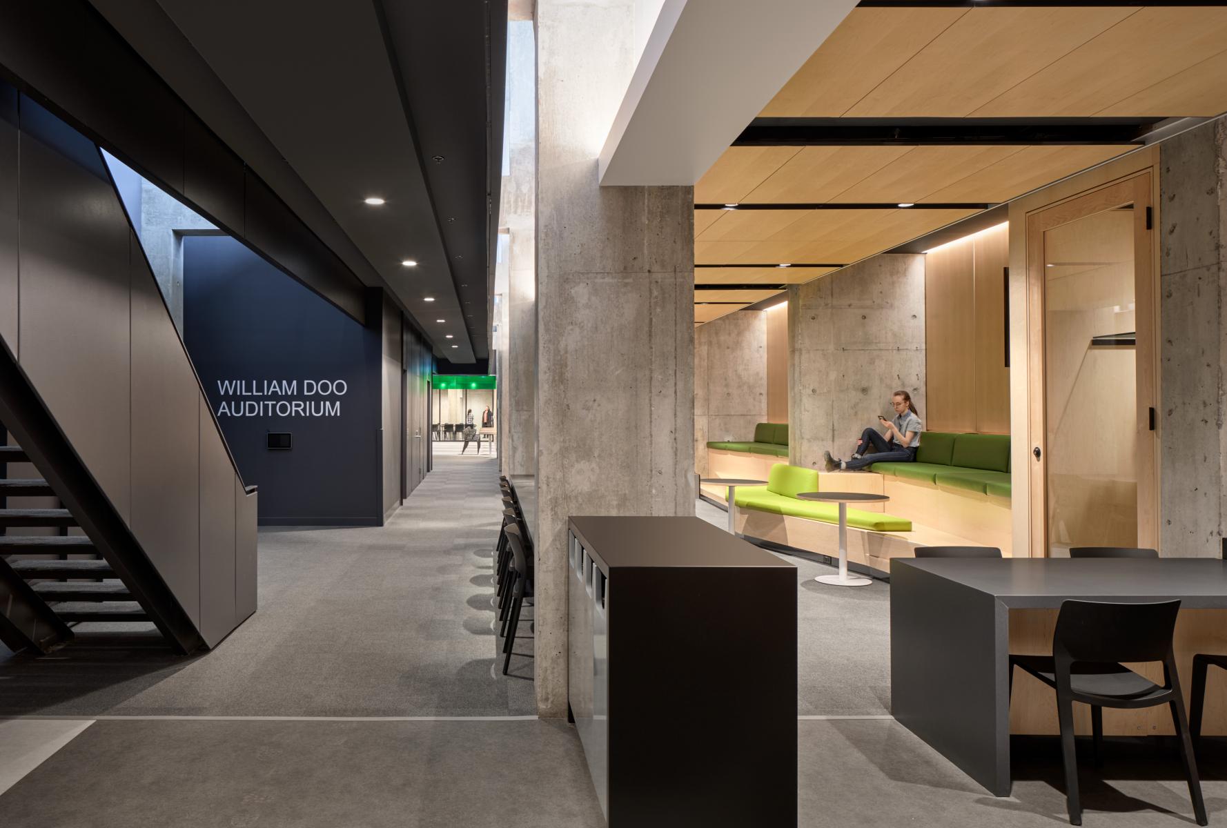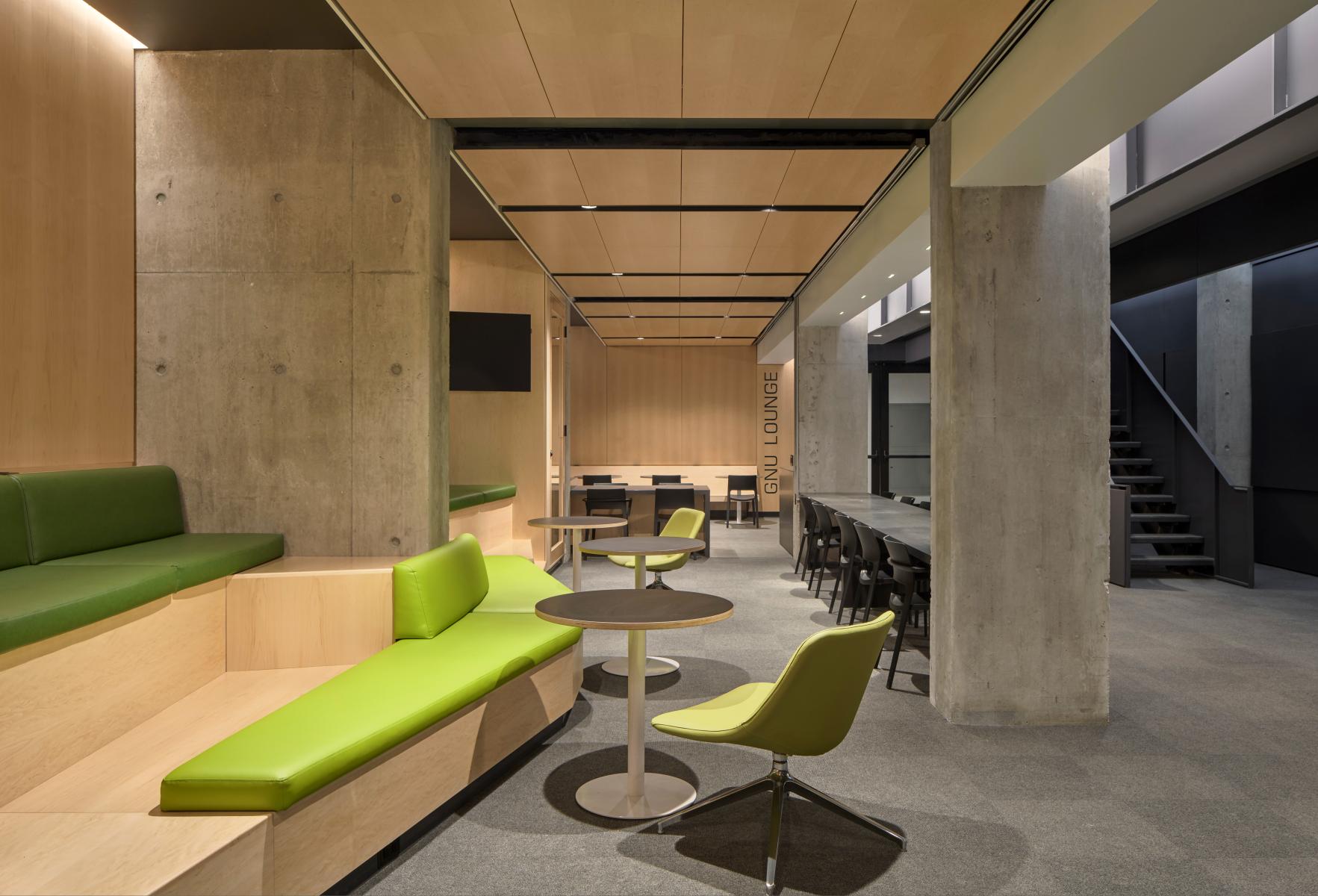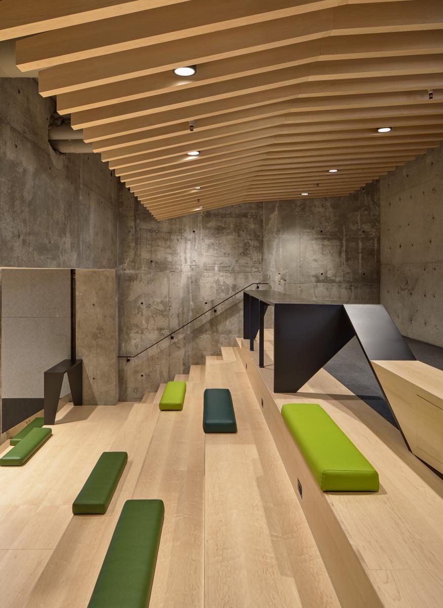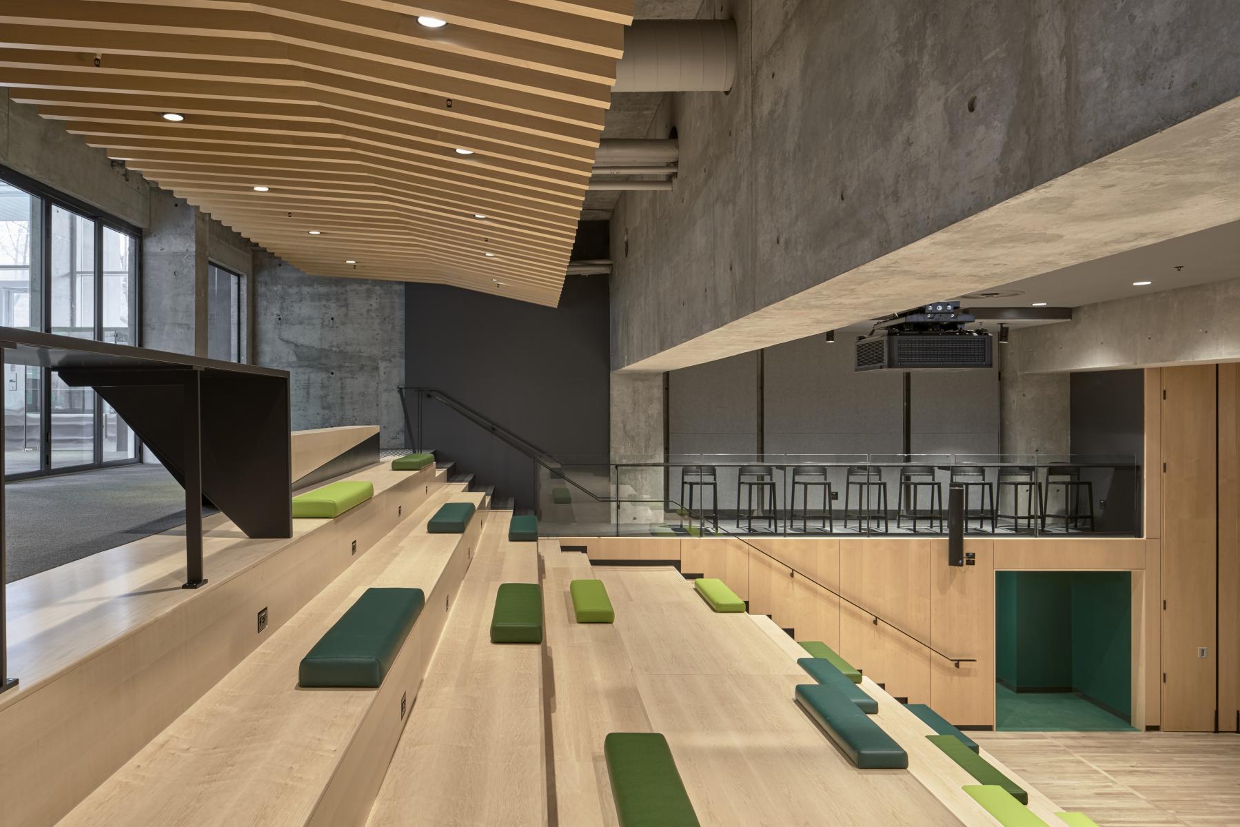 The design team approached the public spaces as a spatial and cultural threshold—an interface between academic programming and student life. Storage rooms and residual spaces were reclaimed to create generous gathering areas, including a lower-level lounge enclosed from a former exterior void. The bleacher stair creates a visual and physical connector across levels, while supporting large events and informal daily use.