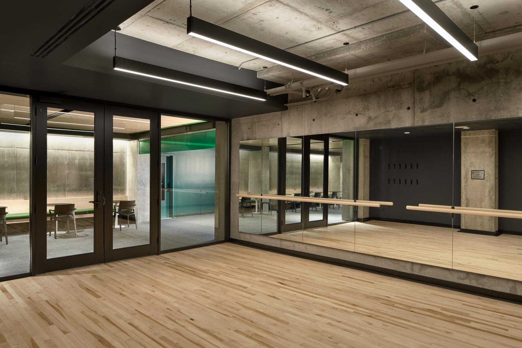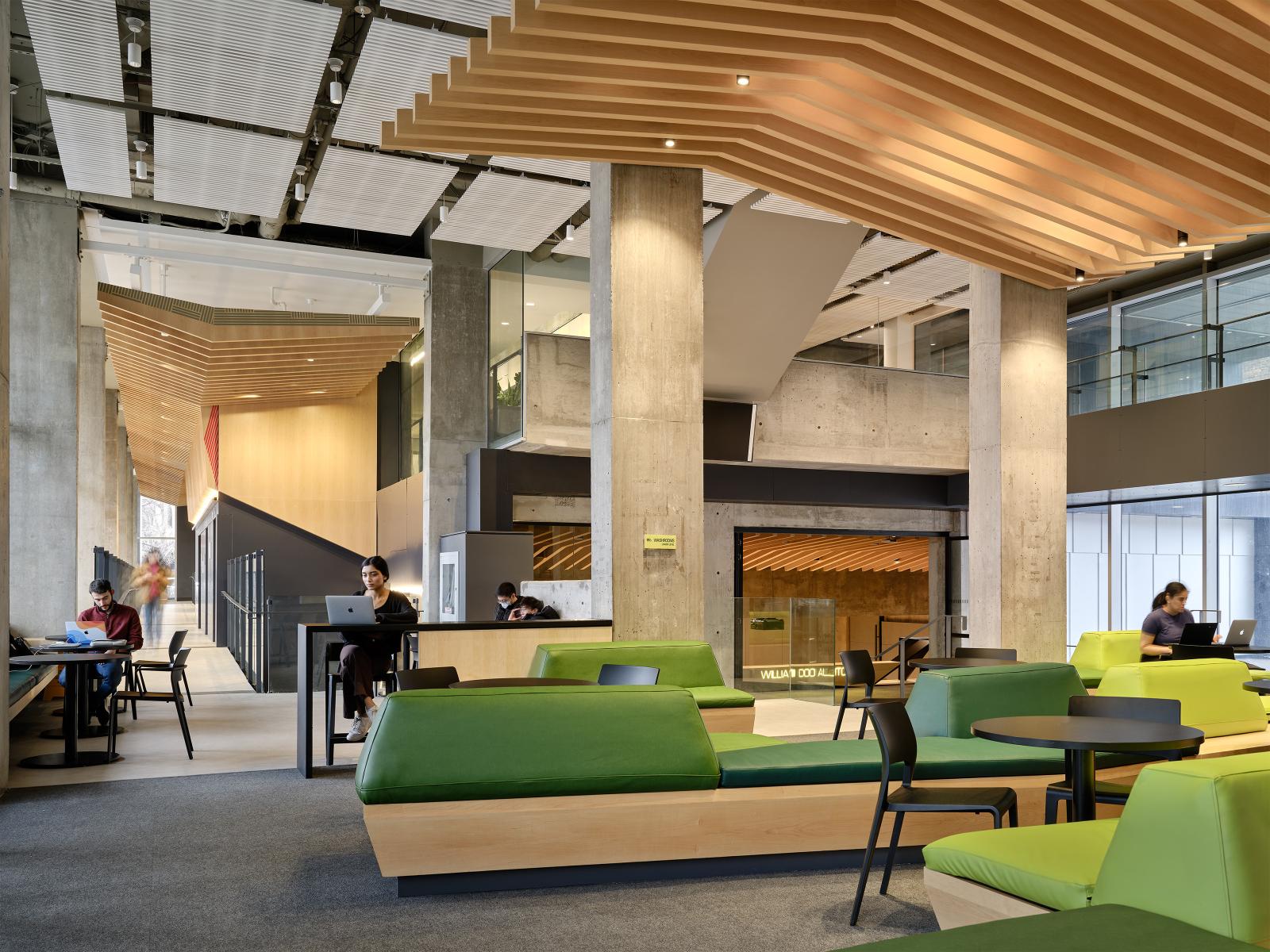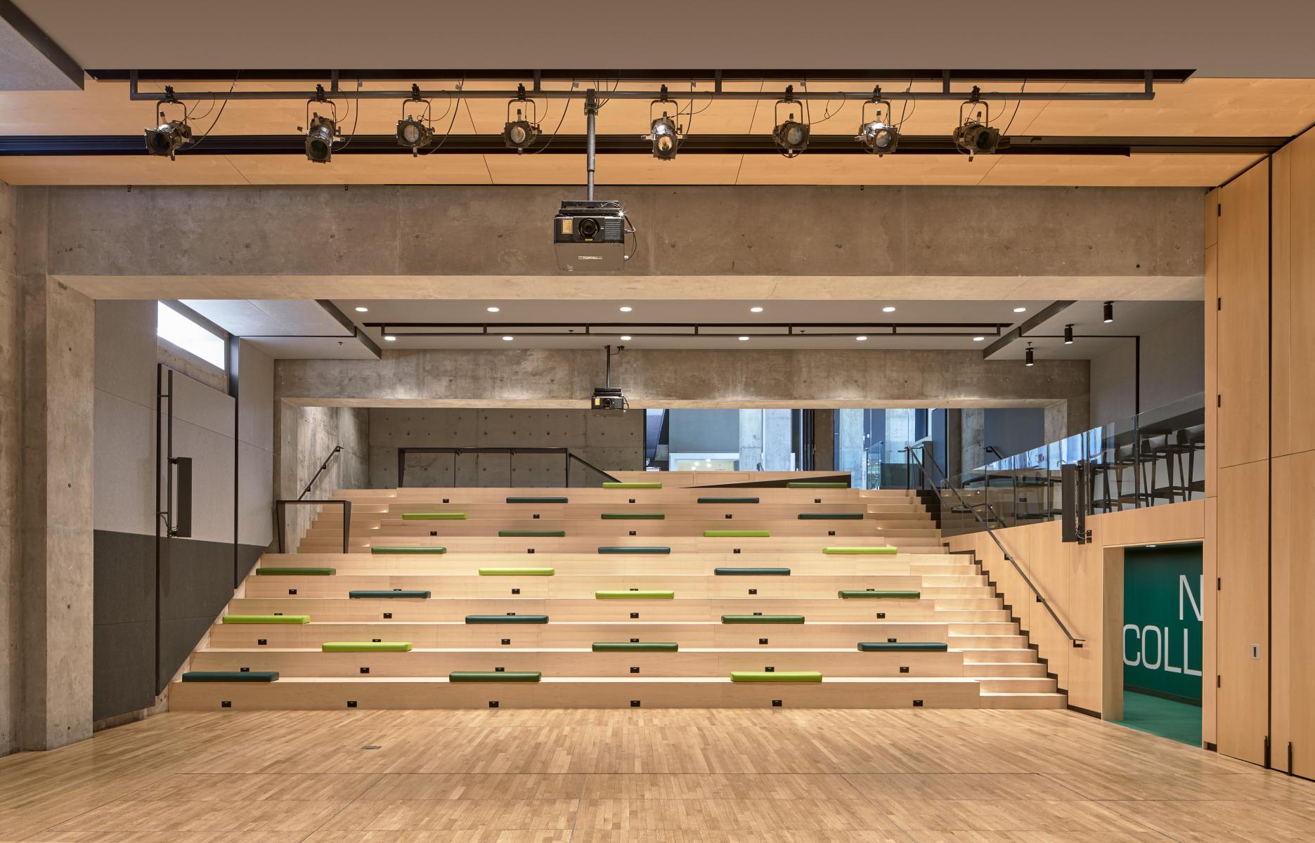 The design team approached the public spaces as a spatial and cultural threshold—an interface between academic programming and student life. Storage rooms and residual spaces were reclaimed to create generous gathering areas, including a lower-level lounge enclosed from a former exterior void. The bleacher stair creates a visual and physical connector across levels, while supporting large events and informal daily use.