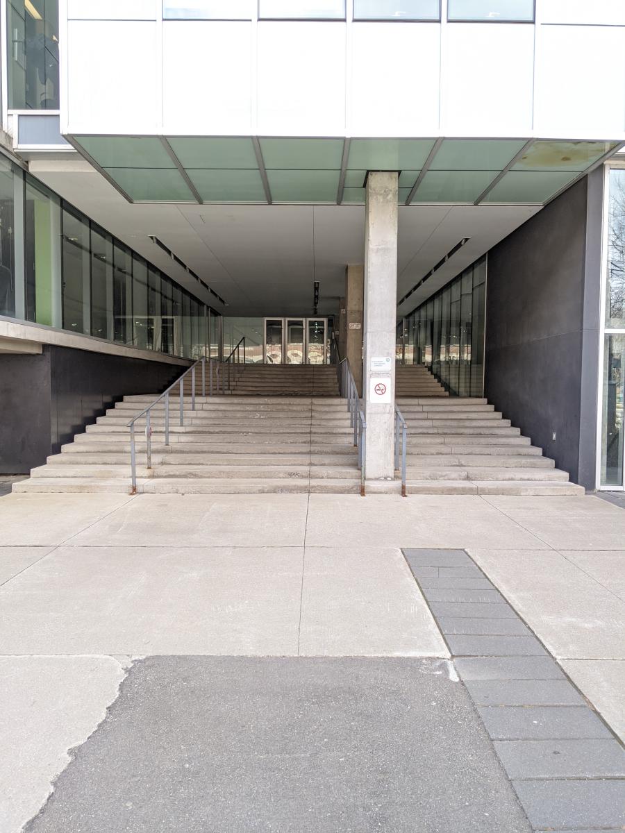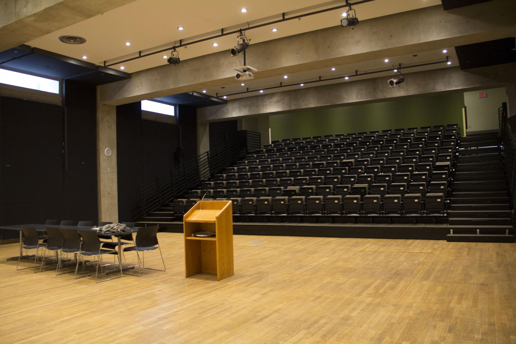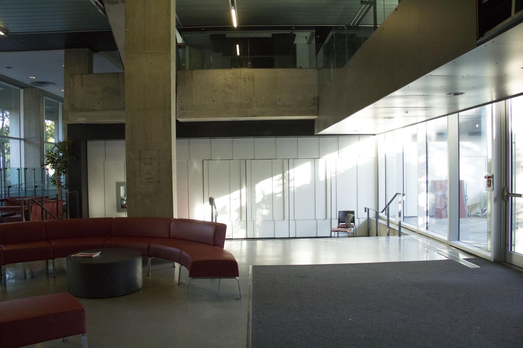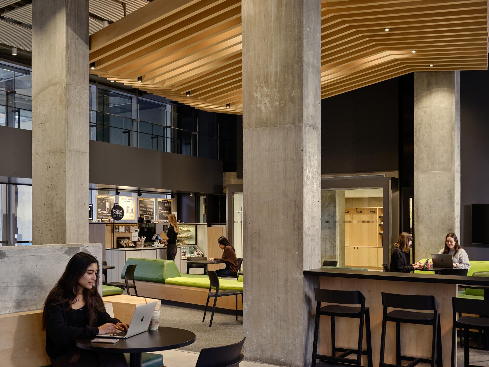 The design team approached the public spaces as a spatial and cultural threshold—an interface between academic programming and student life. Storage rooms and residual spaces were reclaimed to create generous gathering areas, including a lower-level lounge enclosed from a former exterior void. The bleacher stair creates a visual and physical connector across levels, while supporting large events and informal daily use.
