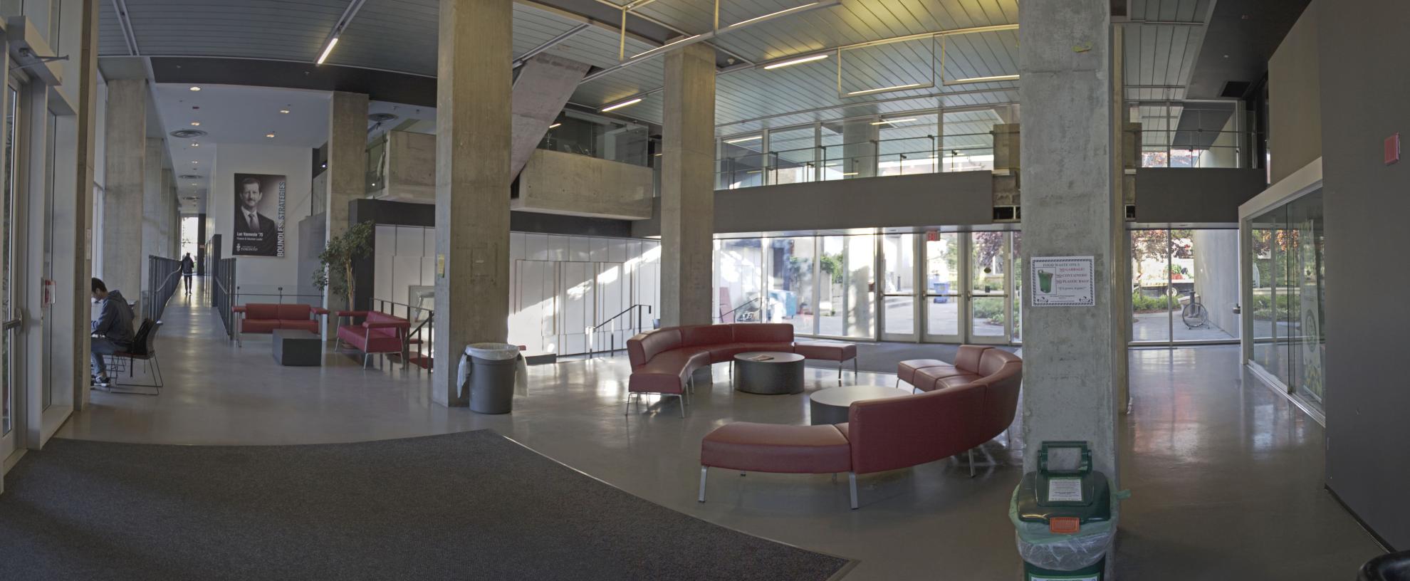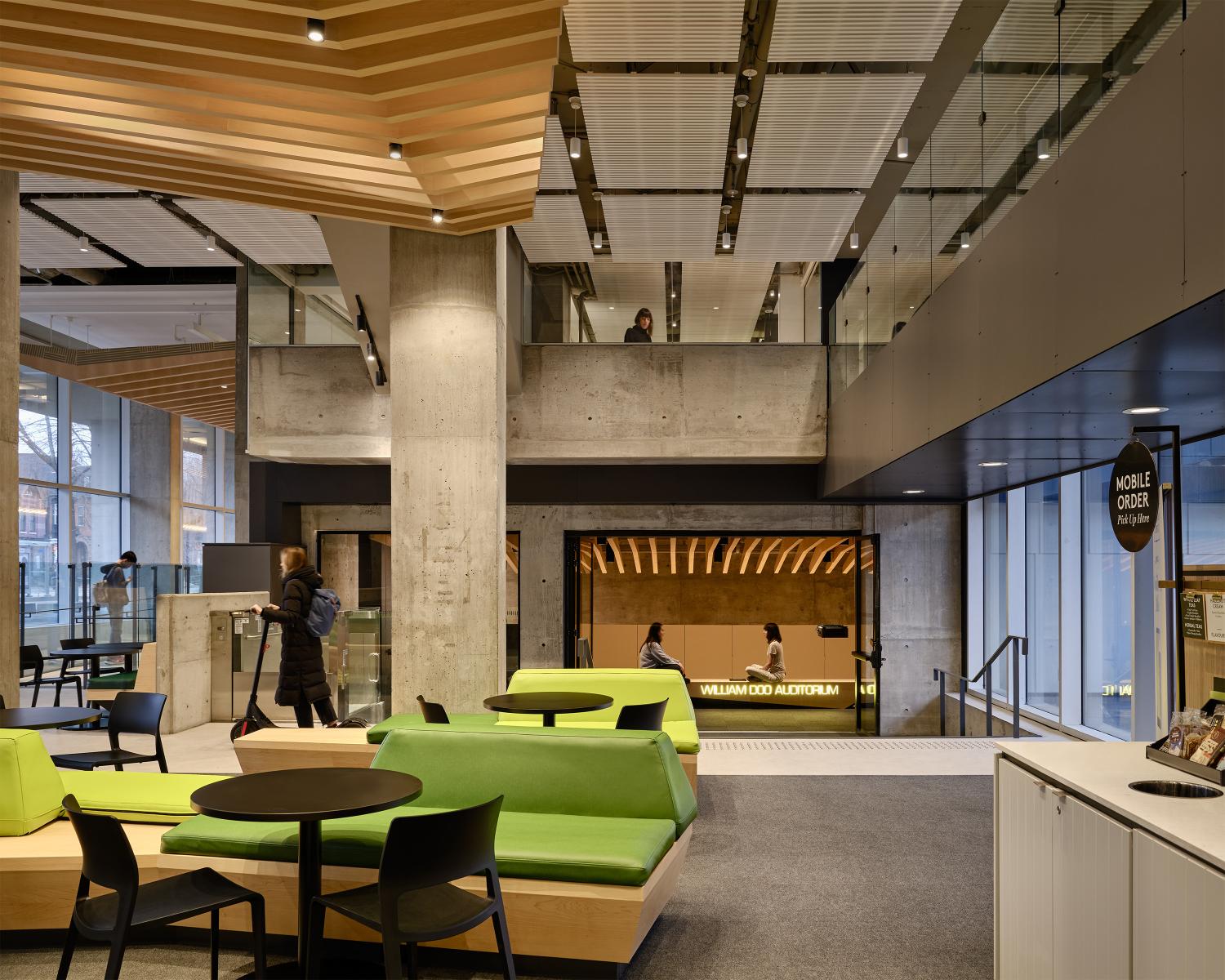 The scope includes a diverse program: a new auditorium with a central movable partition and bleacher stair; commuter and resident lounges; music and dance studios; student council headquarters; a Second Cup café; new washrooms; branding and signage elements; and fully reconfigured entrances at both the street and interior quad. Previously disjointed and disconnected, these spaces are now organized around new social anchors, intuitive circulation, and warm, layered materiality that contrasts and complements the original architectural language.