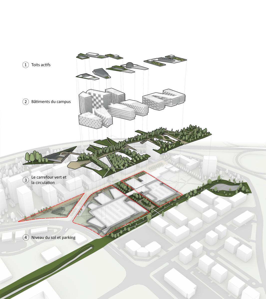 The campus project spans 3 adjacent blocks, situated within a sector bounded by Montée des Pionniers, Chemin de la Croisée, Coulée Verte, and the Ruisseau de Feu linear park. The new buildings are positioned around a vast, continuous pedestrian realm, acting as an elevated linear park dedicated to pedestrians — the University Promenade — which covers elevated parking levels and connects the pavilions. Mindful of street animation, the complex features street-front shops and public facilities at streetside. This innovative design eliminates the need for underground parking on a rocky site with a high-water table, while maximizing pedestrian space.