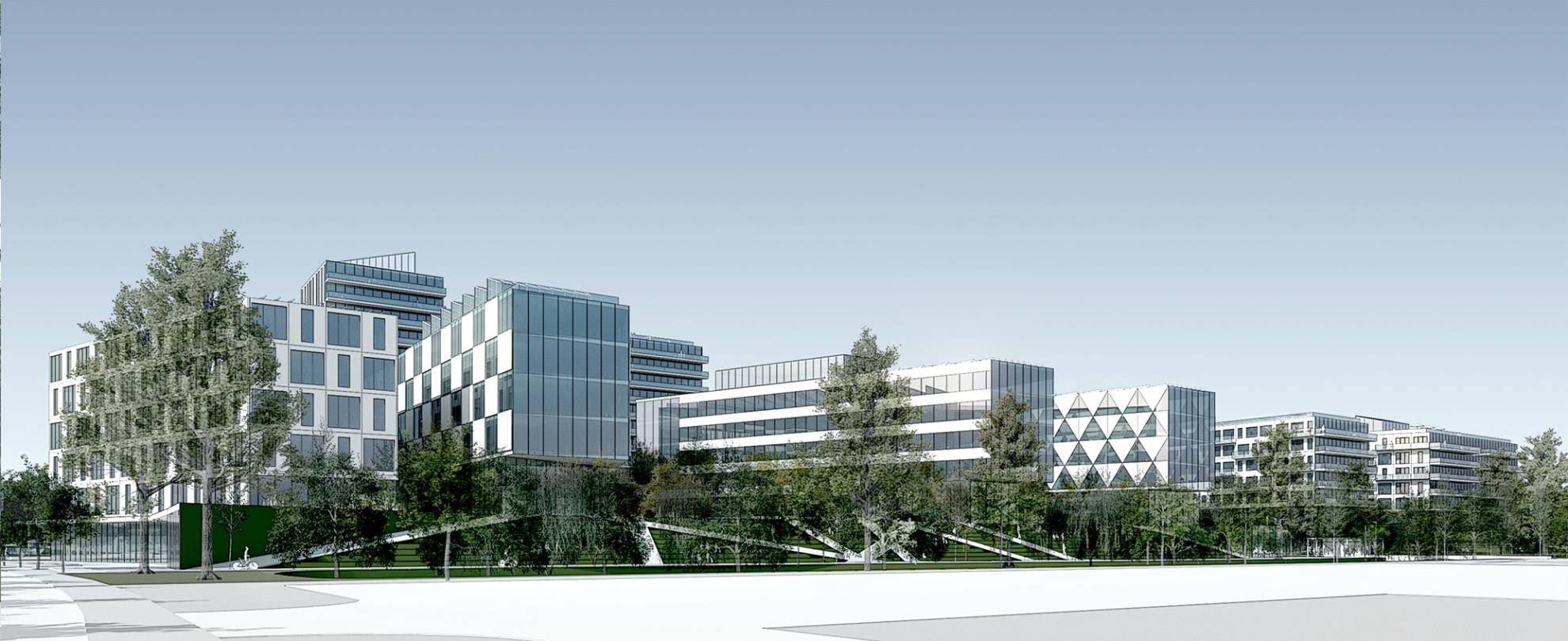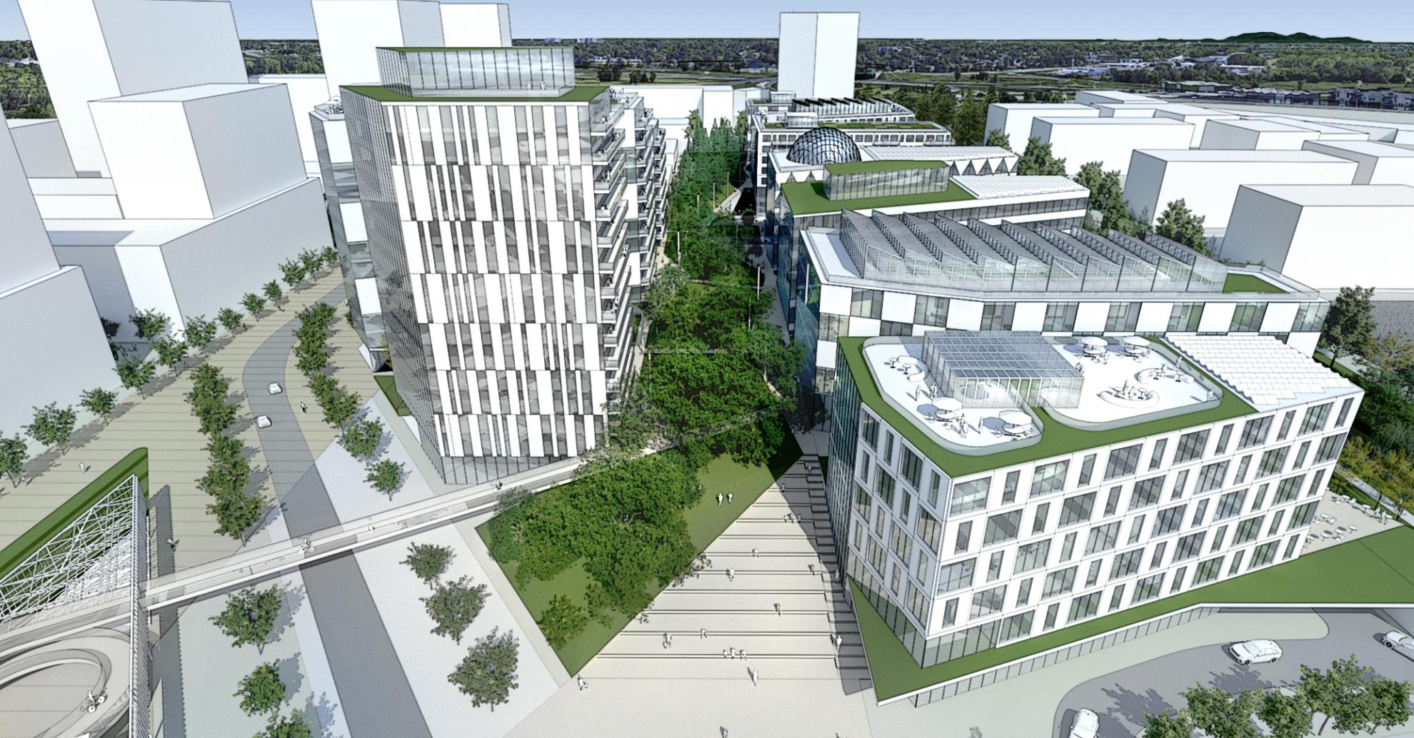 The university component is envisioned as 4 six-story pavilions along the University Promenade, arranged in "spurs" to open views and maximize sunlight. The tallest buildings align with the residential towers to the north. The sports and cultural facilities are grouped together to create a civic hub. The three sites are connected by a continuous pedestrian realm. The eastern block includes a swimming pool and gymnasium, along with the student residences.